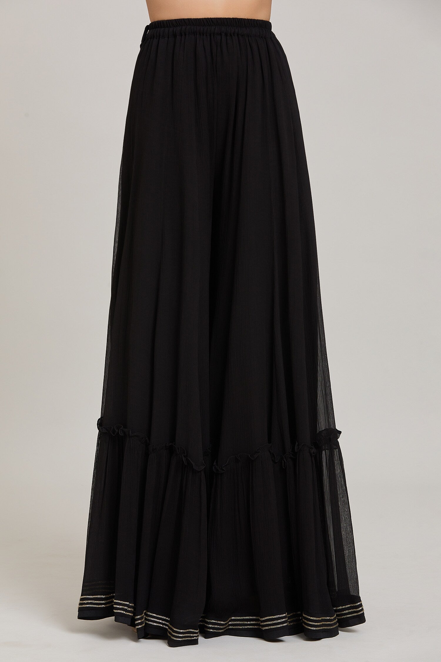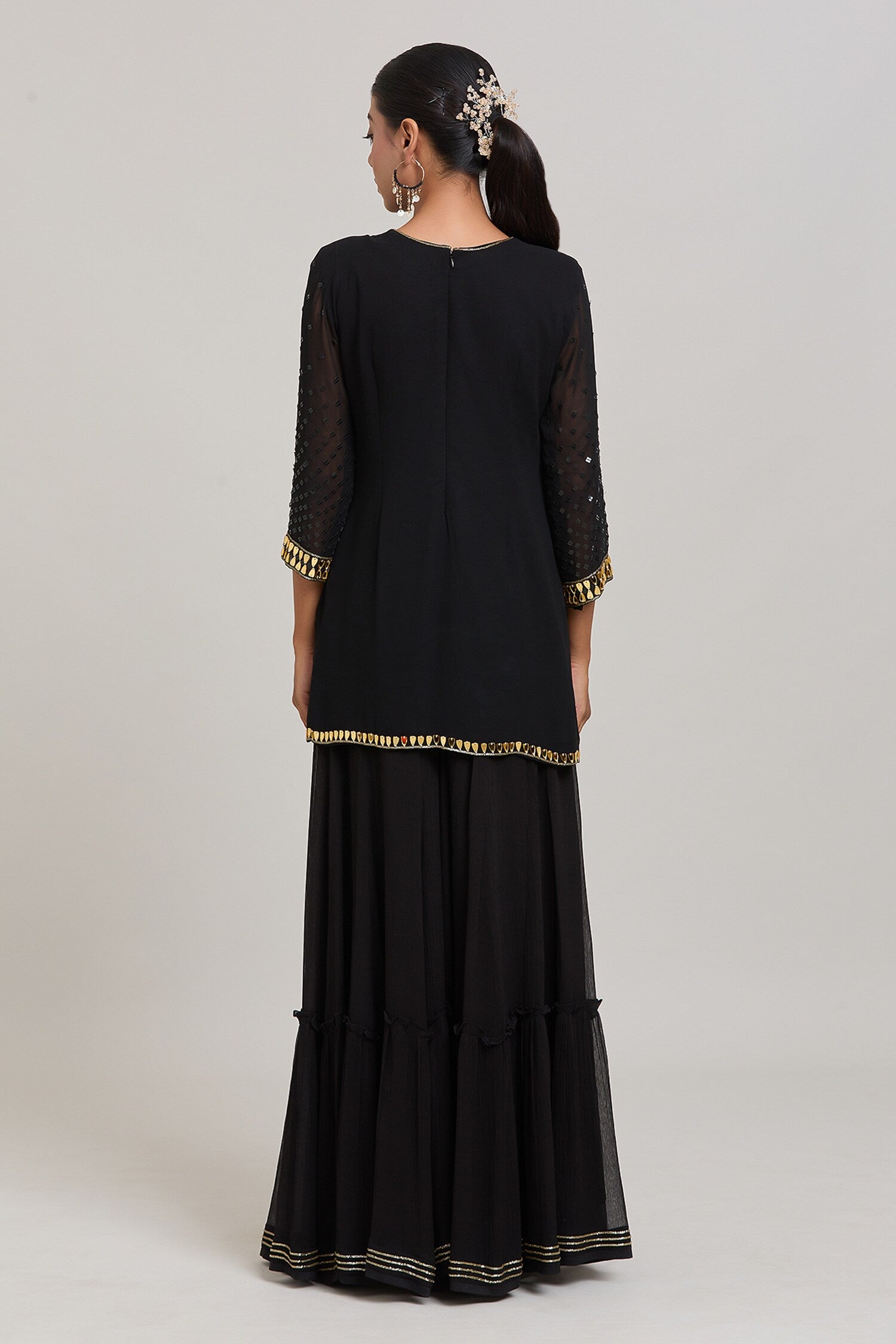 Black & gold acrylic embroidered kurta with cutdana work ruffle sharara and dupatta