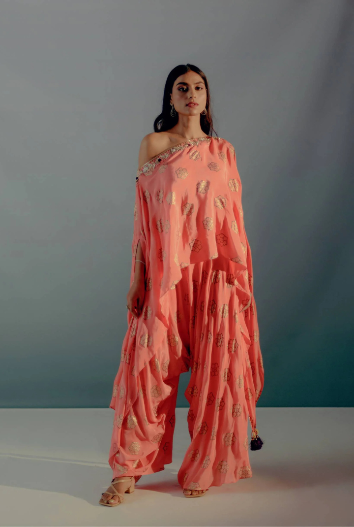 Coral off shoulder asymmetrical top with foil print & zardosi embroidery. This set is paired with foil printed drape pants.