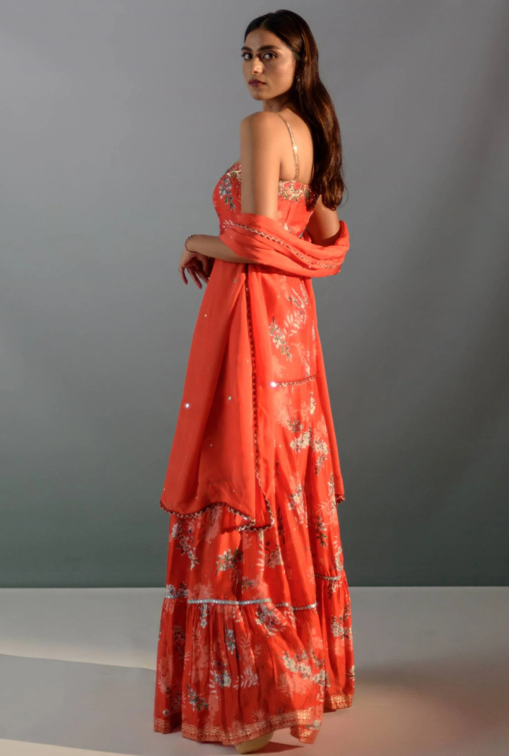 Scarlet red floral sharara set with all over sequin highlights. This set features a strappy kurta, hand embroidered using zardosi work and is paried with a mirror & sequin embroidered dupatta