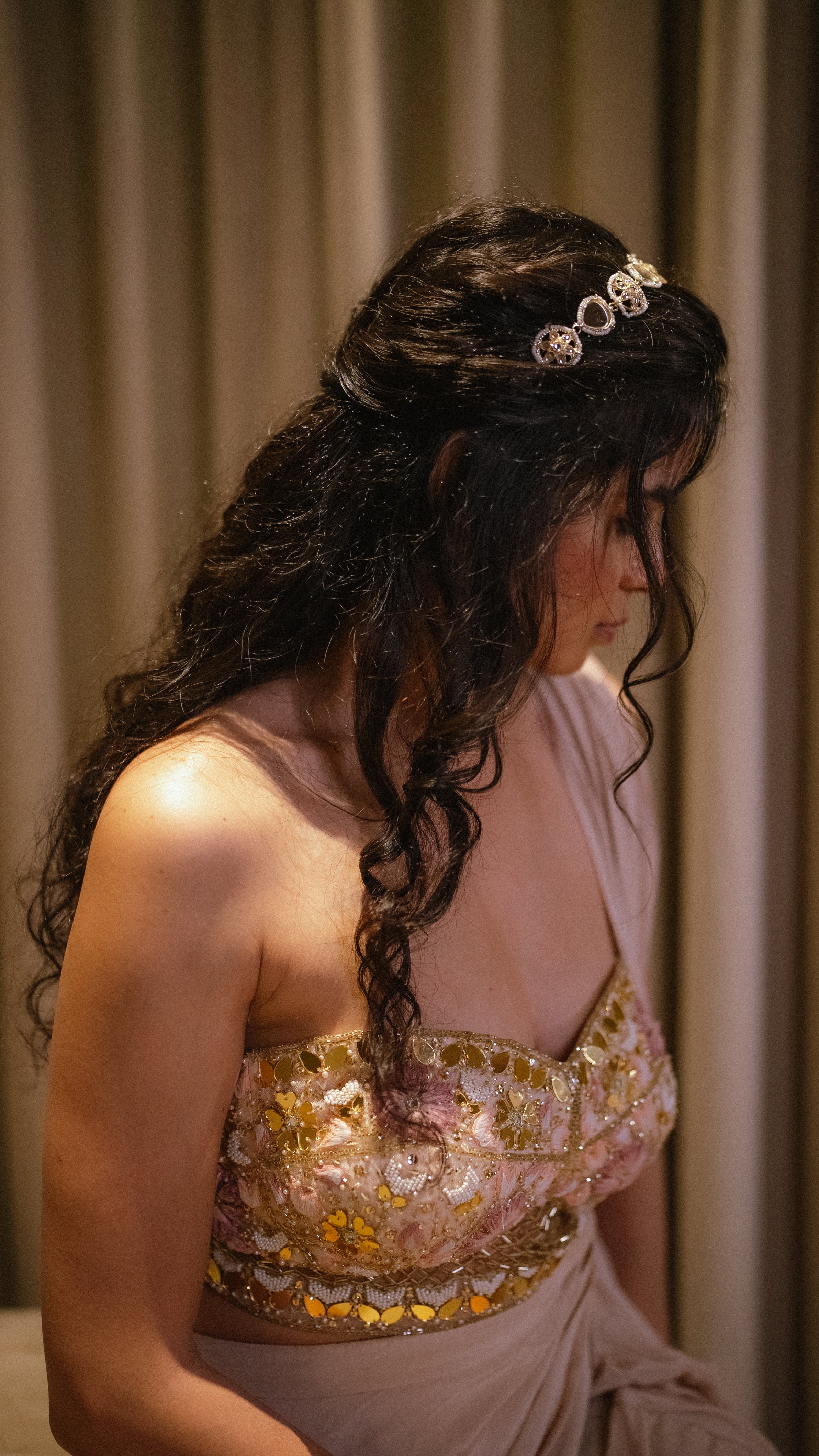 Nude pre-stitched Saree with thread & acrylic embroidery and mesh detailing on the bustier blouse