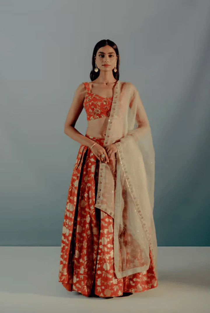 Rust benerasi silk pleated lehenga set with zardosi embroidered organza dupatta & blouse