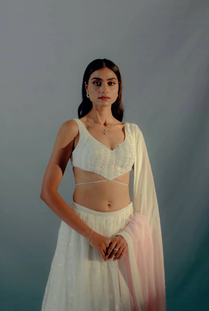 White to baby pink ombre lehenga set with floral sequin, pearl & cutdana embroidery. The blouse features delicate floral hand embroidery with a waist tie up detail. Set is paied with an ombre dupatta edged with a pearl embroidered border & sequin cheeta all over.