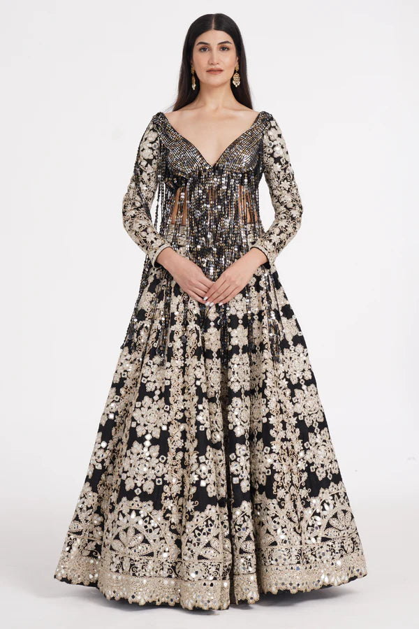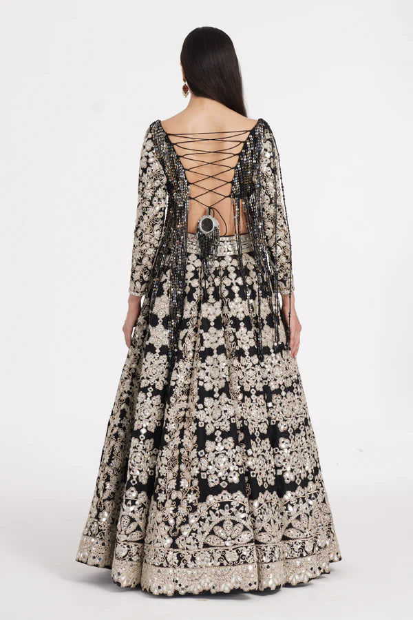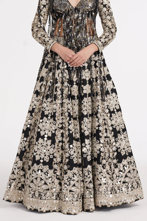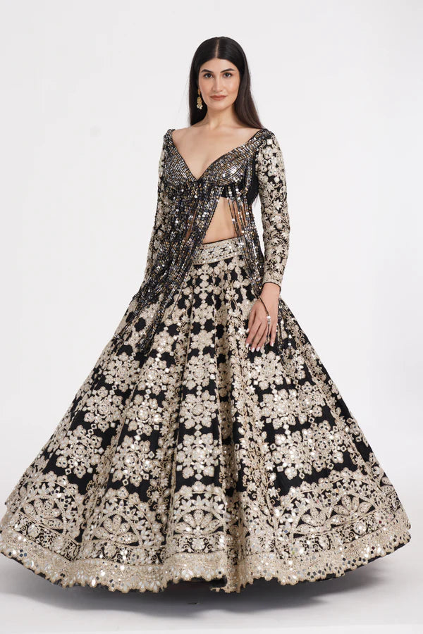 Jet black lehenga set embellished using ivory details