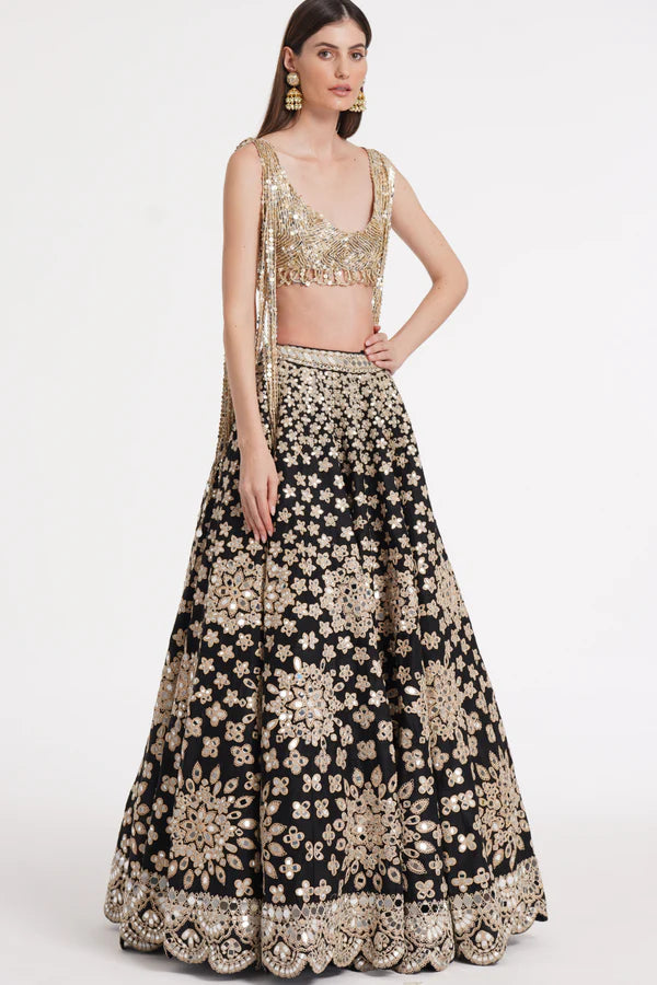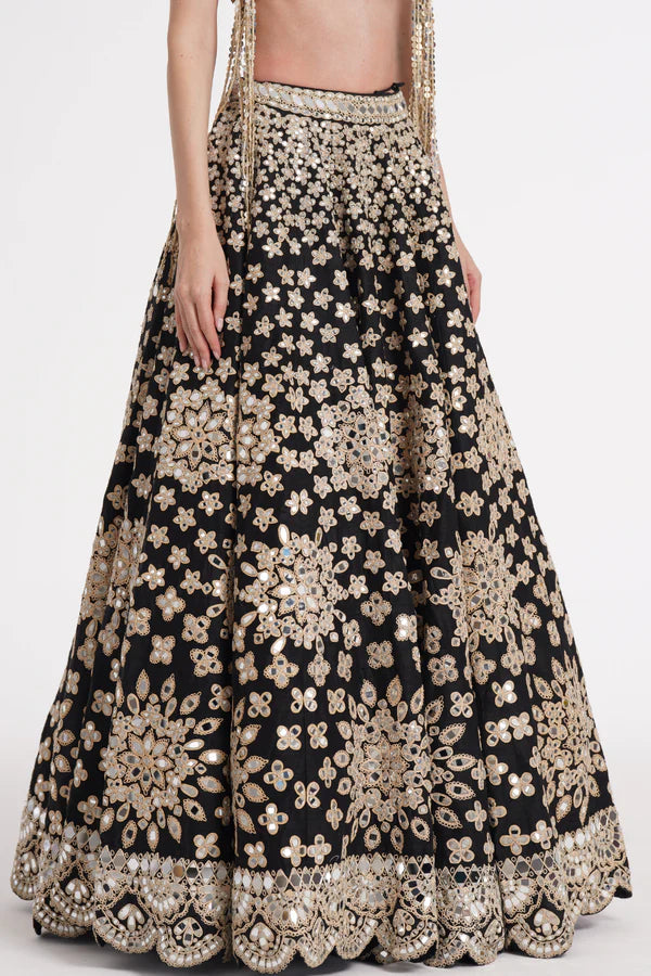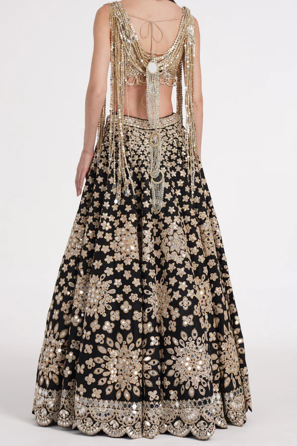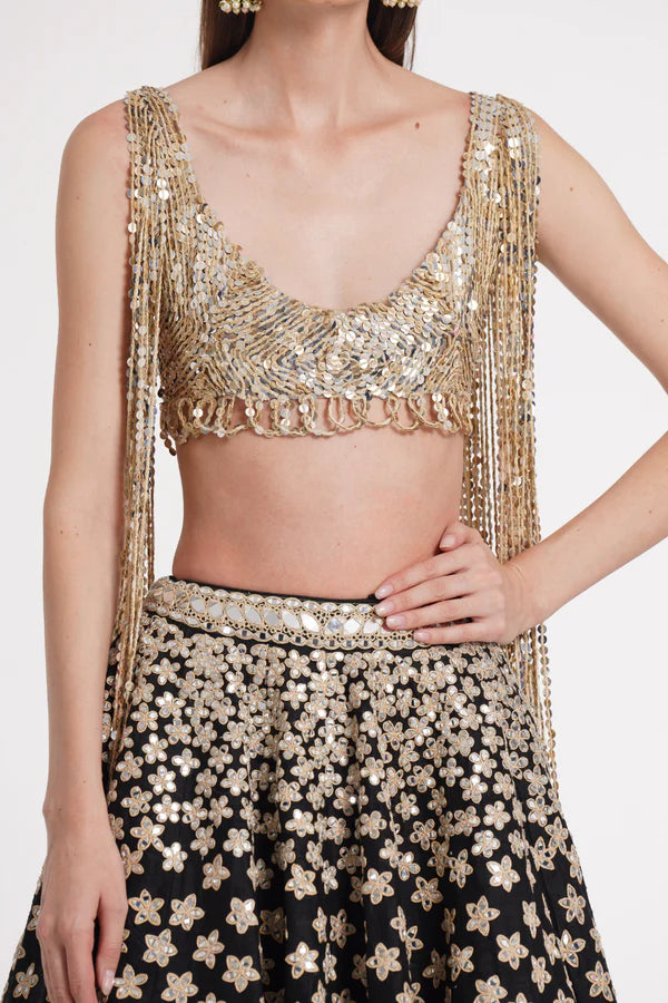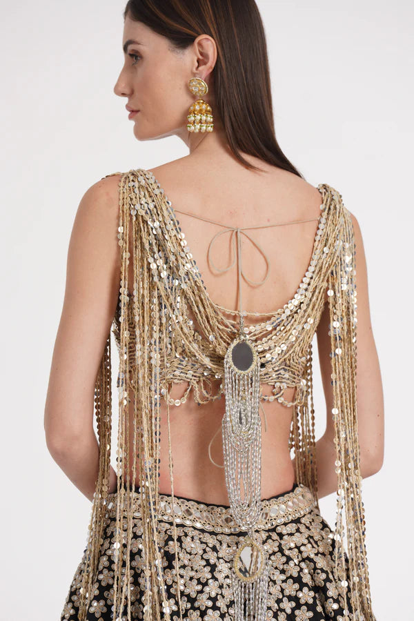 Matte black fringes blouse skirt set