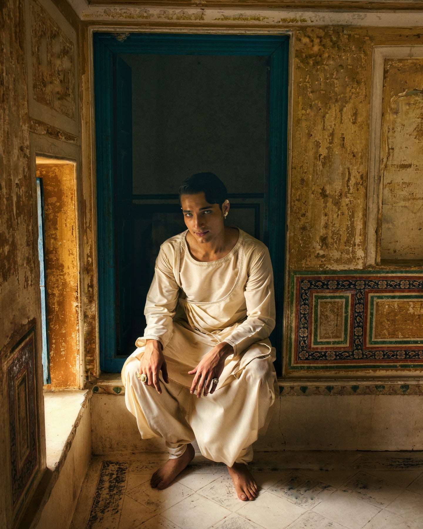 This beige Angrakha in pure cotton silk is adorned with delicate floral motifs, brought to life through intricate aari and dori embroidery. The full sleeves are finished with embroidered borders, while the front features a pleated panel in the traditional Angrakha style. Effortlessly paired with a classic dhoti featuring a waistband and zipper, the ensemble exudes graceful charm and understated elegance.
