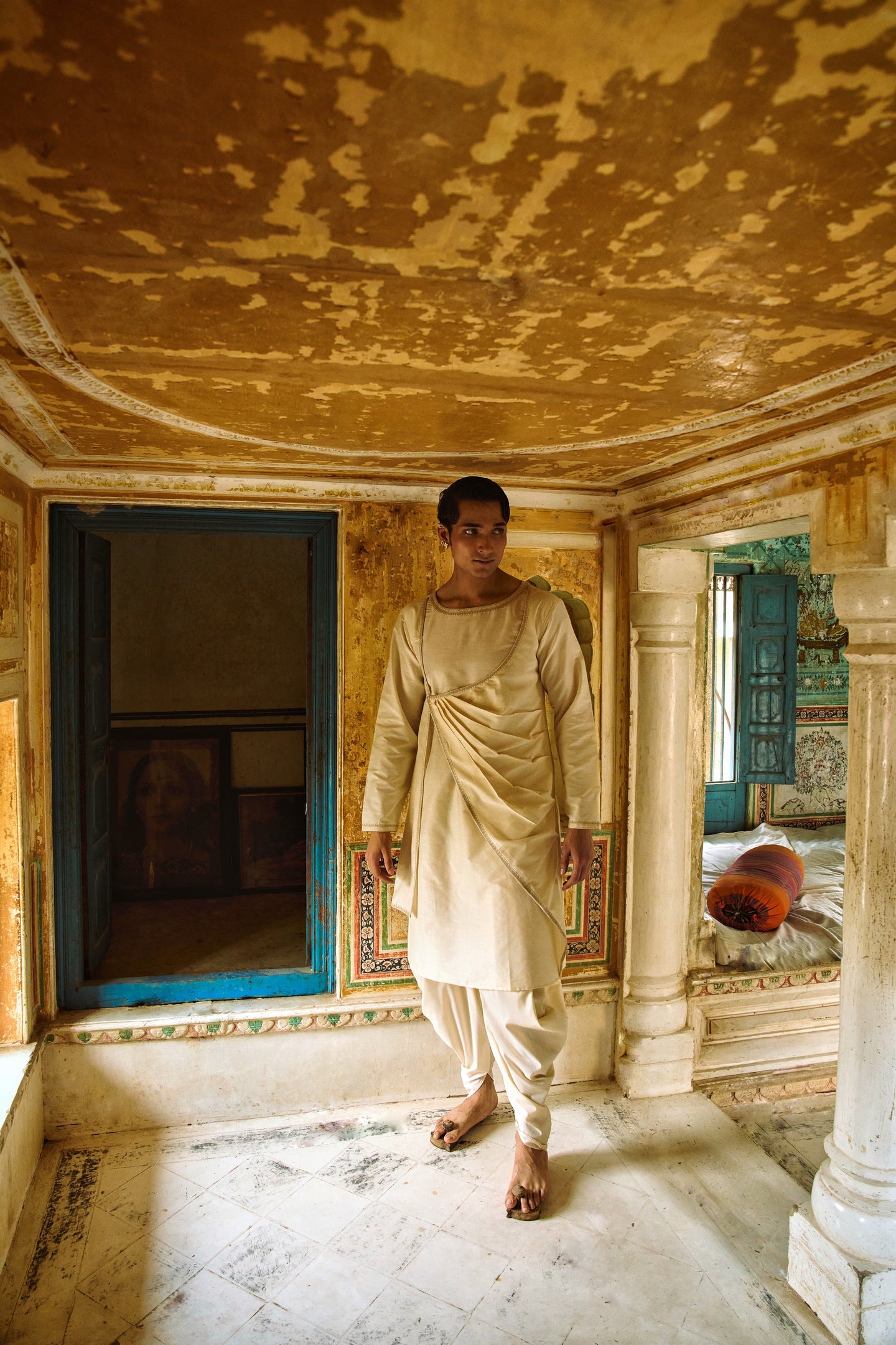 Beige cotton-silk angrakha with dhoti