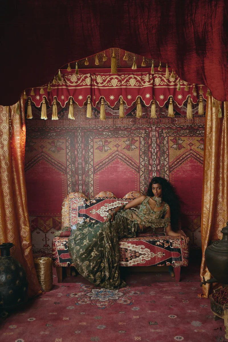This Emerald Green Draped Saree, crafted in crushed tissue, is paired with a sleeveless blouse made from pure tissue fabric, featuring intricate floral and chatai textures elevated with delicate 3D flower embellishments. The richly embroidered draped saree showcases a kalidar embroidered skirt and a fully embroidered wrapped drape that cascades towards the back, adding fluidity and graceful dimension. Completing the ensemble, the embroidered blouse is adorned with textured and floral embroidery with playful latkans.
