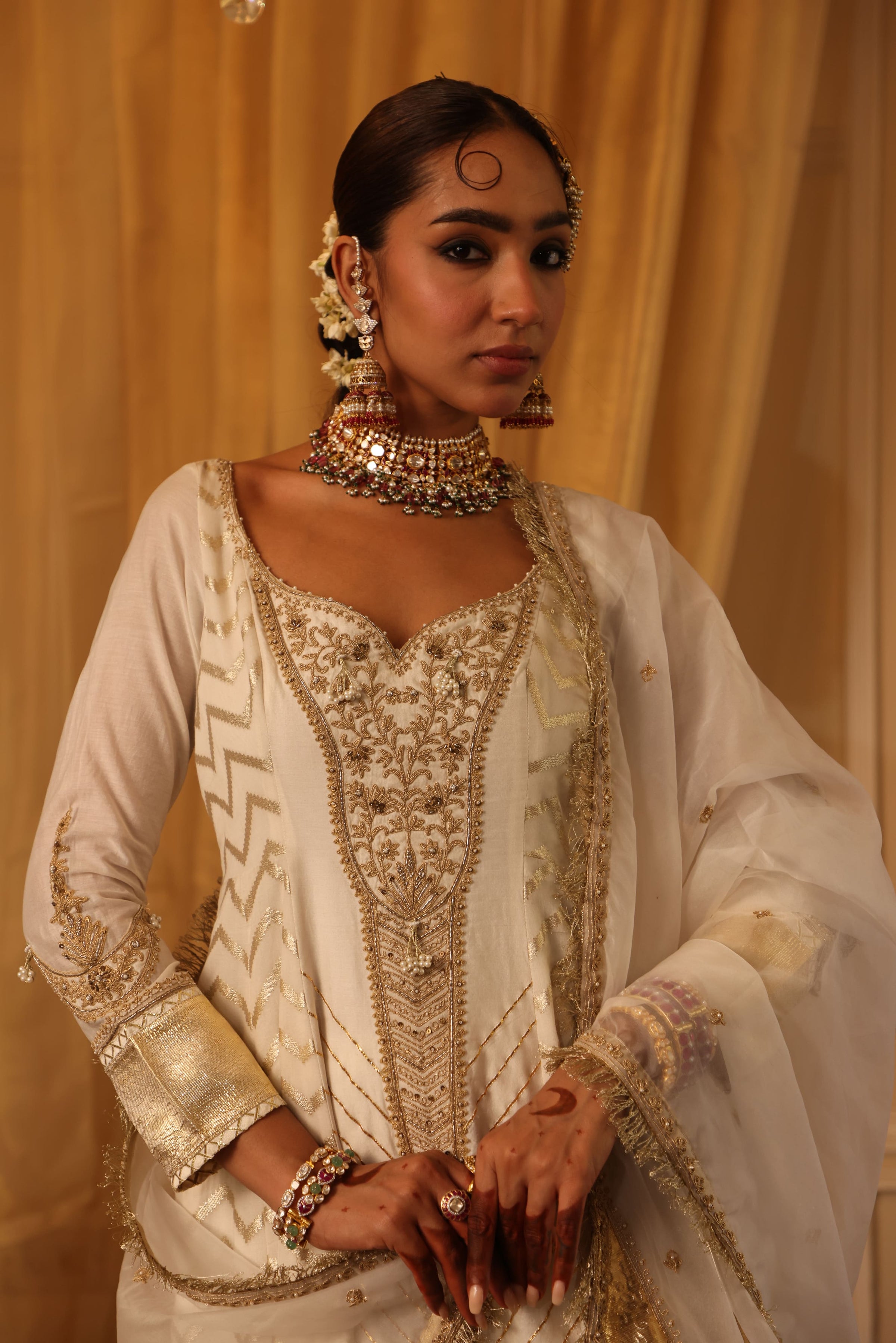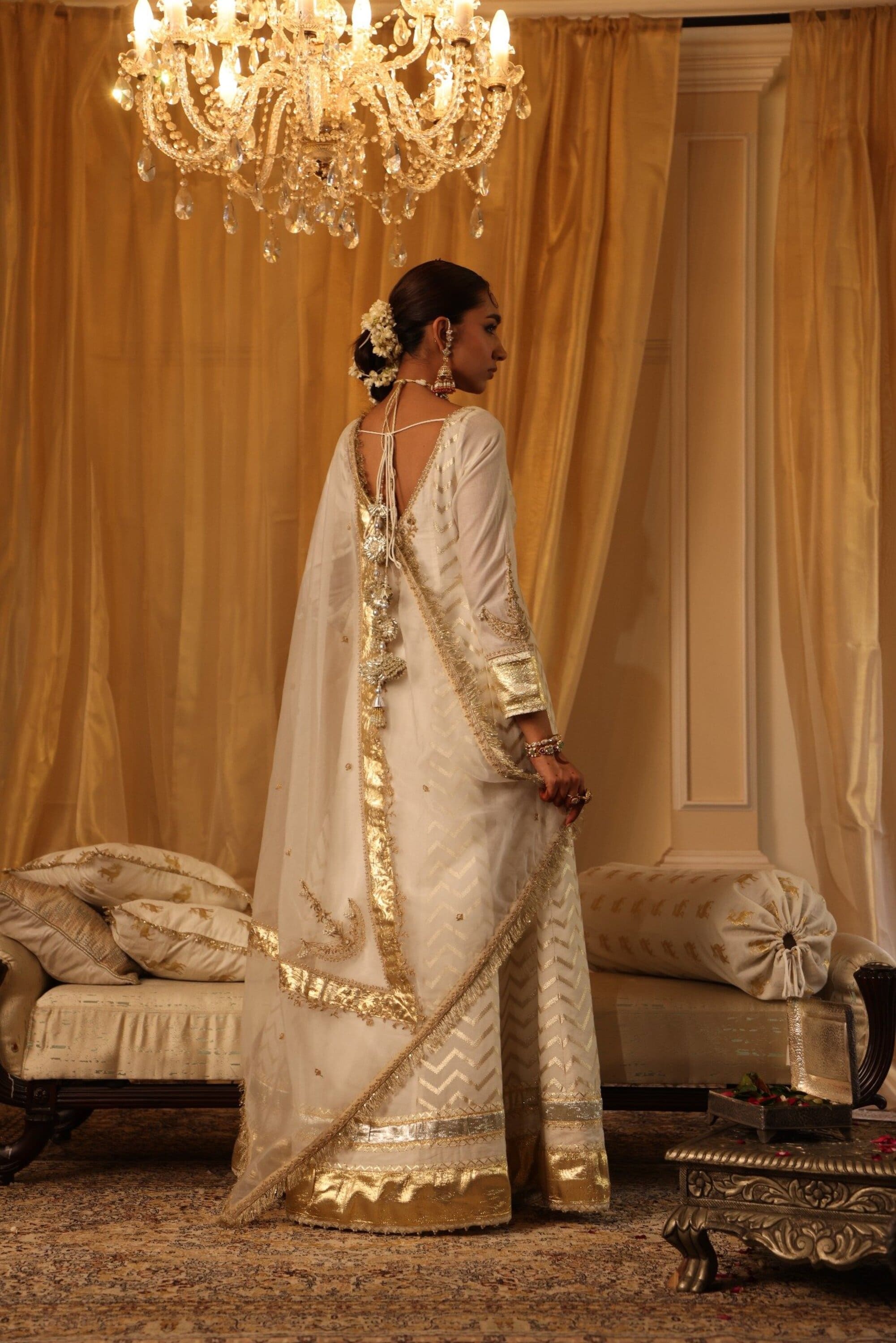 This Ivory Chanderi Silk Anarkali Set is adorned with celestial moon and lotus motifs, intricate dori and zari embroidery, and shimmering gota texturing. The silver and gold lampi borders on the sleeves and hem add a regal touch, while the sheer organza dupatta completes the look with lampi borders and dori embroidery. A perfect blend of ethereal sophistication and heritage craftsmanship.