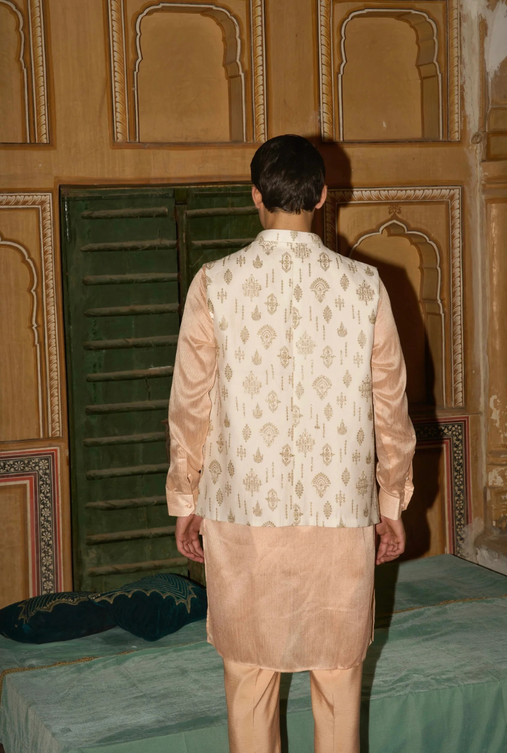 An ivory jacket adorned with geometric floral motifs, brought to life through intricate zari work in soft golden thread.