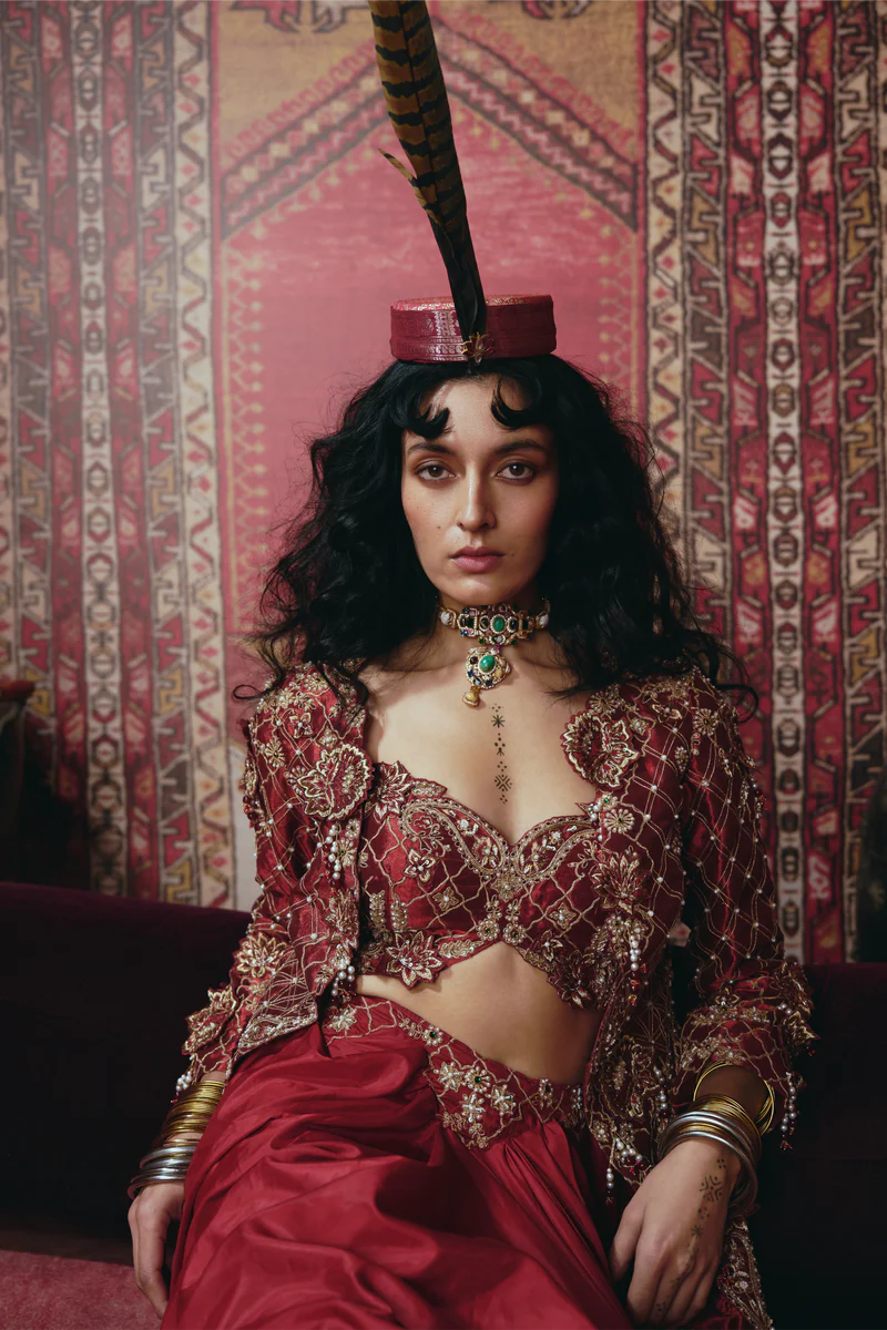 This Maroon Draped Skirt, crafted in soft silk, is paired with a jacket and bustier made in matching pure tissue. The ensemble showcases intricate floral and chatai textures throughout, elevated with delicate 3D flower embellishments. The draped skirt is richly embroidered and accentuated with a pleated drape that falls freely in a ruffled style from the center front. Completing the look, the embroidered bustier is adorned with latkans, while the jacket features textured floral embroidery, 3D flowers, and refined pearl and stone detailing.