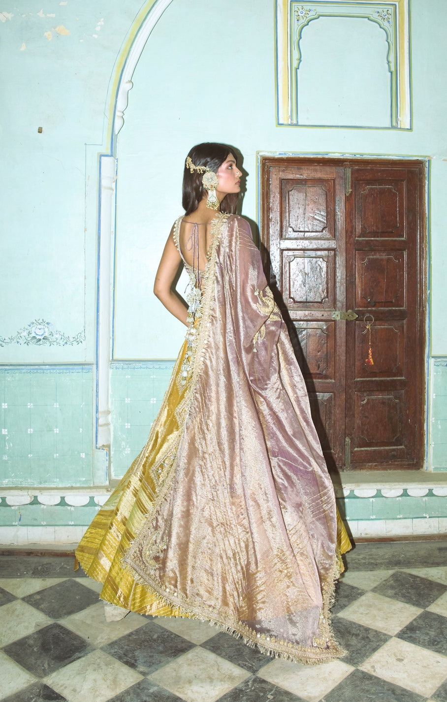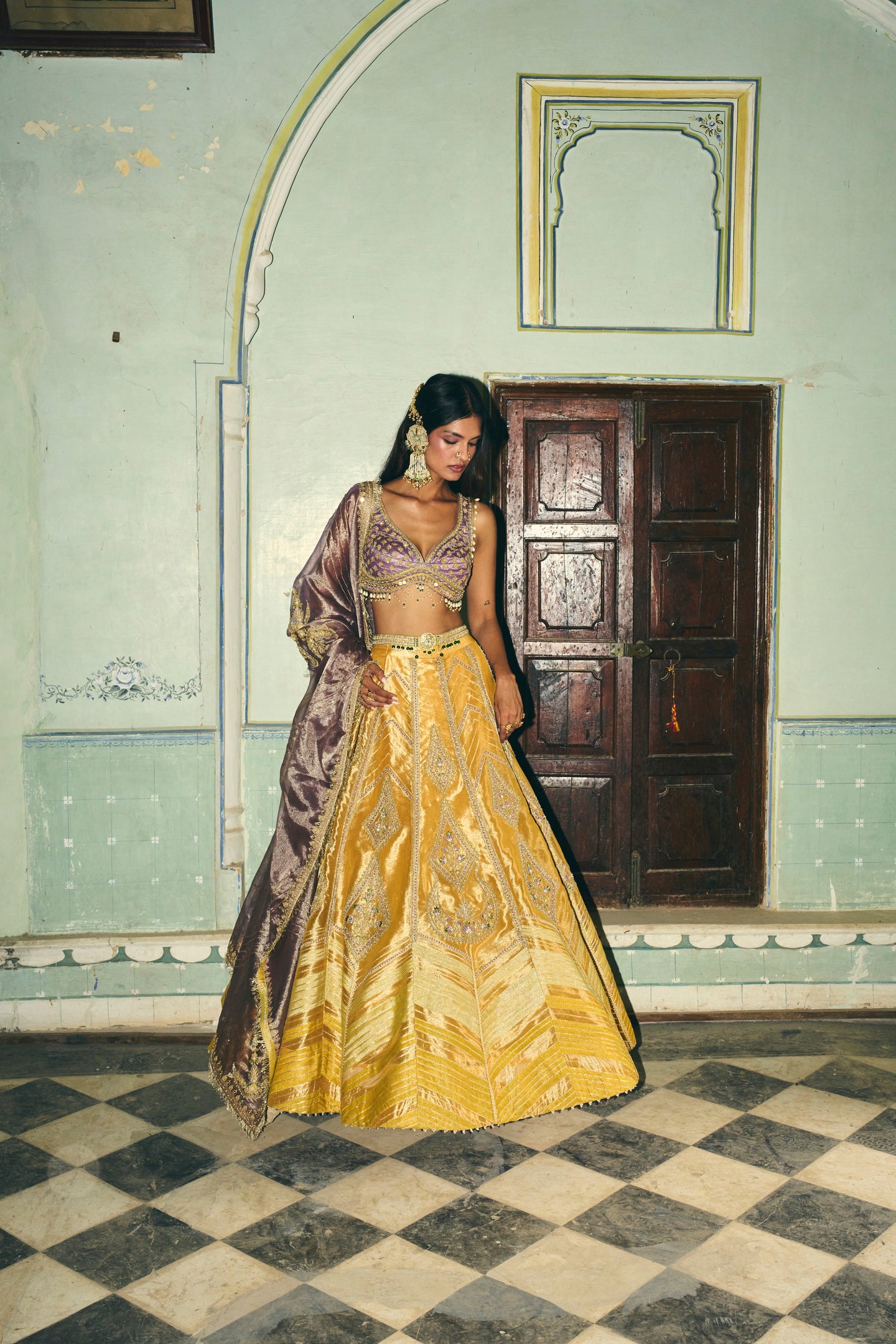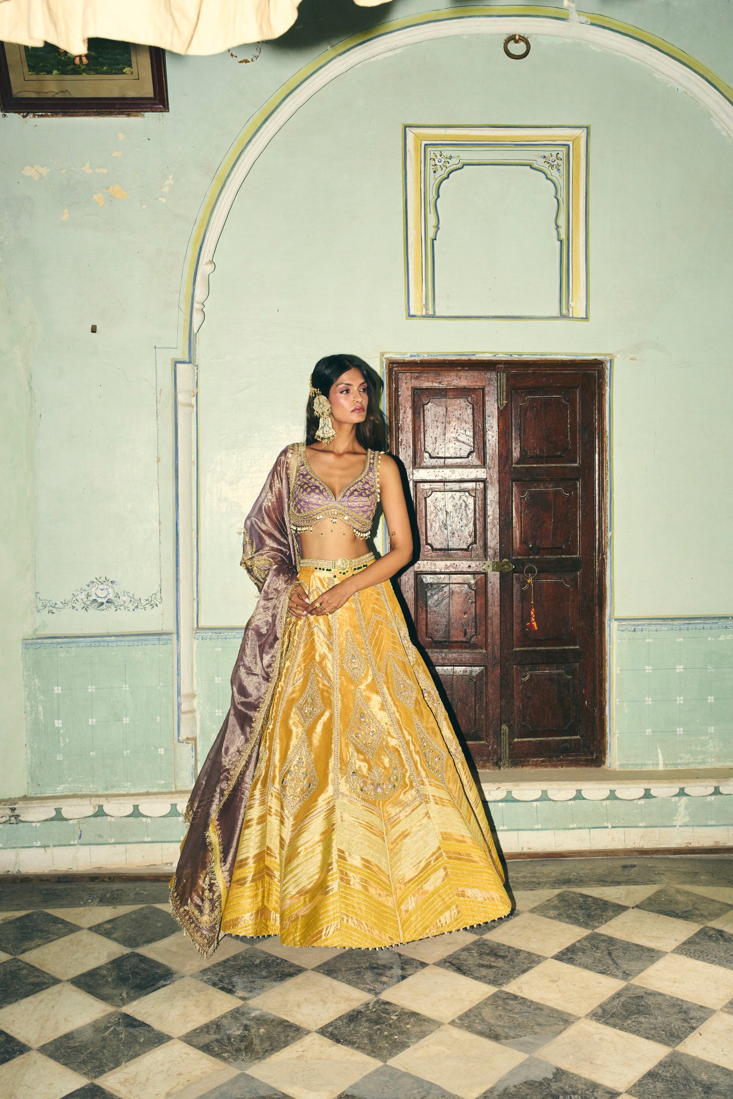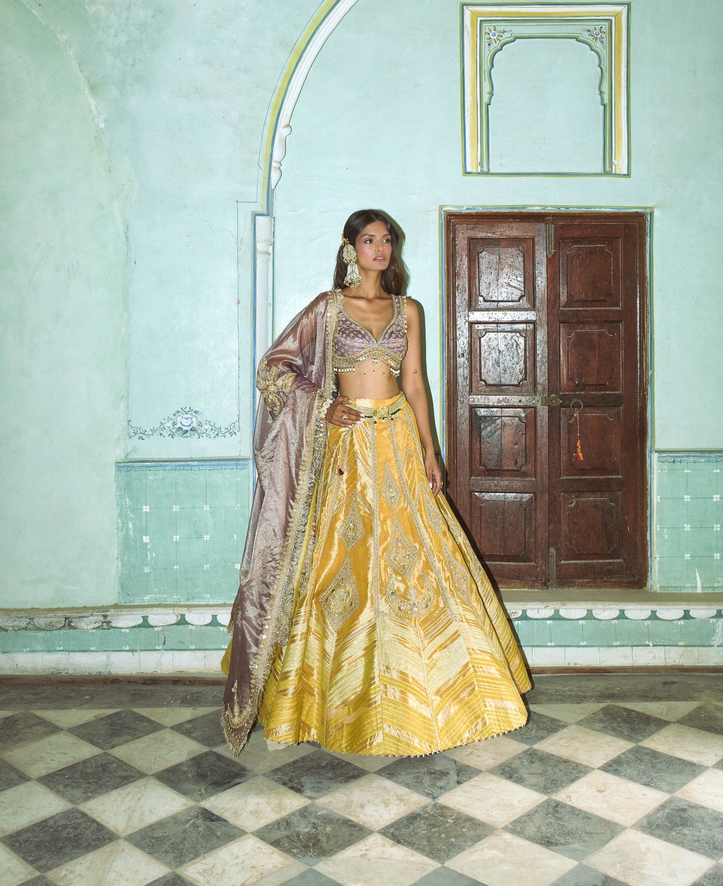 Mustard Yellow With Lilac Tissue Dupatta Lehenga Set
