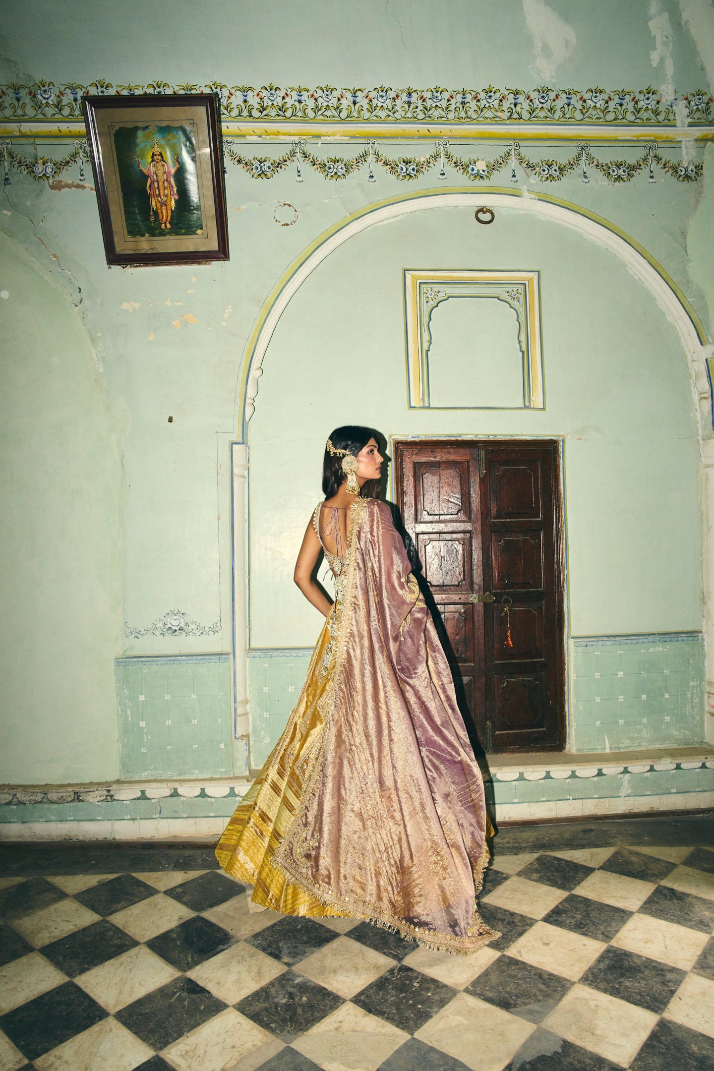 This mustard yellow lehenga in pure tissue exudes graceful charm, adorned with delicate half-moon and diamond-shaped motifs intricately filled with blooming floral embroidery. Rich gota patti borders and textured V-shaped accents lend a regal, handcrafted elegance to the ensemble. Paired with a lustrous lilac embroidered blouse featuring playful drop latkans, and a matching tissue dupatta shimmering with gota work, subtle sequins, and ornate lace-edged borders, this look is a seamless harmony of tradition and refined sophistication.
