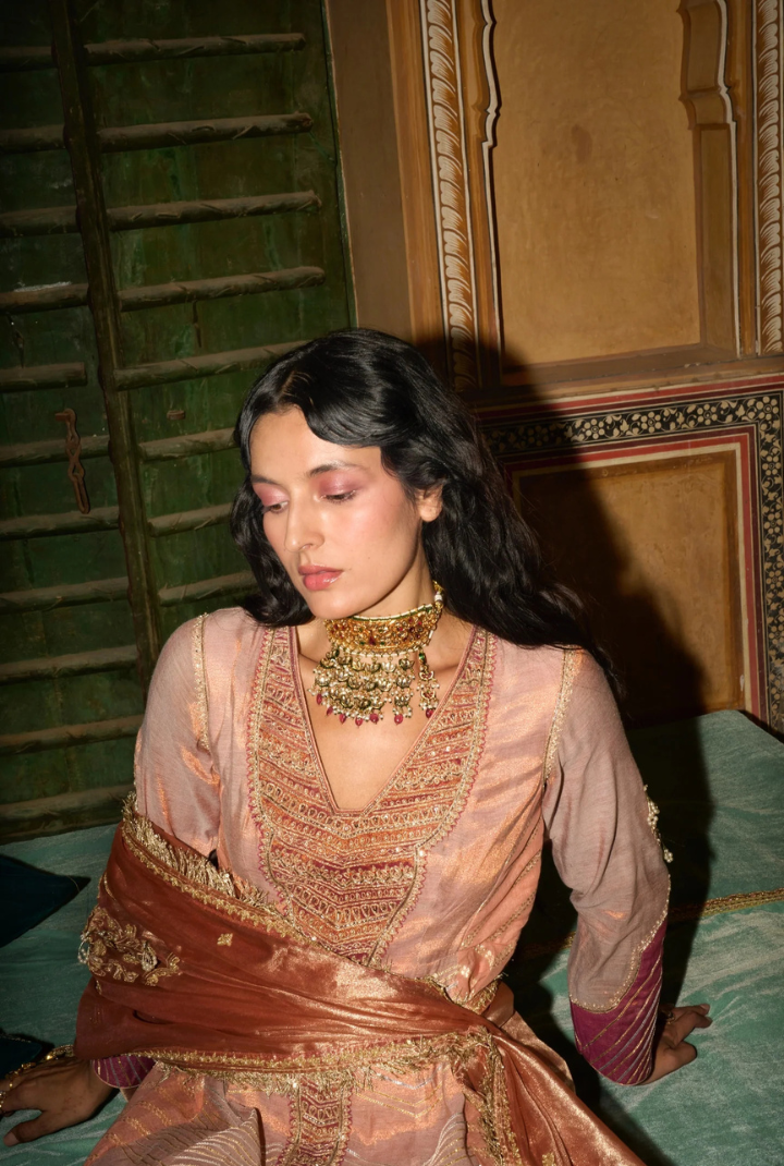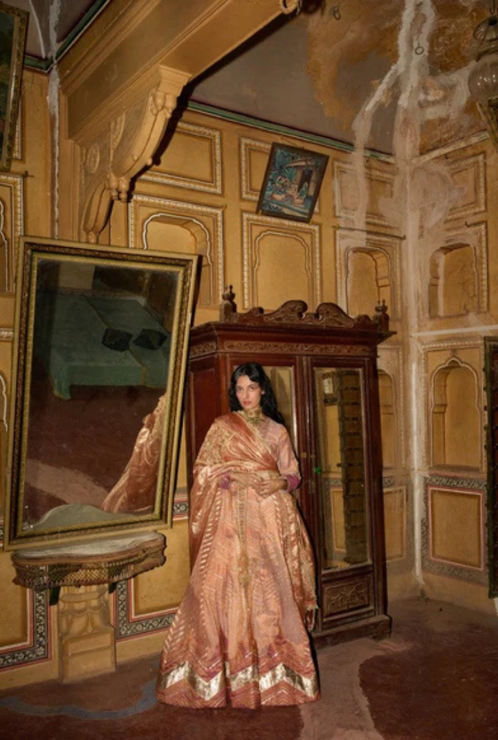 This Kalidar Anarkali set, crafted in peach silk zari tissue and jacquard Banarasi silk, features intricately embroidered elongated motifs with gota texturing, dori, zari, and fine threadwork. Paired with a monochromatic tissue dupatta adorned with floral-inspired embroidery and subtle sequins, its look is elevated by a beautifully textured V-shaped gota patti border that adds a touch of refined elegance.