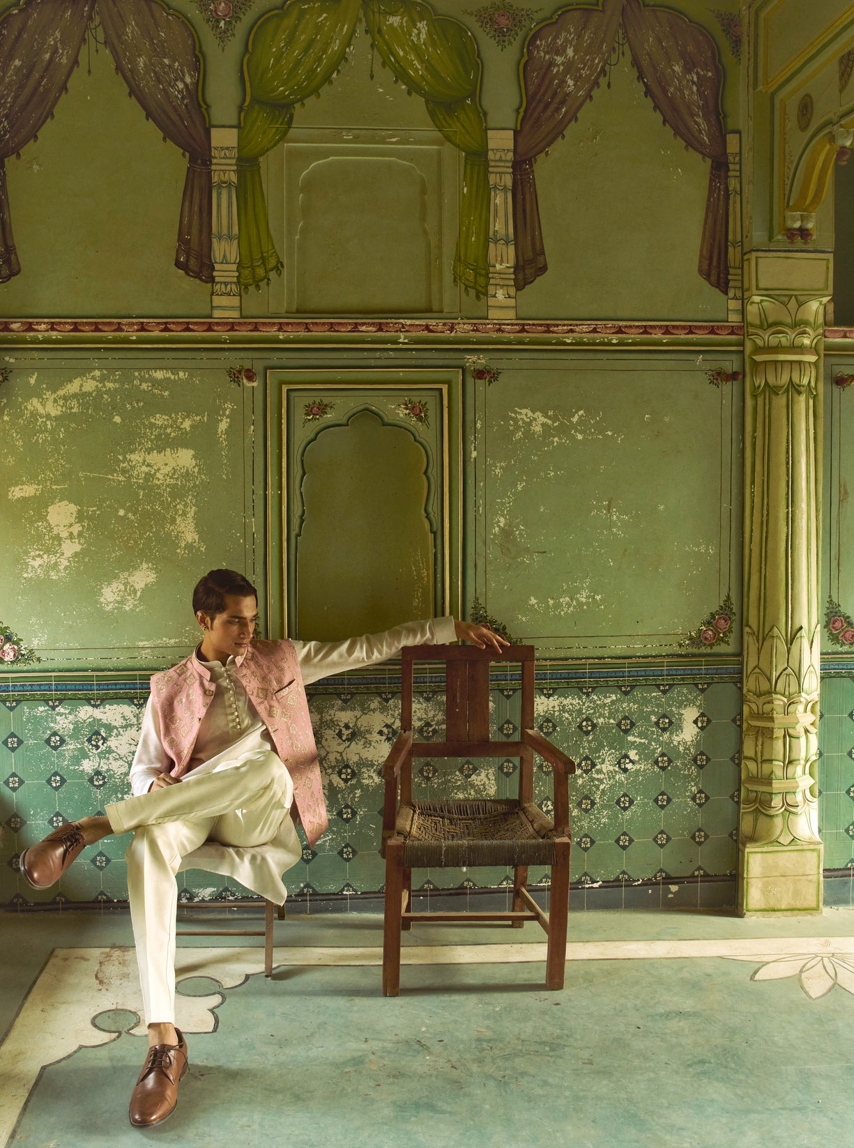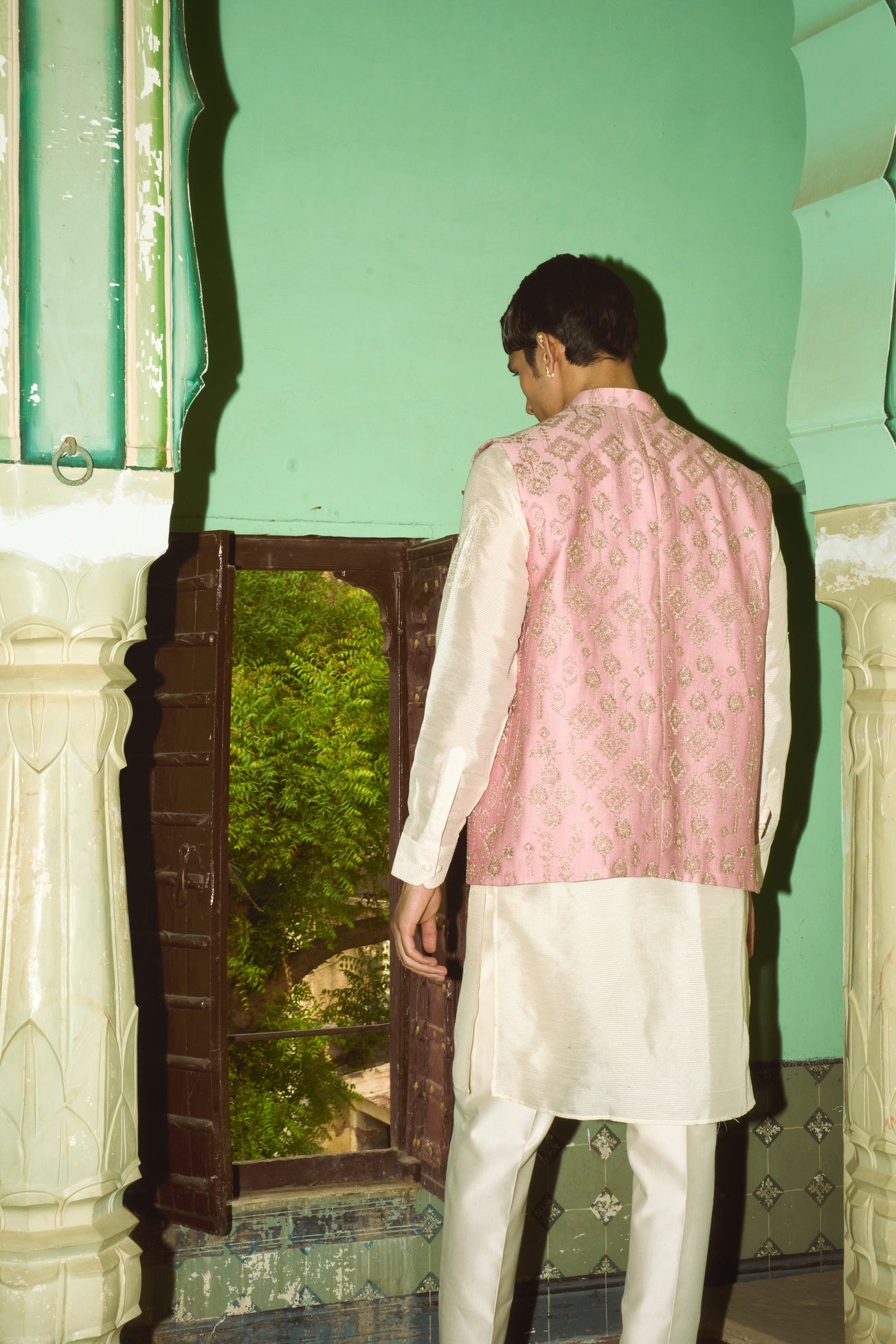 A powder pink jacket adorned with geometrical floral motifs, brought to life through intricate zari work in soft golden thread.