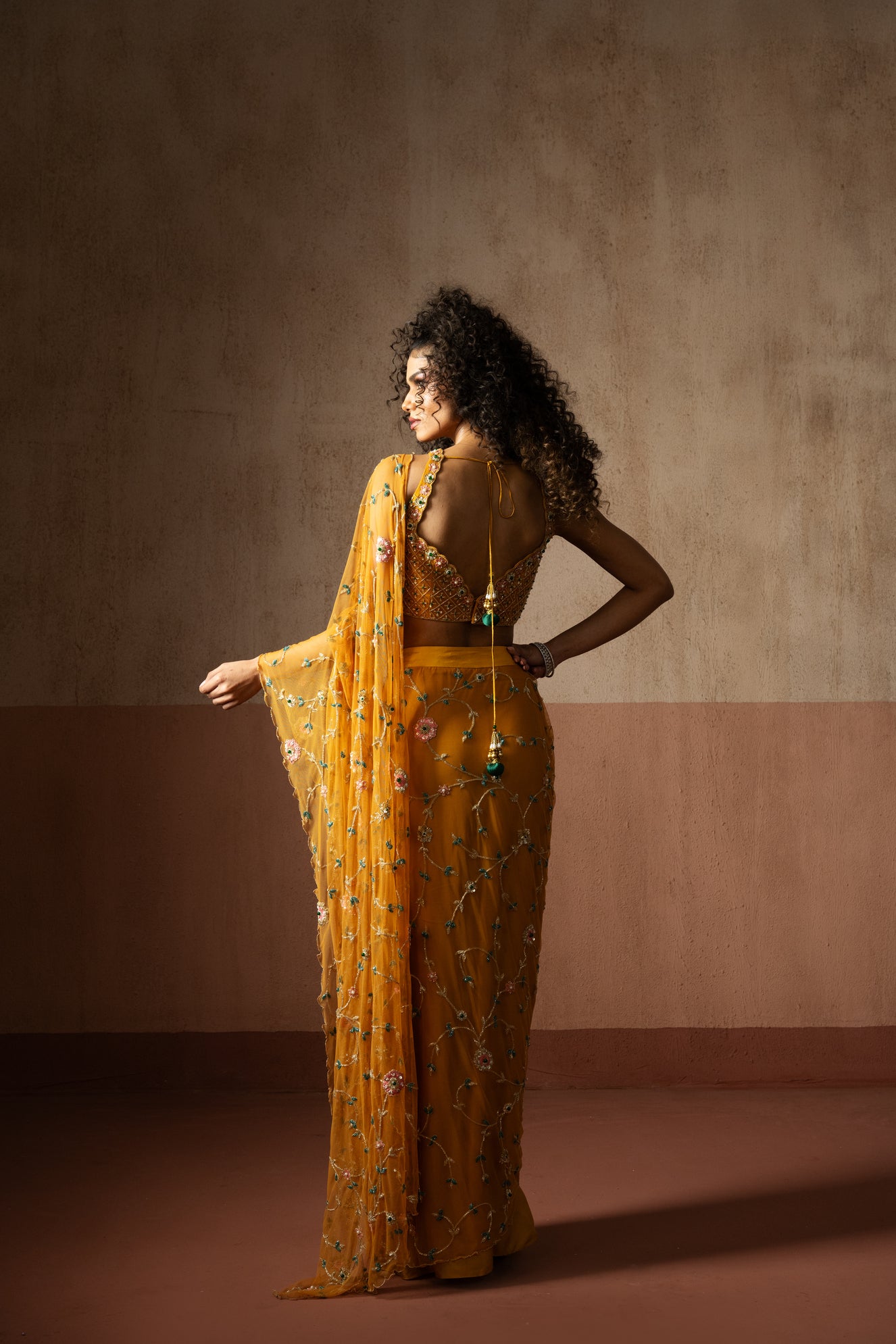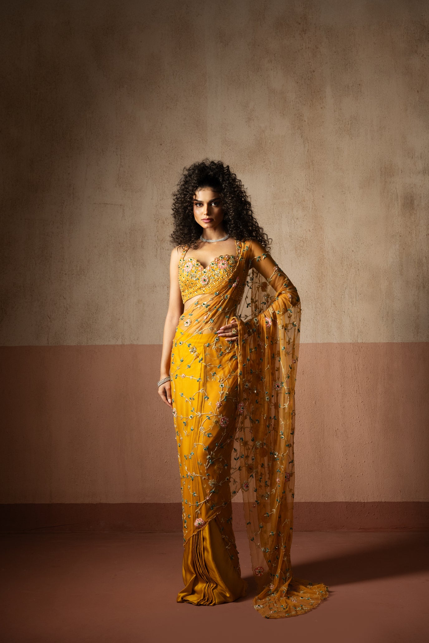 Featuring a mustard yellow pre-stitched, drape saree, with intricate hand embroidered work on blouse and pallu of the saree. The saree is made up of satin & net.
