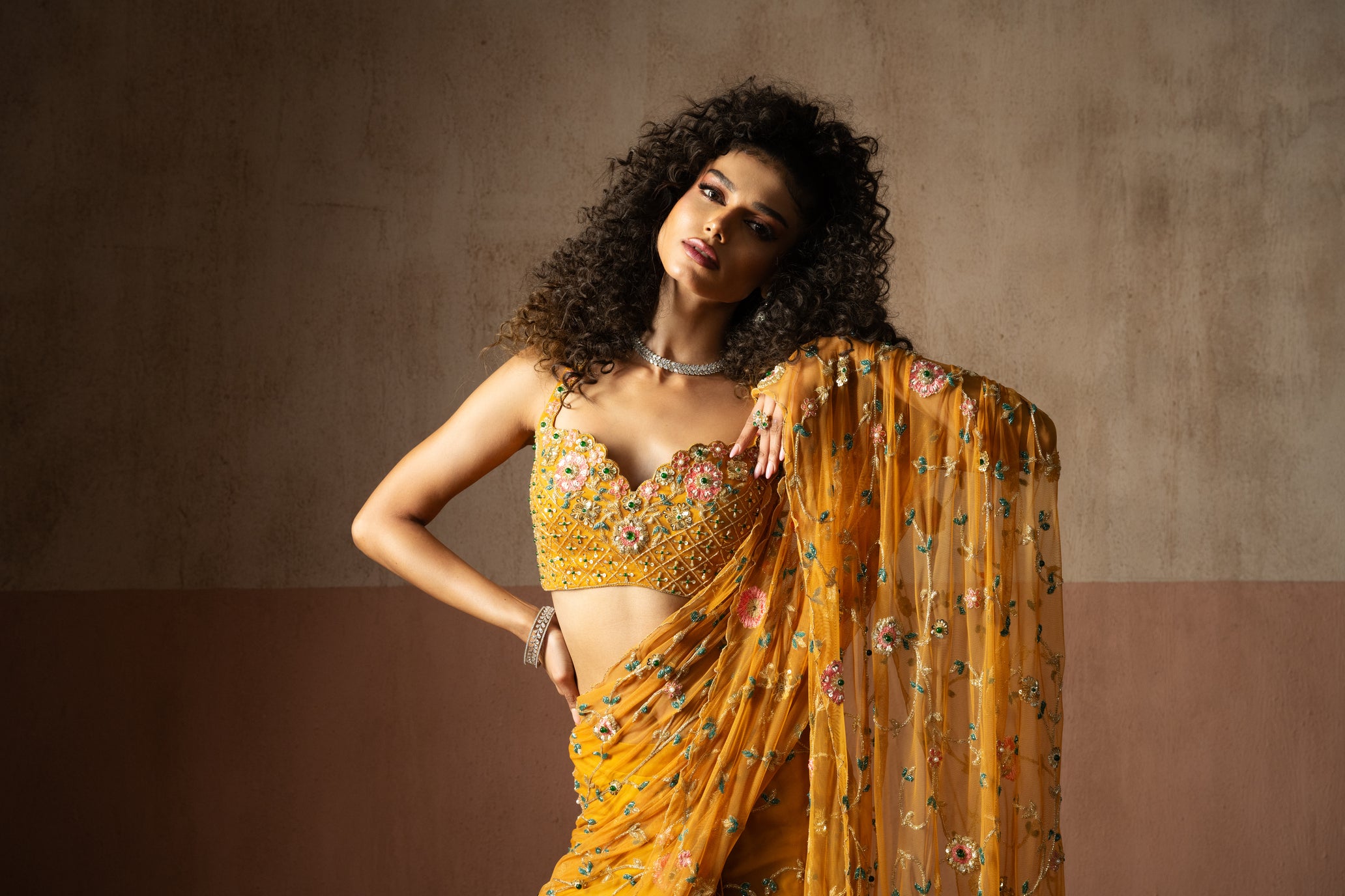 Mustard Yellow Hand Embroidered Net & Georgette Saree