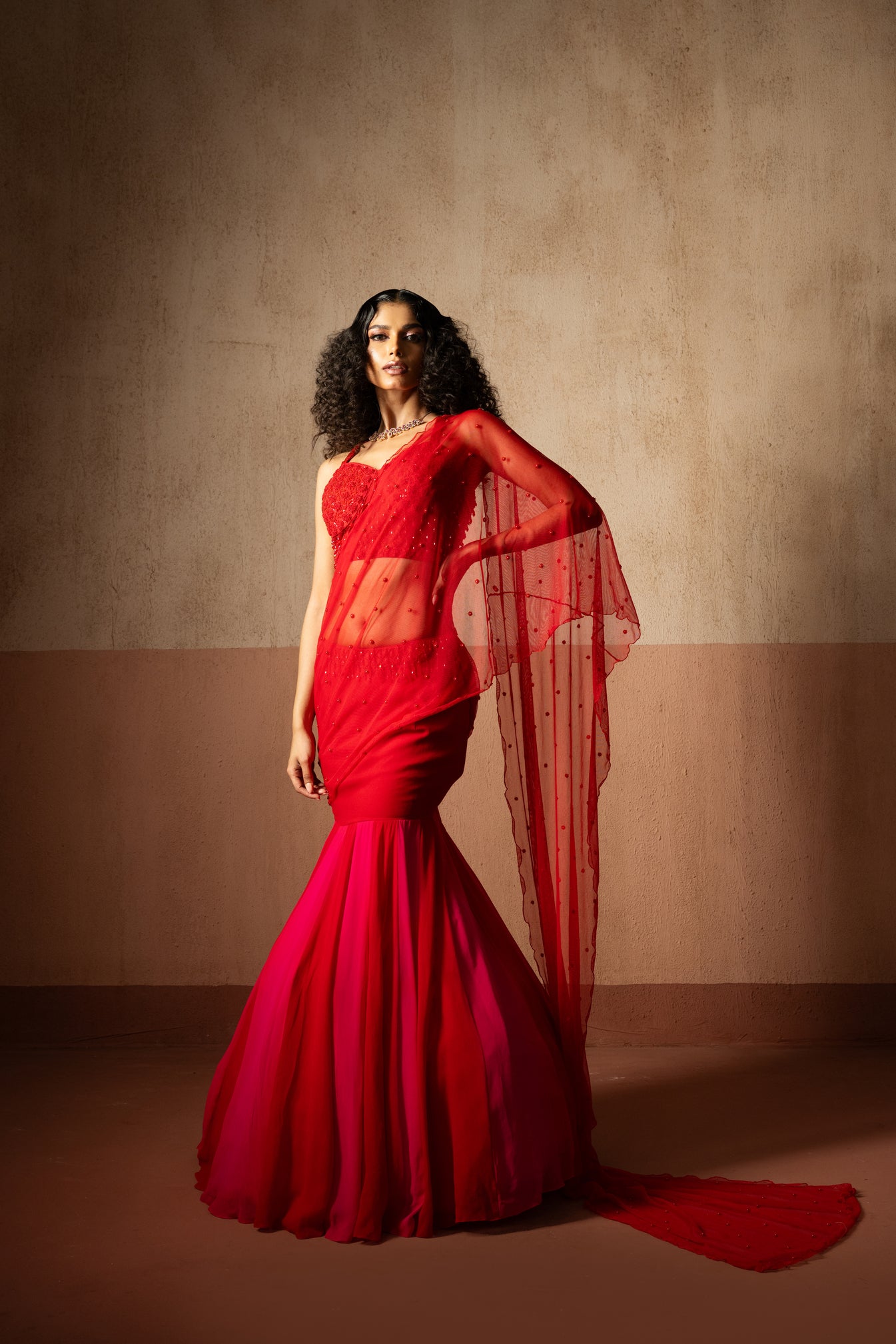 Red & Fuschia Pink Coloured Hand Embroidered Saree