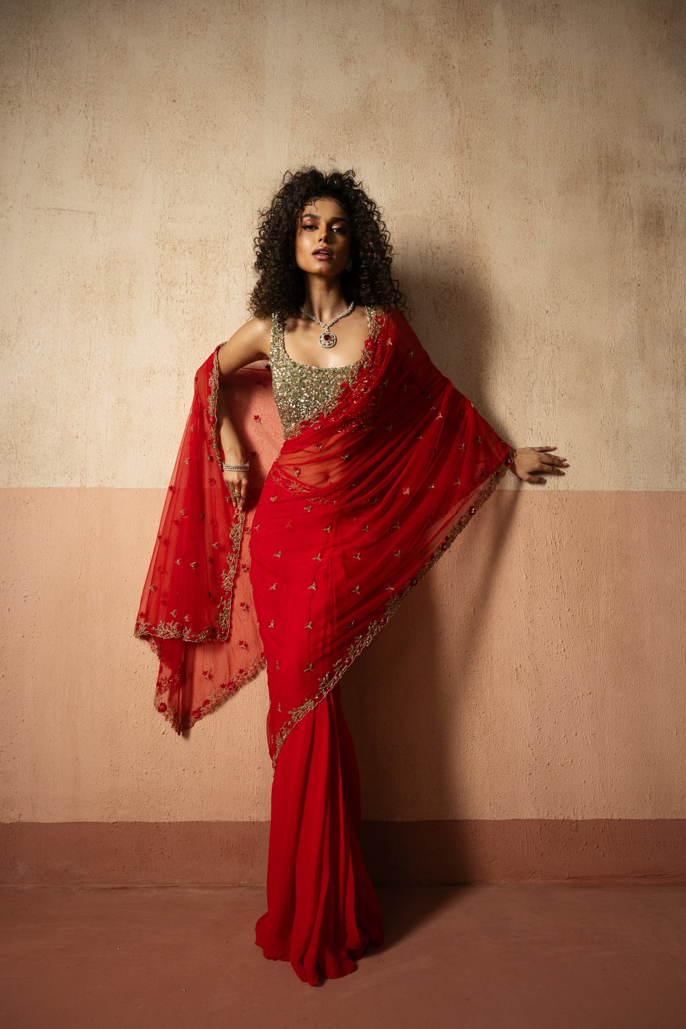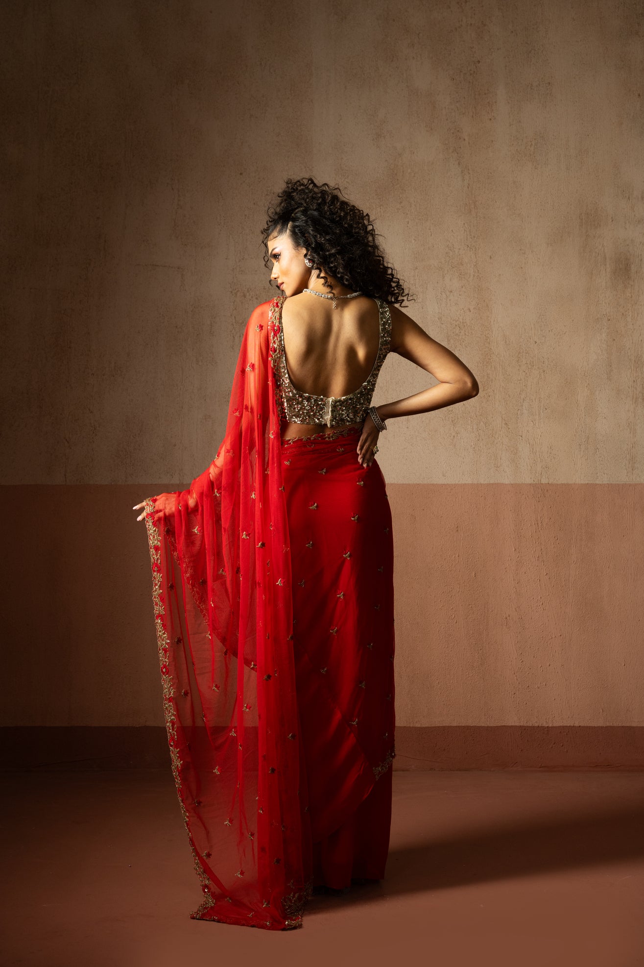 Featuring a red pre-stitched, drape saree, with intricate hand embroidered work on blouse and pallu of the saree. The saree is made up of georgette & net.