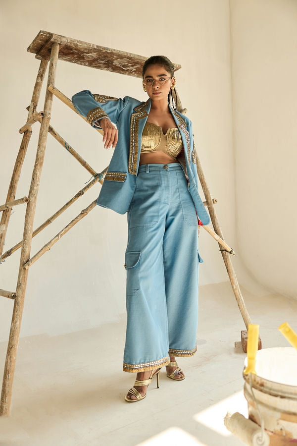 A chic blue denim blazer paired with denim cargo and a gold bustier, perfect for festive Indo-western occasions.