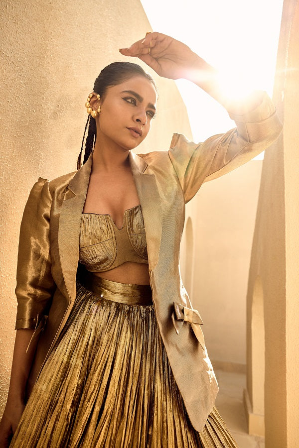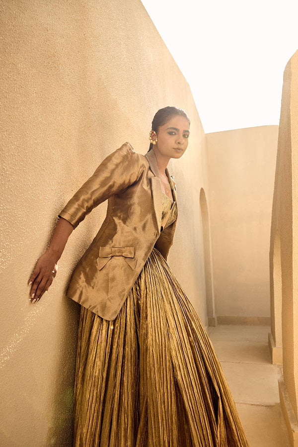A luxurious gold silk jacquard blazer, lehenga, and bustier set, perfect for festive occasions. Comes with a garment cover.