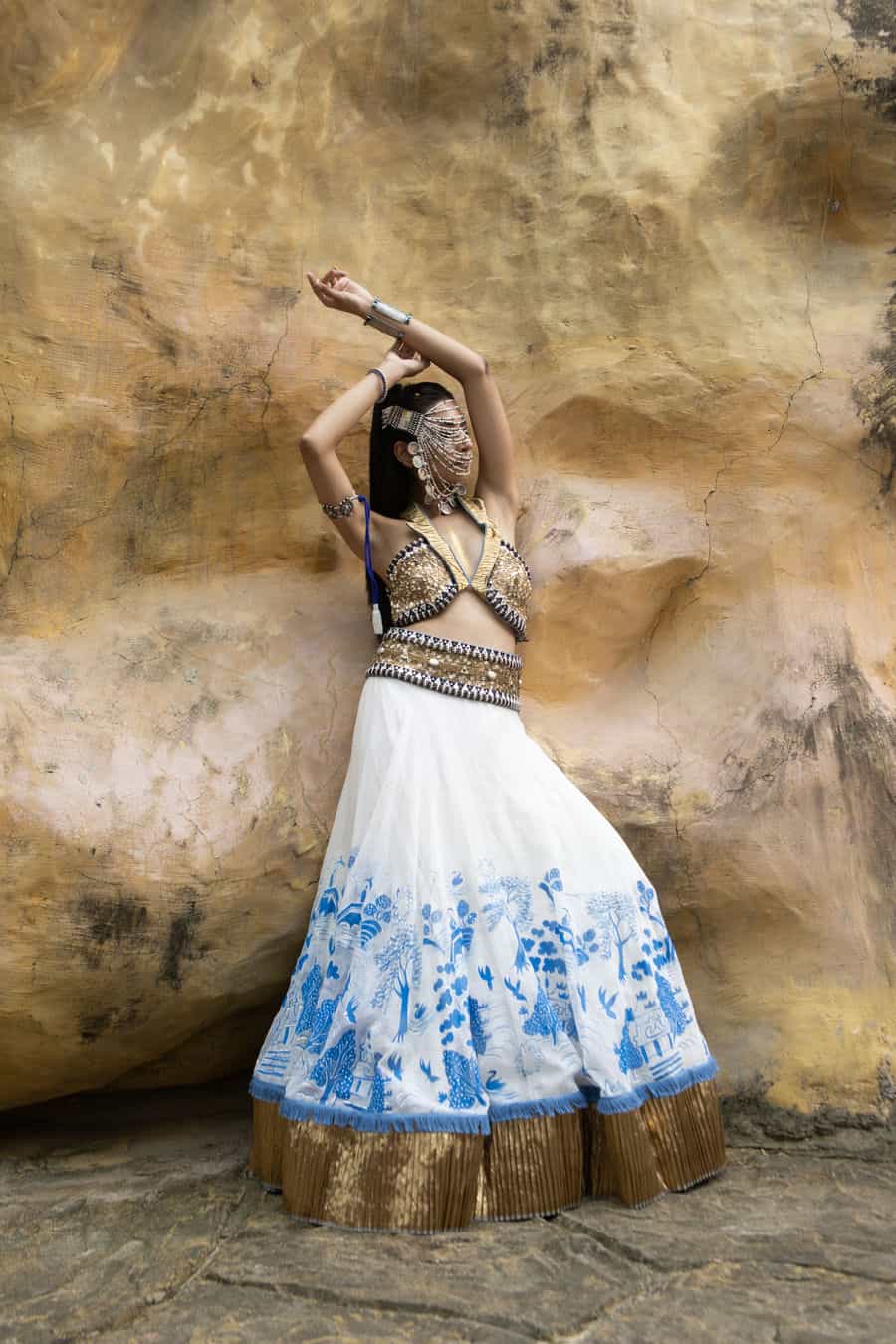 An elegant ivory Kota Doria lehenga, hand-painted with delicate artistry, paired with an embellished collared blouse. A timeless pick for weddings and festive celebrations.