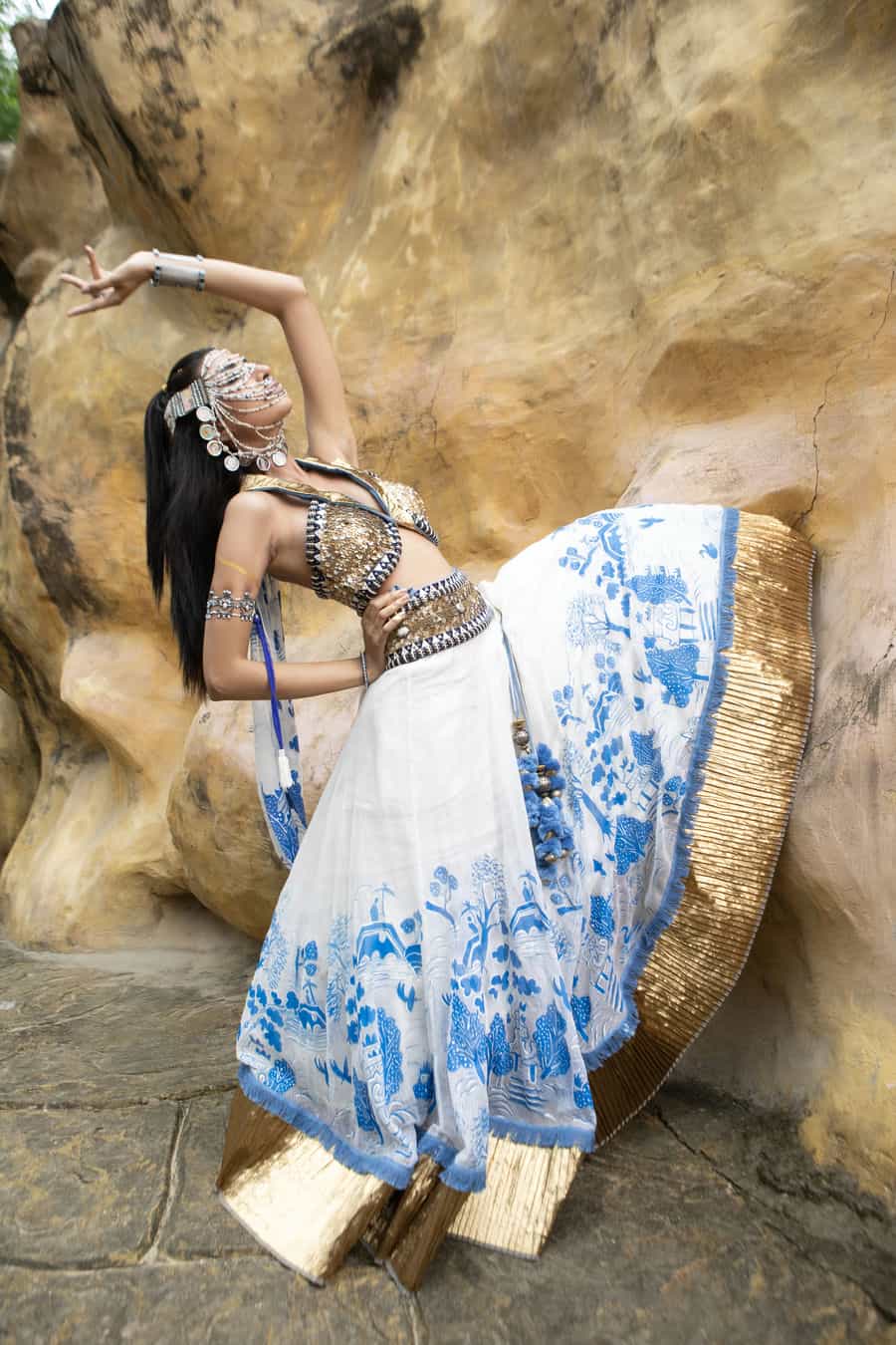 Special Finishings: Hand-painted details, sequin work, chain work, and a denim fringe on the lehenga hemline
