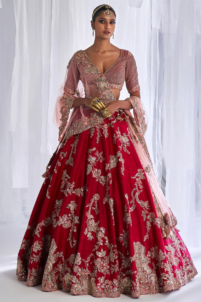 Marron raw silk bridal lehenga with gota, kamdani and thread embroidery and pale peach tulle dupatta.
