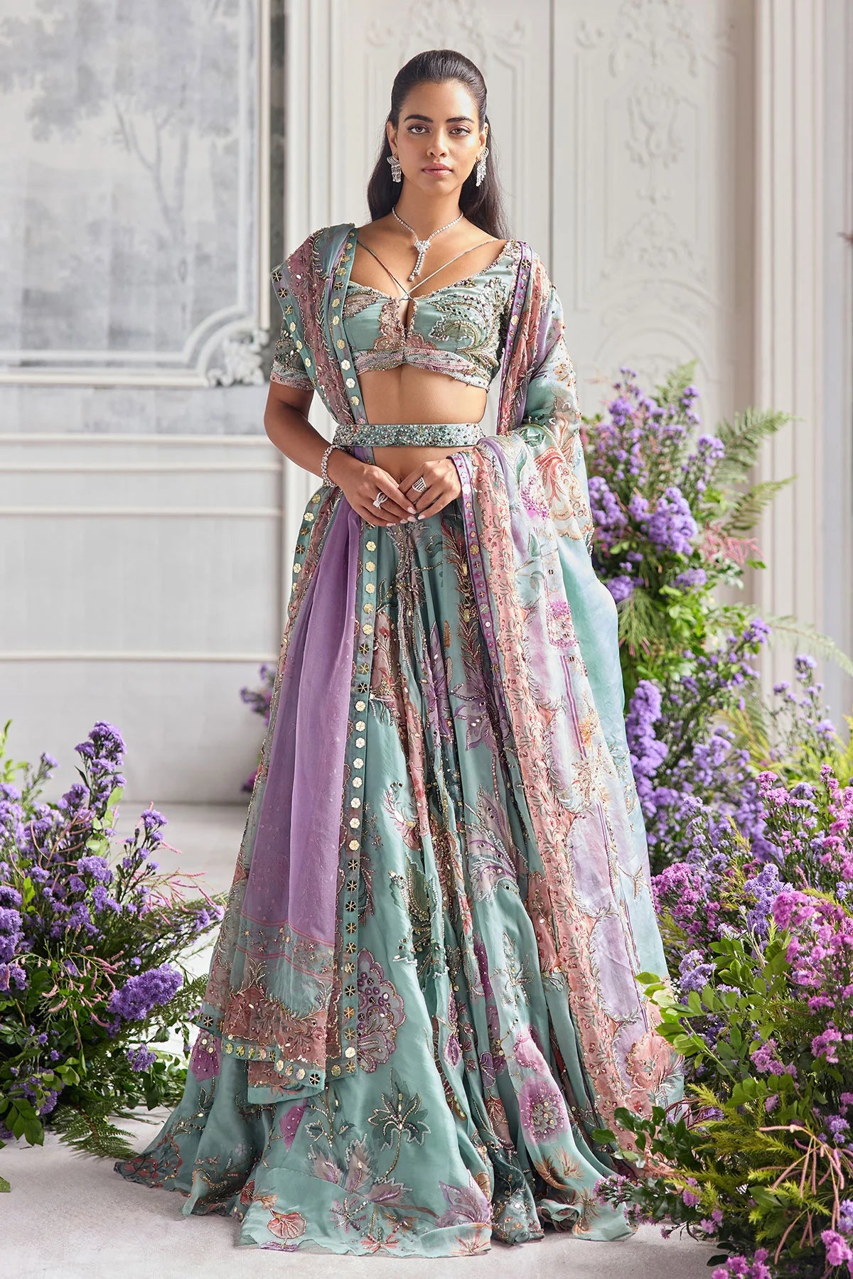 HEAVY HAND EMBROIDERED LEHENGA SET PAIRED WITH ADDITIONAL SECOND DUPATTA AND EMBELLISHED WAIST BELT