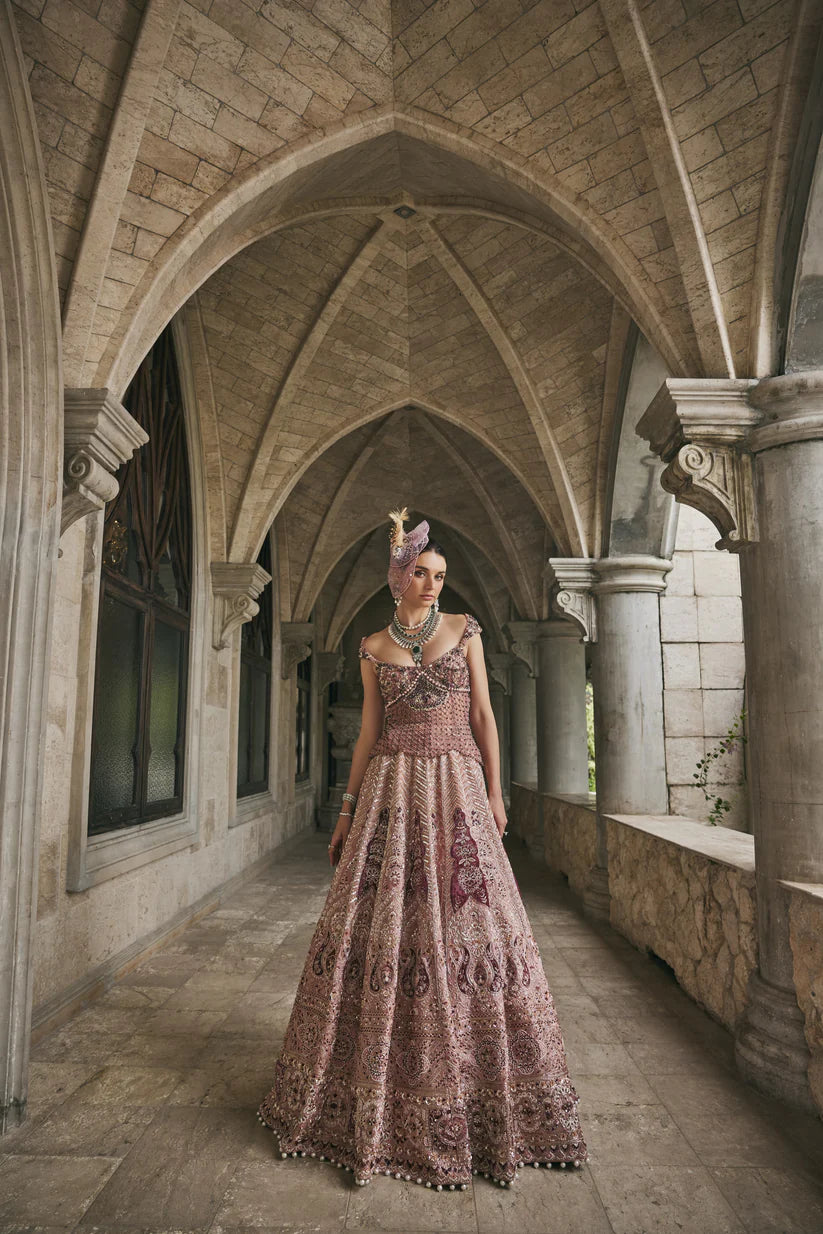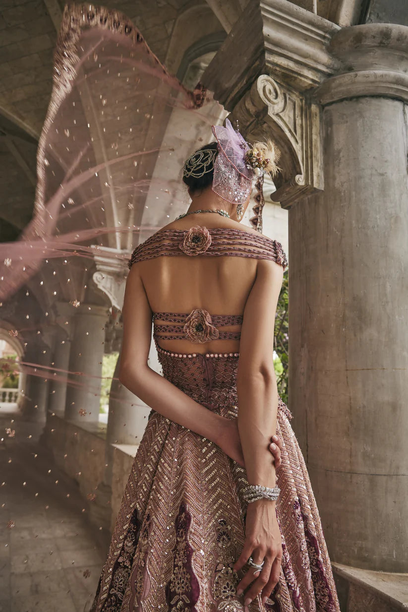 Draped in elegance, this Cashmere Velvet Pink lehenga set is a vision of refined romance. Crafted in luxurious raw silk, the lehenga features intricate embroidery with delicate strip patterns and blooming rose motifs, evoking timeless charm. The statement corset-style peplum blouse in net is adorned with shimmering crystal embellishments, creating a sculpted, feminine silhouette. Paired with a soft net dupatta bordered in plush velvet, this ensemble seamlessly blends modern allure with traditional artistry—perfect for the bride or bridesmaid who desires grace with a touch of glamour.