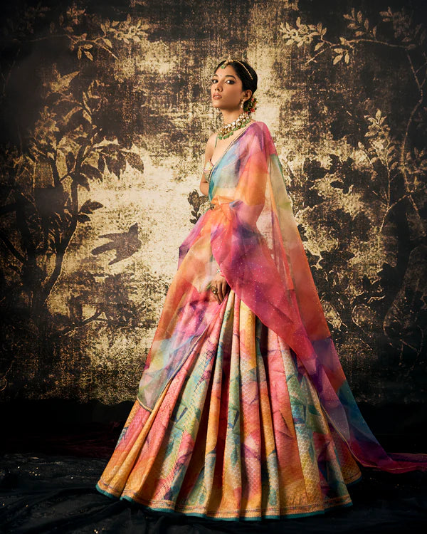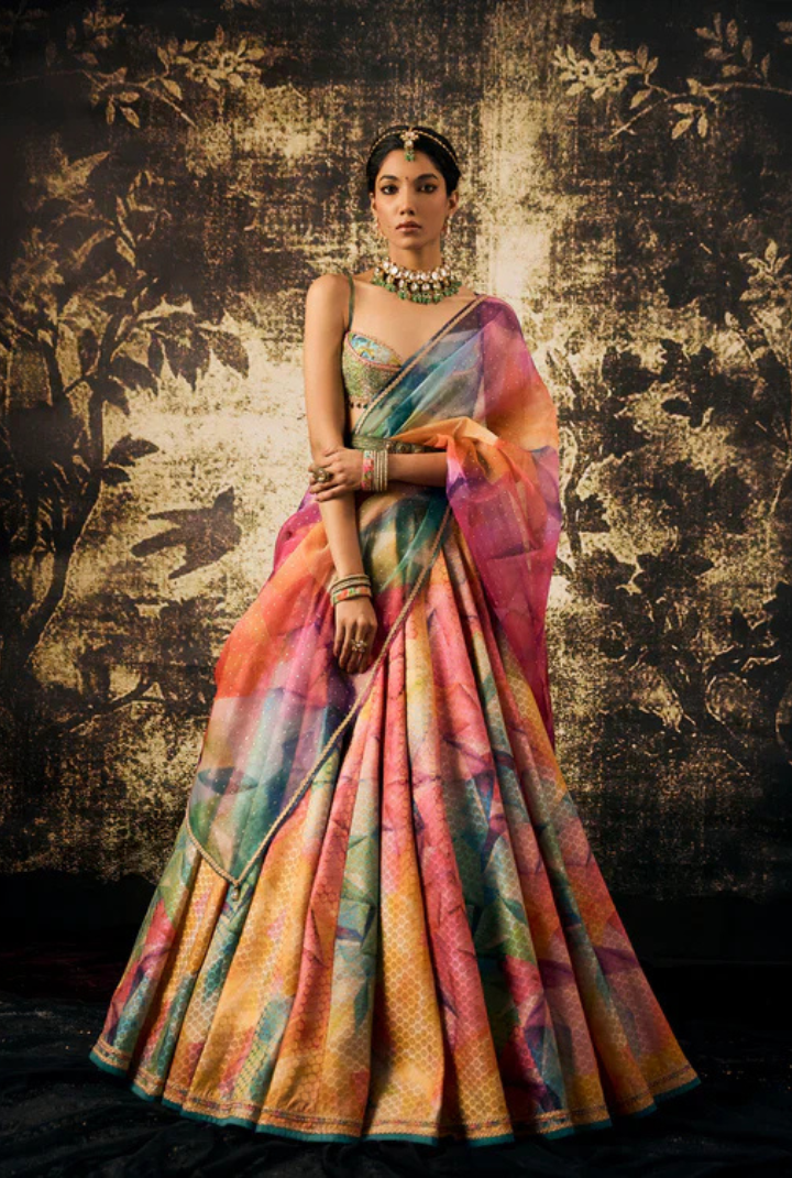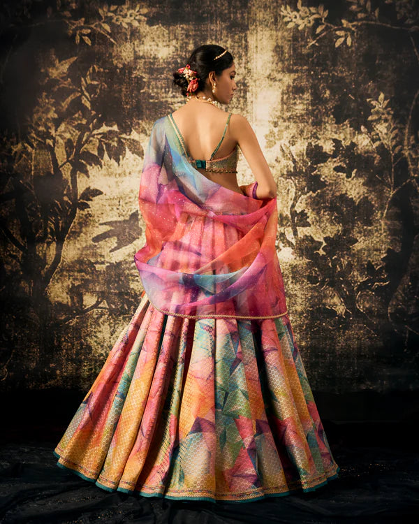 Featuring brocade kaleidoscope print lehenga. It is paired with hand embroidered blouse and printed organza dupatta.