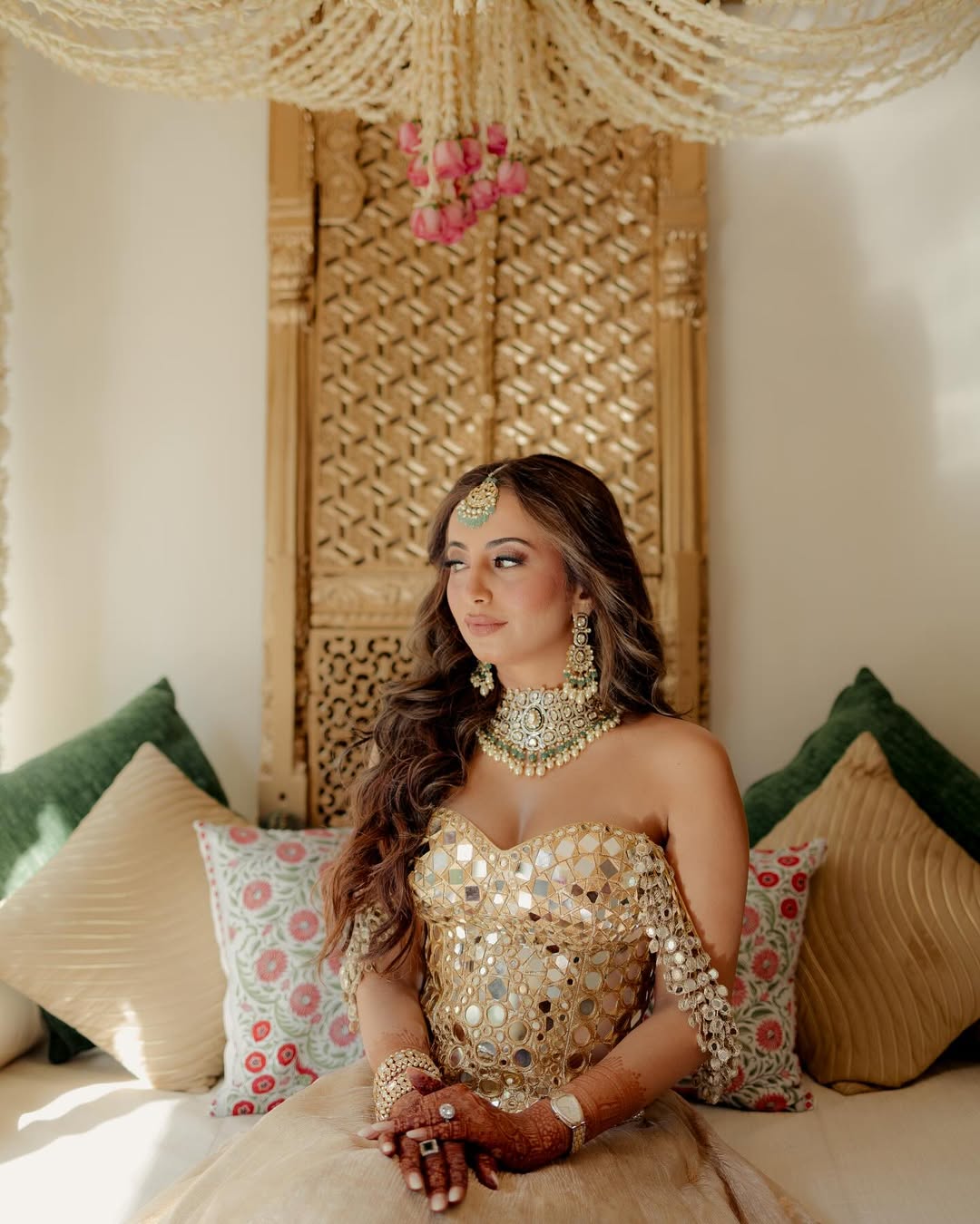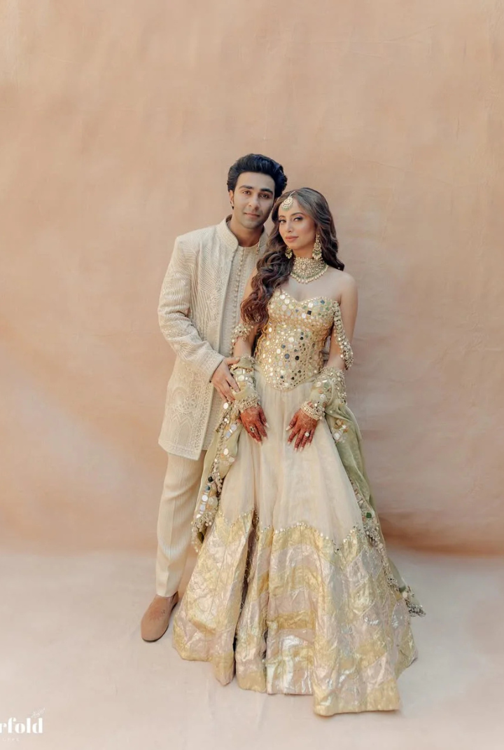 Tissue Lehenga with chevron print , paired with mirror work corset blouse on gota lined with chanderi silk and pistachio green organza mirror and gota work dupatta
