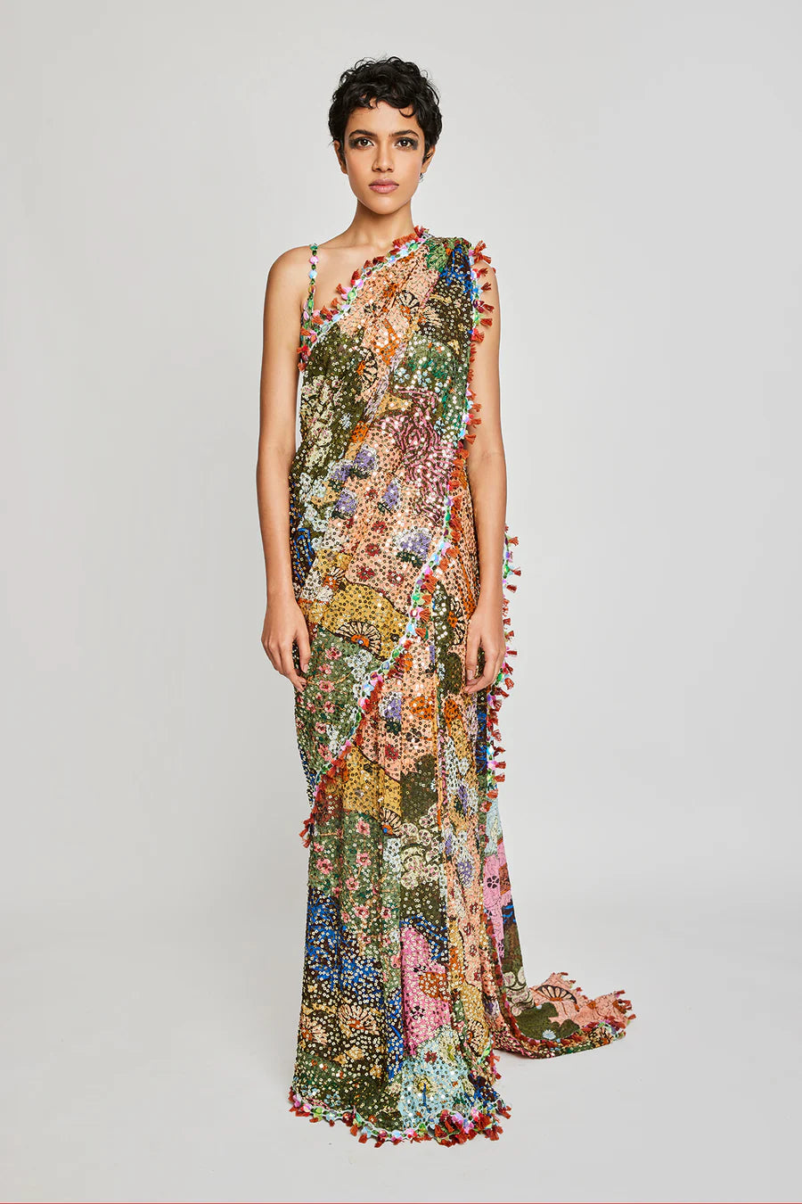 Our Trencadís sequinned saree with tassel detailing and embellished blouse.