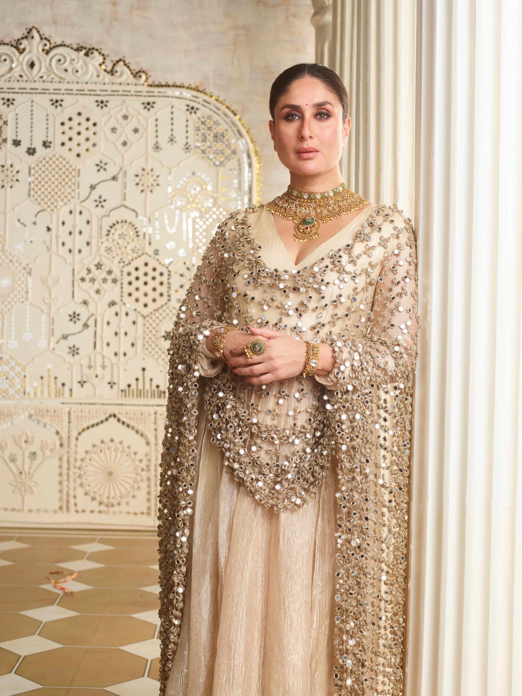 Gold tissue anarkali and churidaar paired qwith mirror jaal veil.