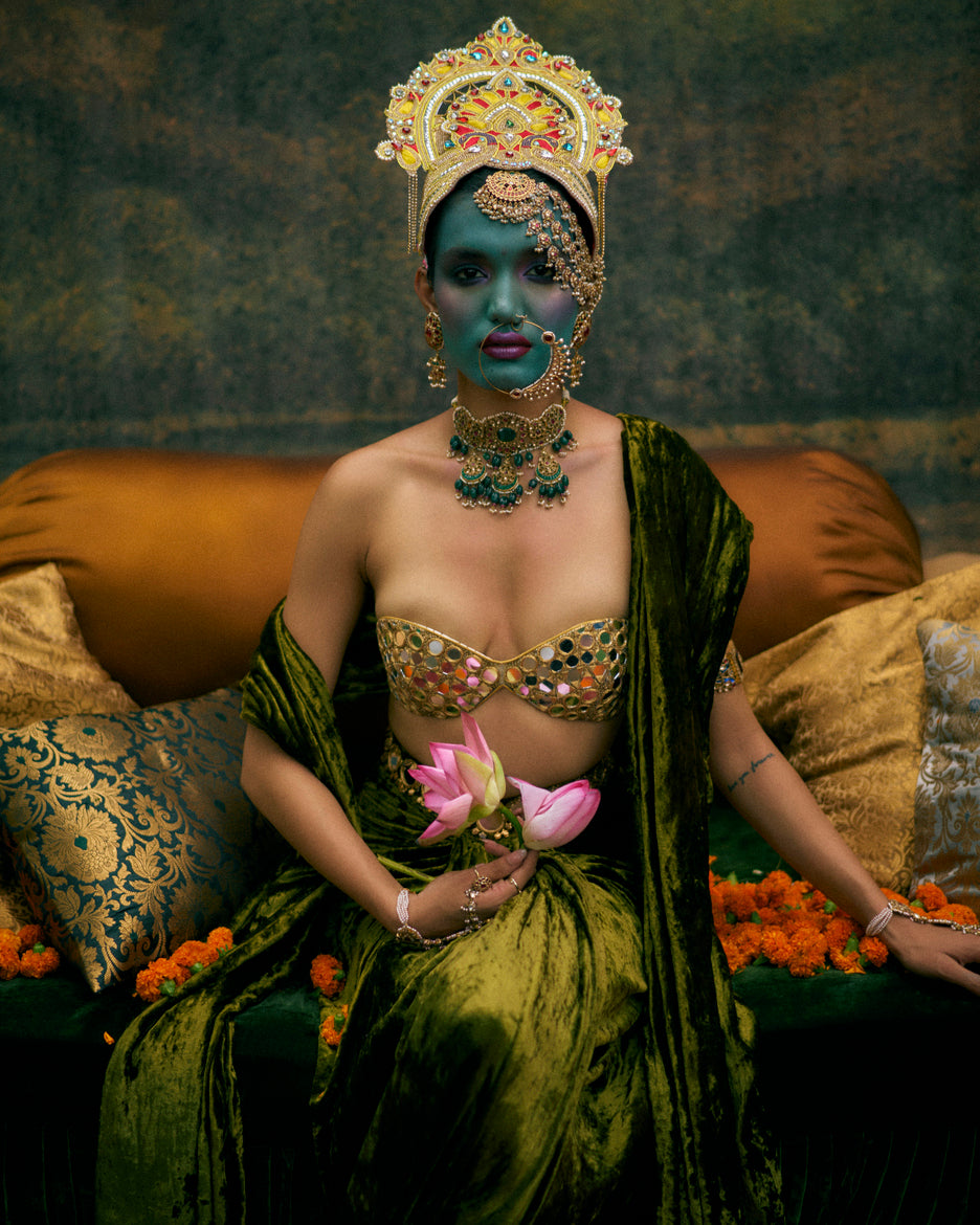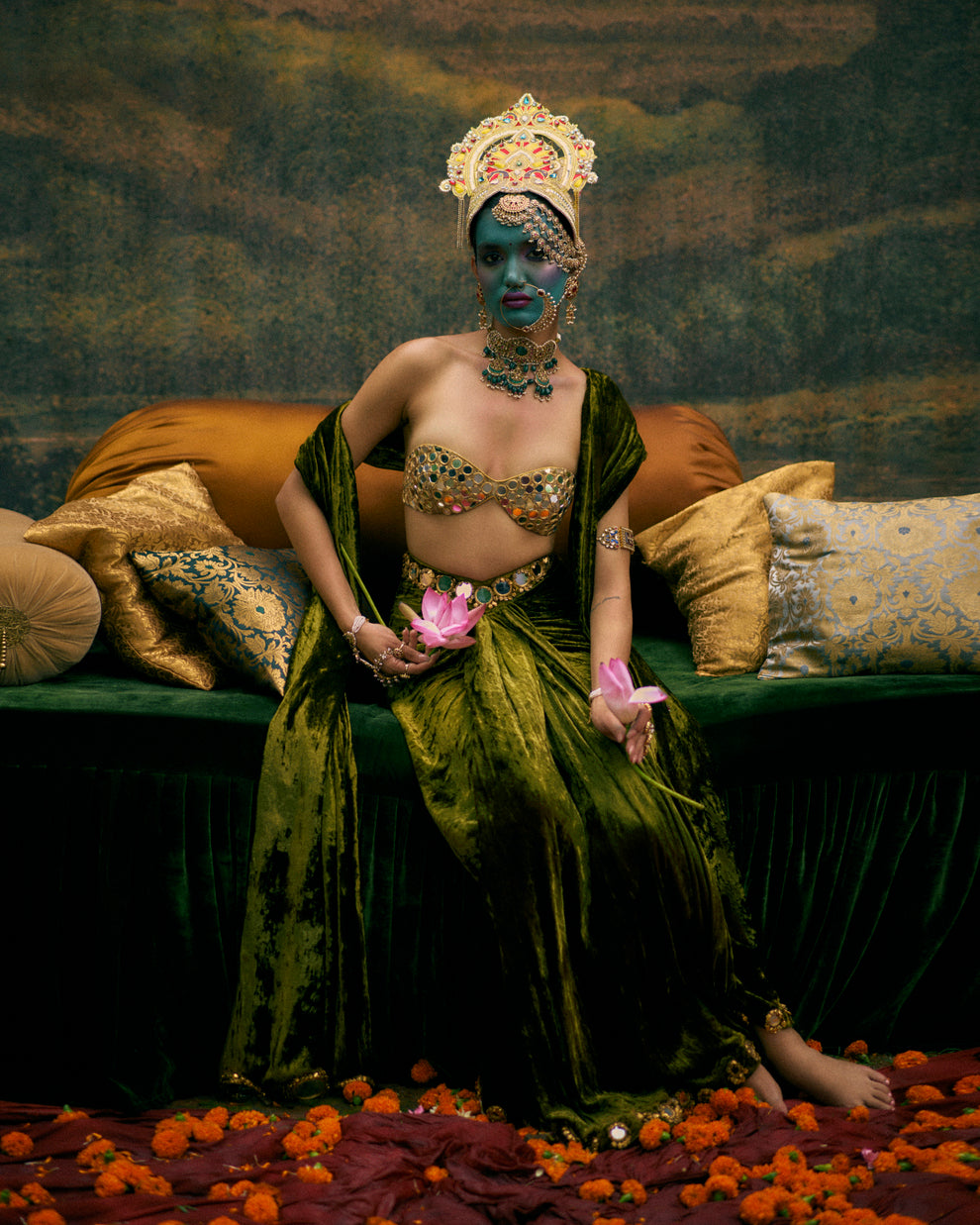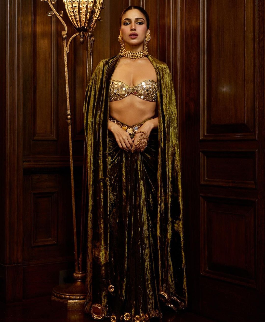 Velvet green skirt with mirror embellishments on belt and border , paired with a mirror blouse and a velvet dupatta.
