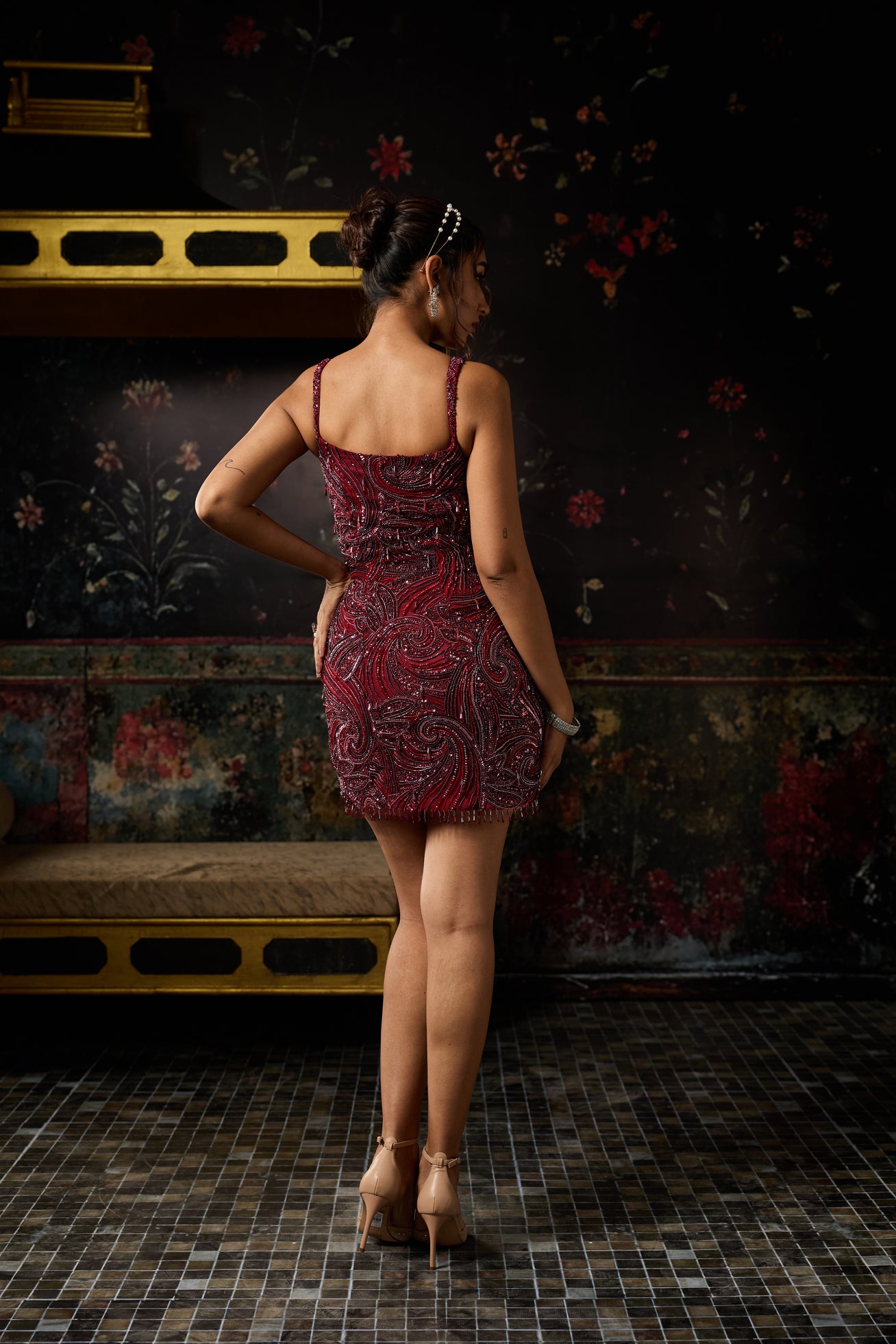 Maroon Mix Material Embellished Mini Dress With Tassels Detail