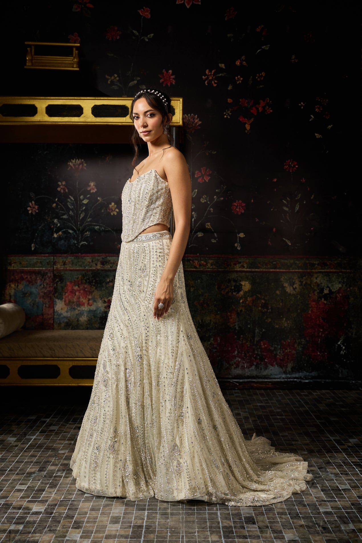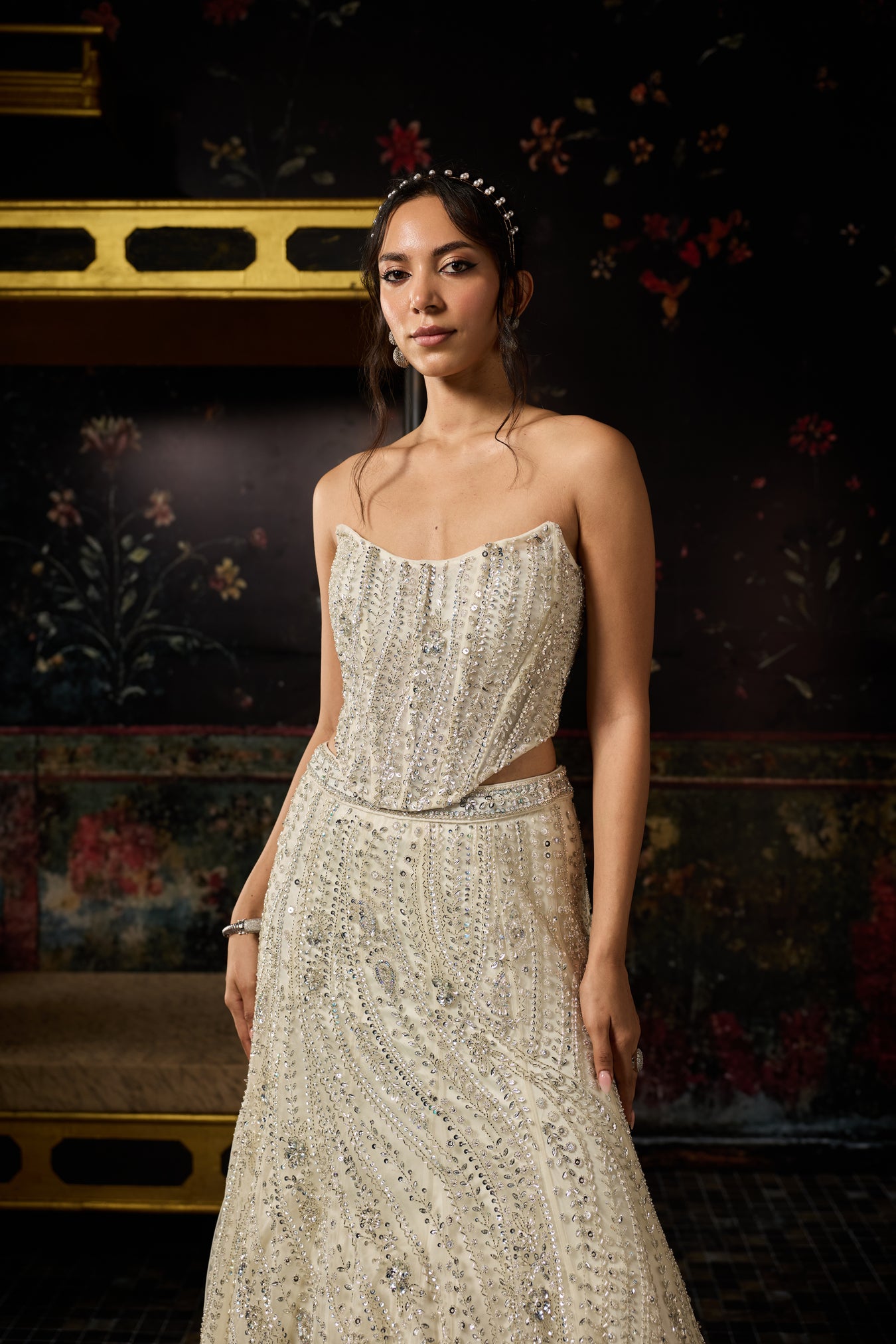 Silver Floral Swirl Embellished Corset With Embellished Long Trail Mermaid Lehenga Skirt