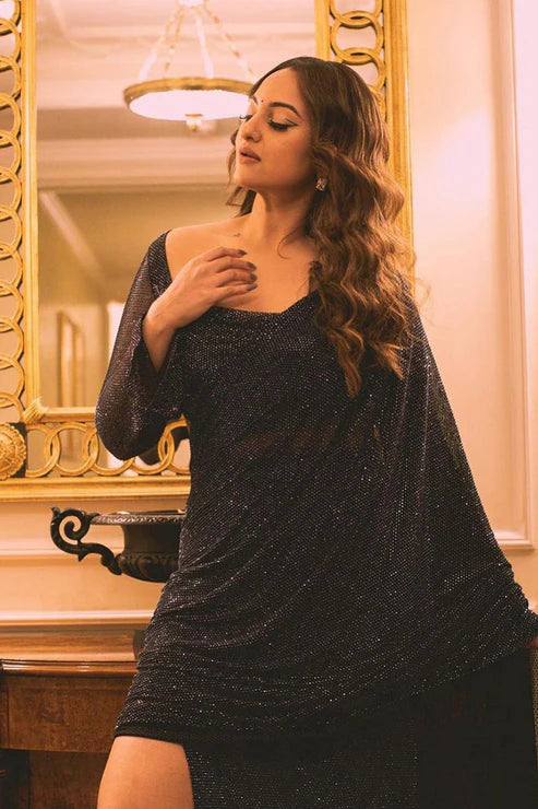 Embellished Pleated Full Sleeves Top Paired With Slit Skirt and Detachable Drape
