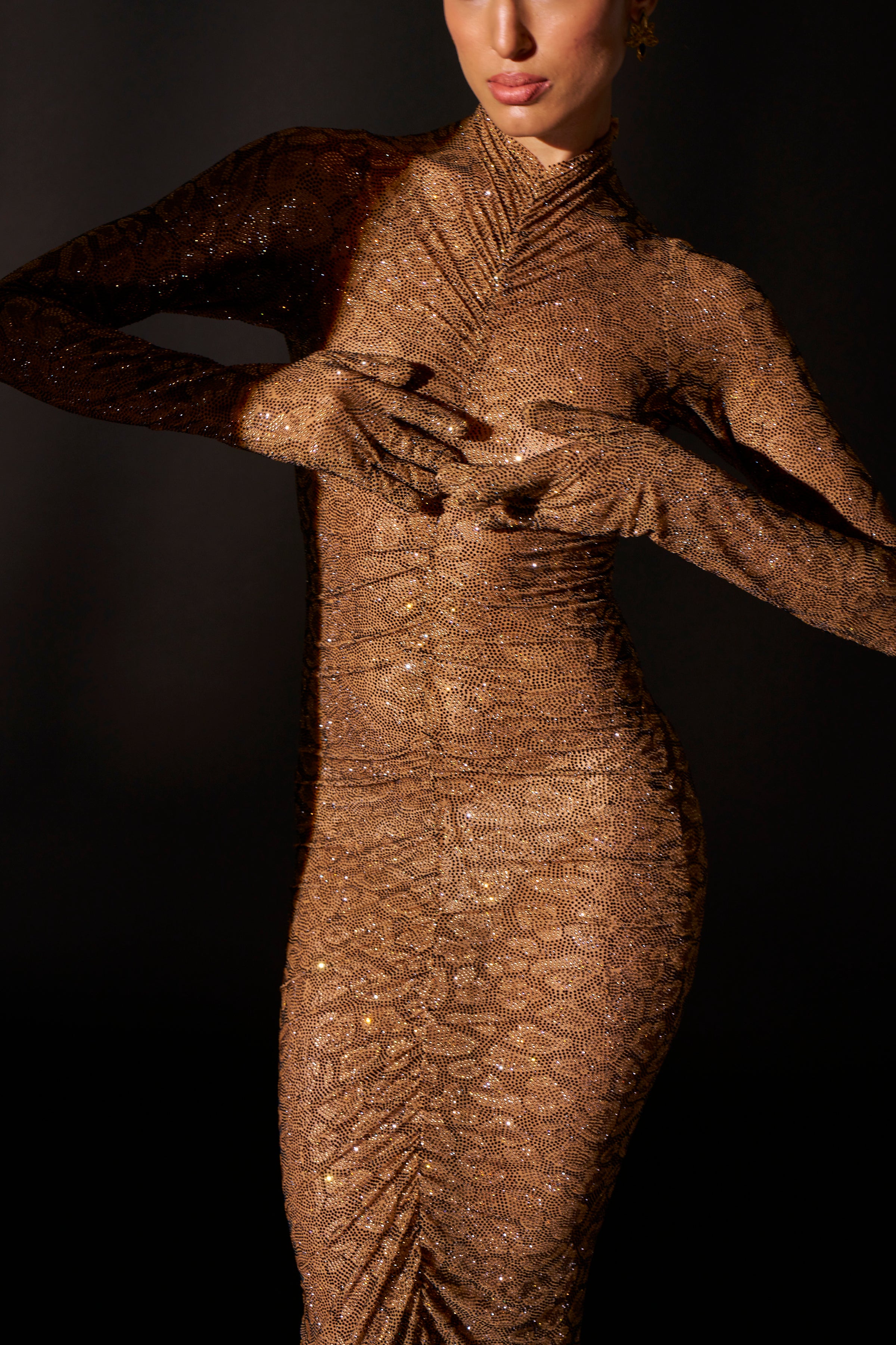 A leopard print high neck ruched gown with glove sleeves is a fierce and glamorous choice. the gown features a chic high neckline that adds a touch of elegance, while the leopard print brings out your wild side. the ruched detailing hugs your curves in all the right places, giving you a flattering and confident look