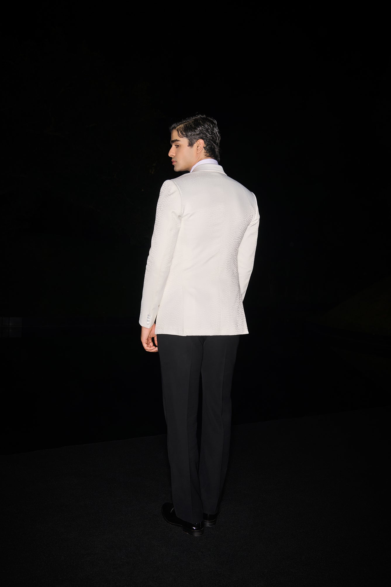 A classic off-white leatherite textured tuxedo, paired with a bowtie, shirt and pants