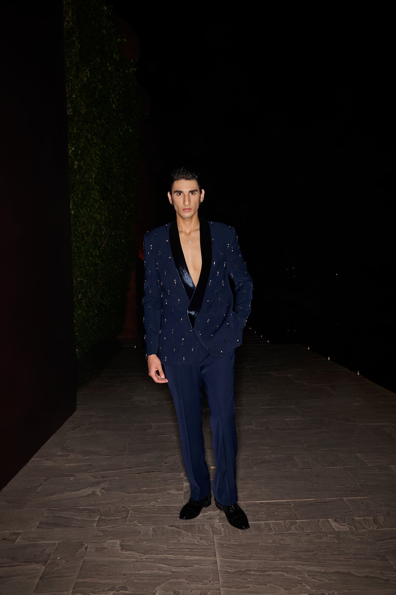 An elegant tuxedo intricately embellished with cascading crystal and stone hangings, paired with tailored pants