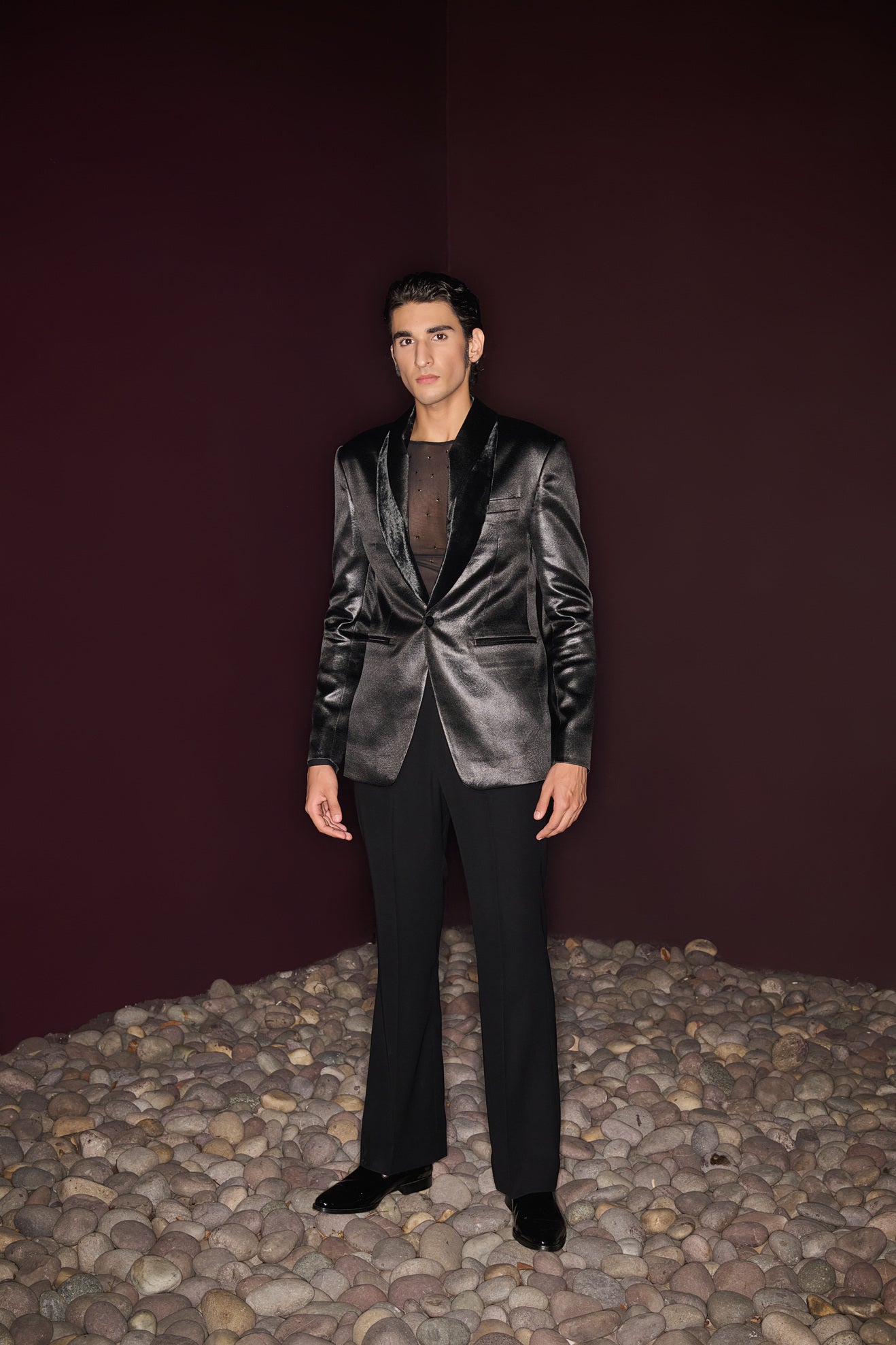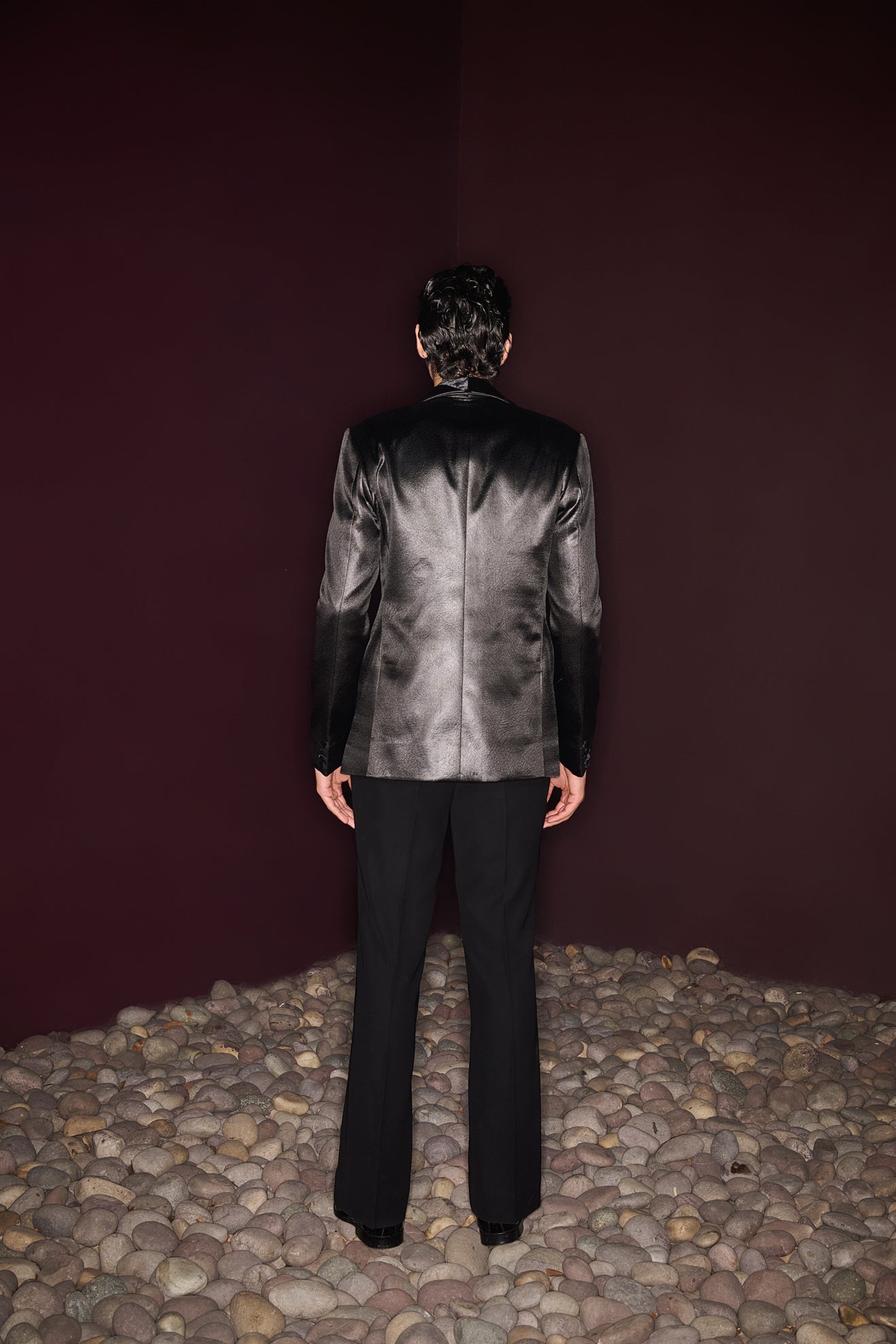 An all-black leatherite textured tuxedo showcasing innovative tailored lapel, paired with matching black pants