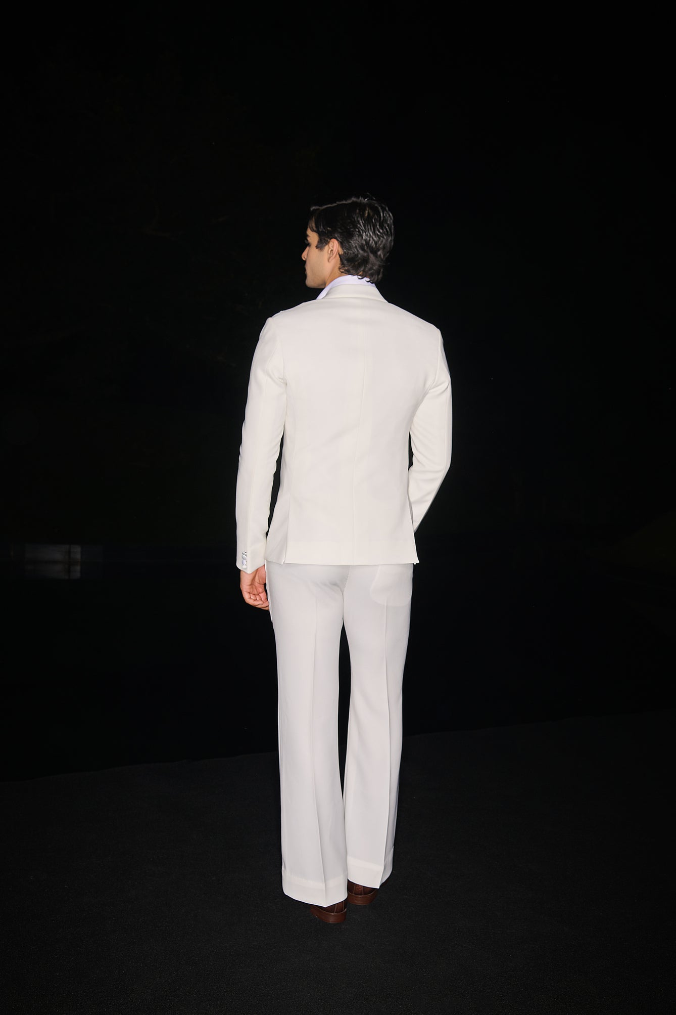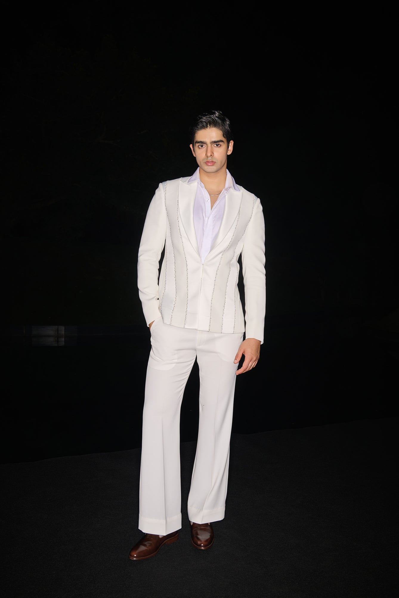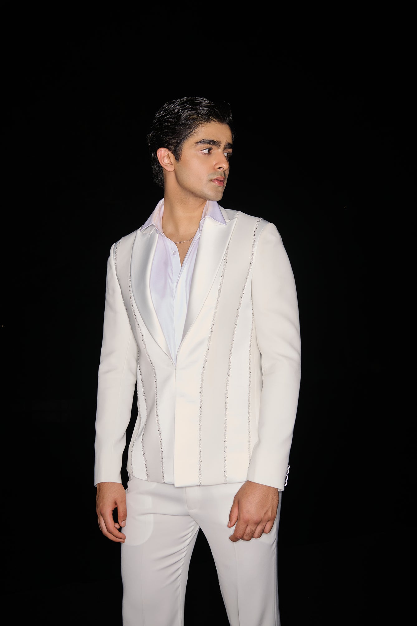 An elegant off-white embroidered panelled tuxedo adorned with intricate crystal and cutdana embellishments, paired with shirt and pants