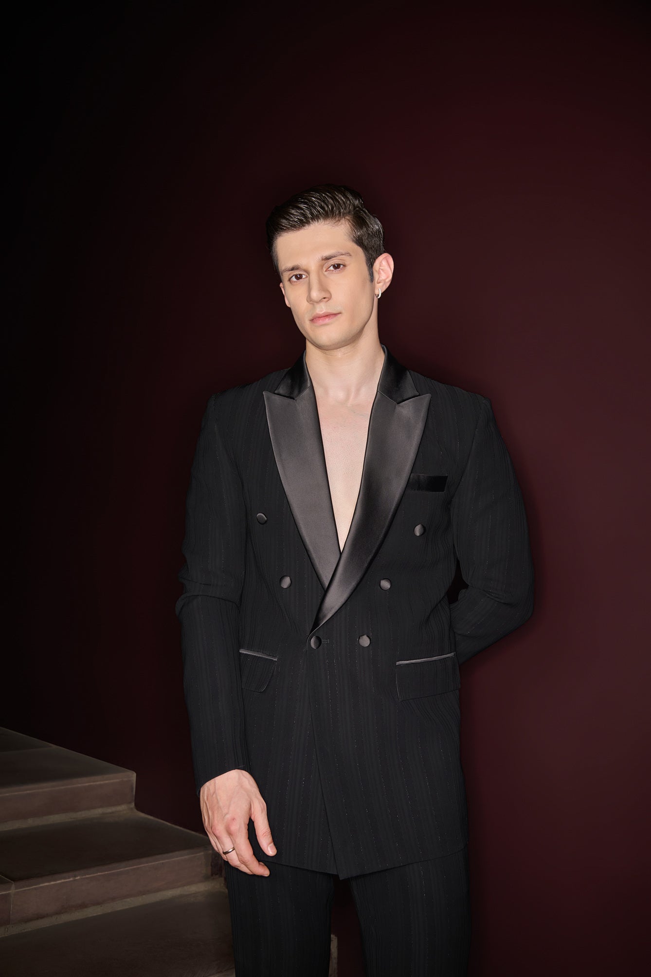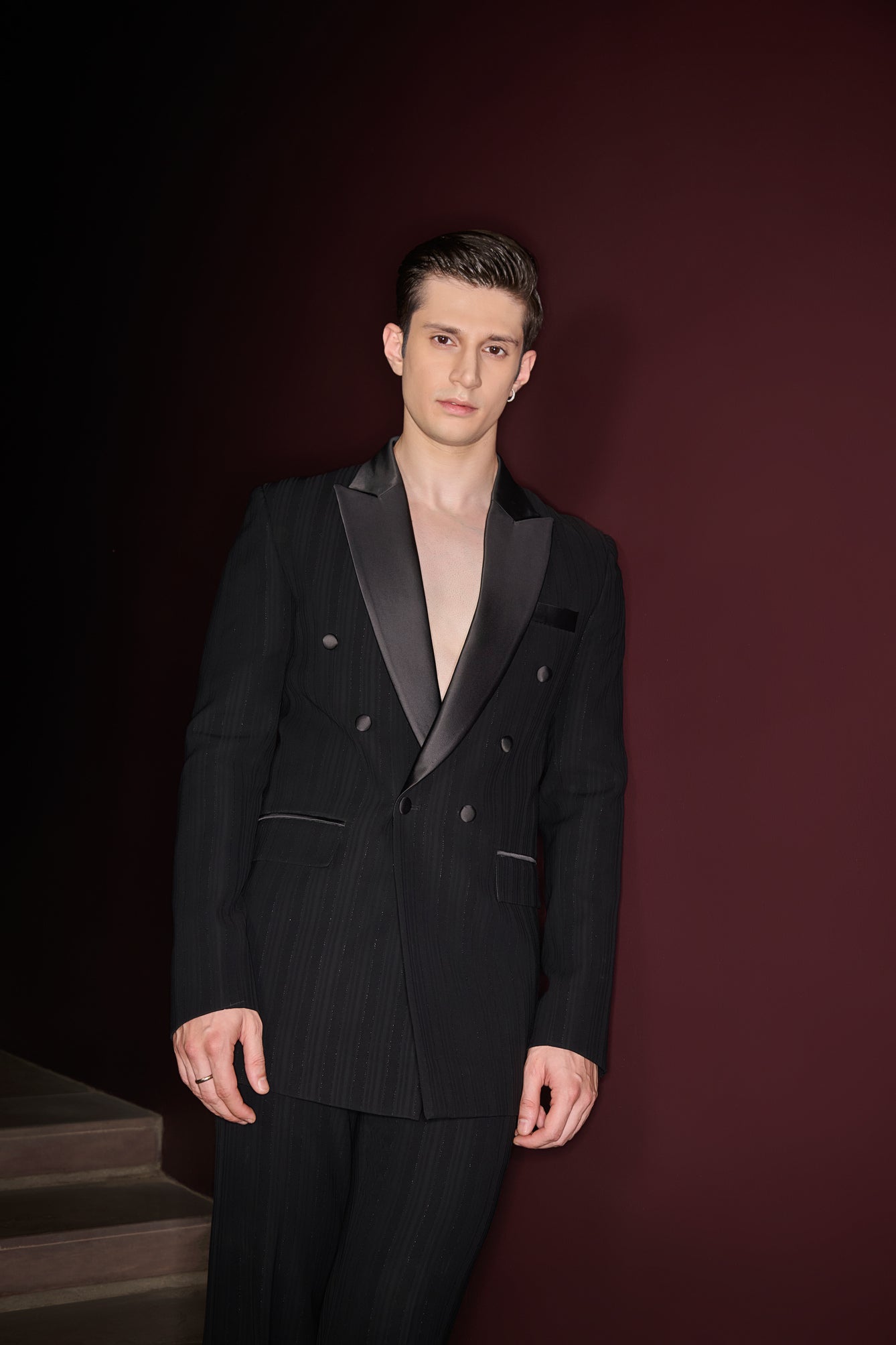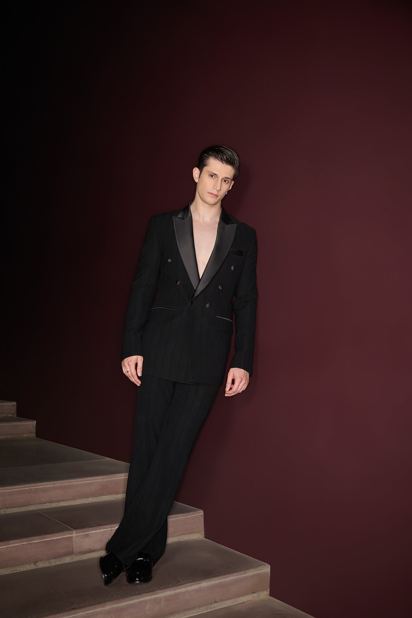 Classic double-breasted black tuxedo accented with luxurious velvet lapel, paired tailored pants