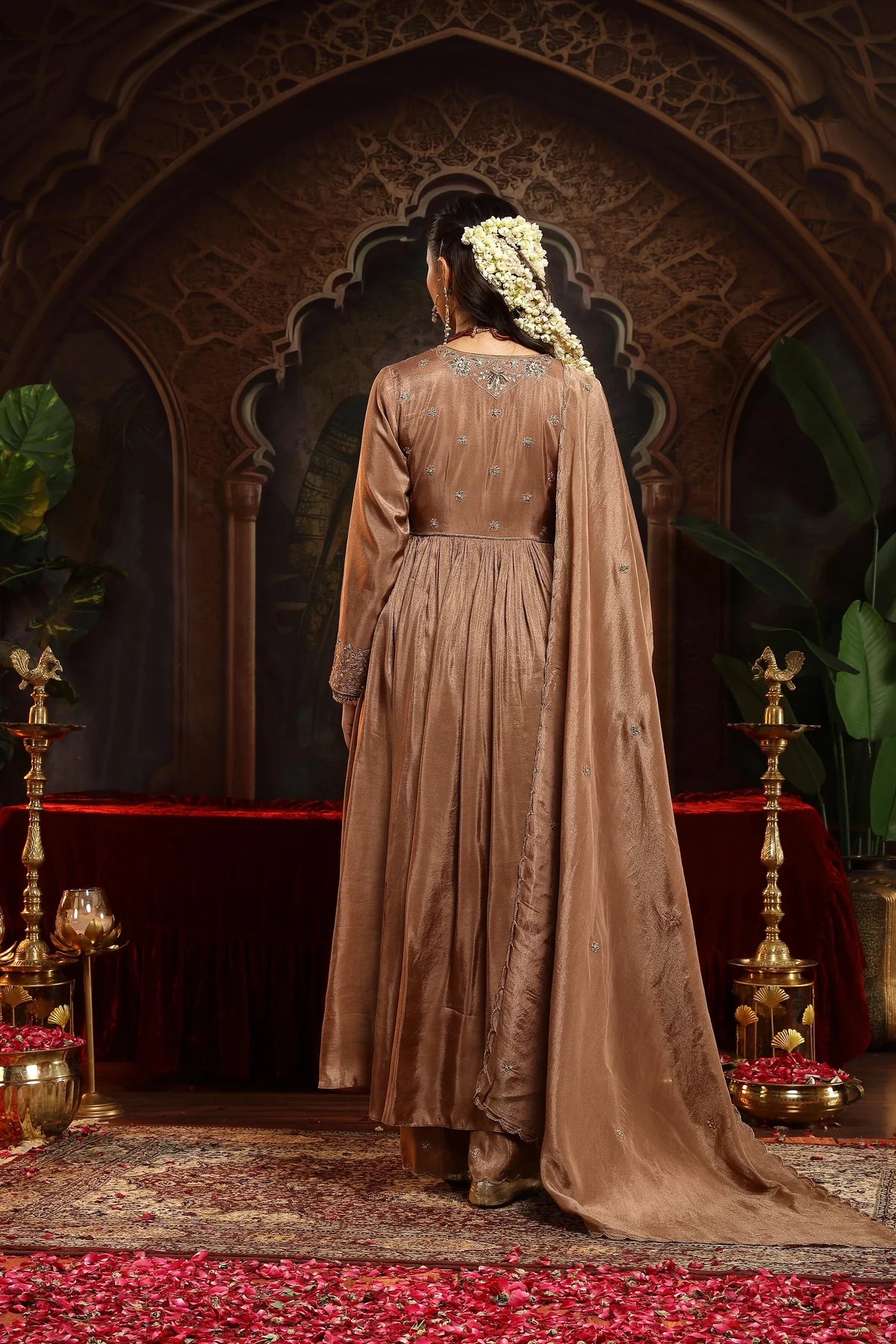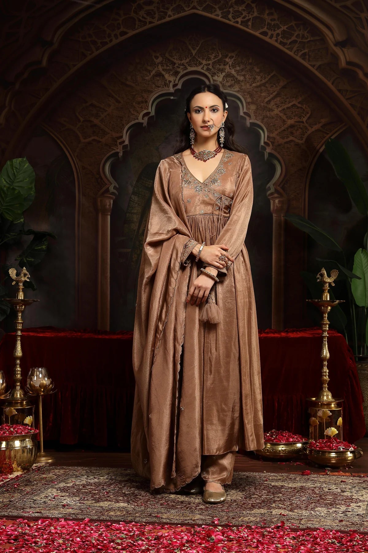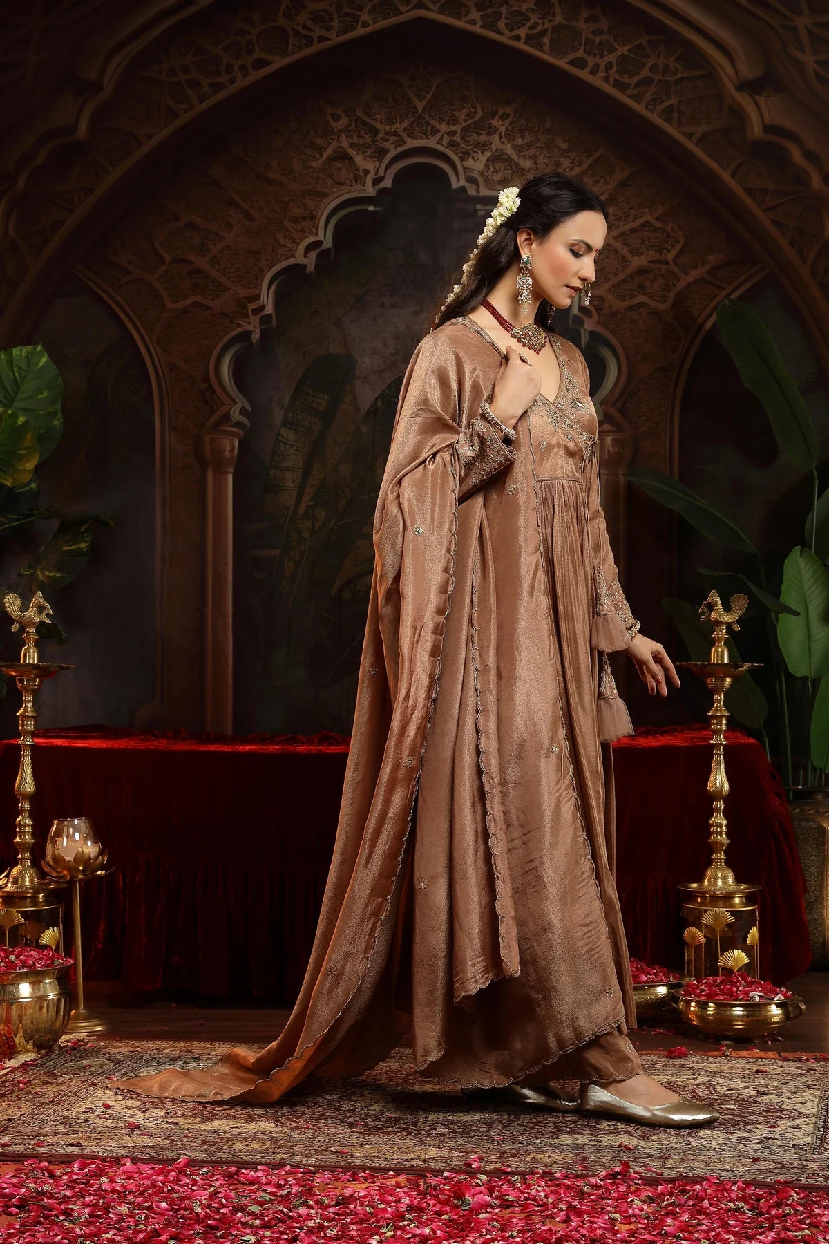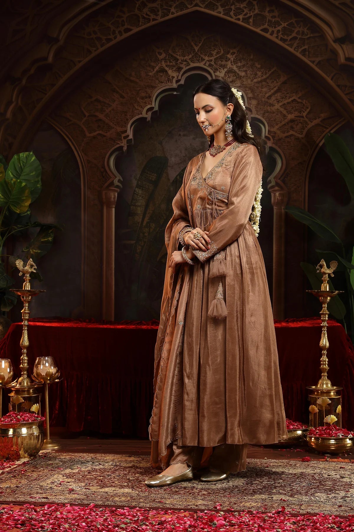 This exquisite Angrakha short Anarkali set is a perfect blend of traditional charm and contemporary elegance. The zardozi embroidery on the yoke and sleeves adds a regal touch, elevating the intricate craftsmanship of this ensemble. The chunnat at the waist defines the silhouette, enhancing the waistline beautifully, while the tassels add a playful yet sophisticated element to the design.Paired with a palazzo that features delicate embroidery along the hem.