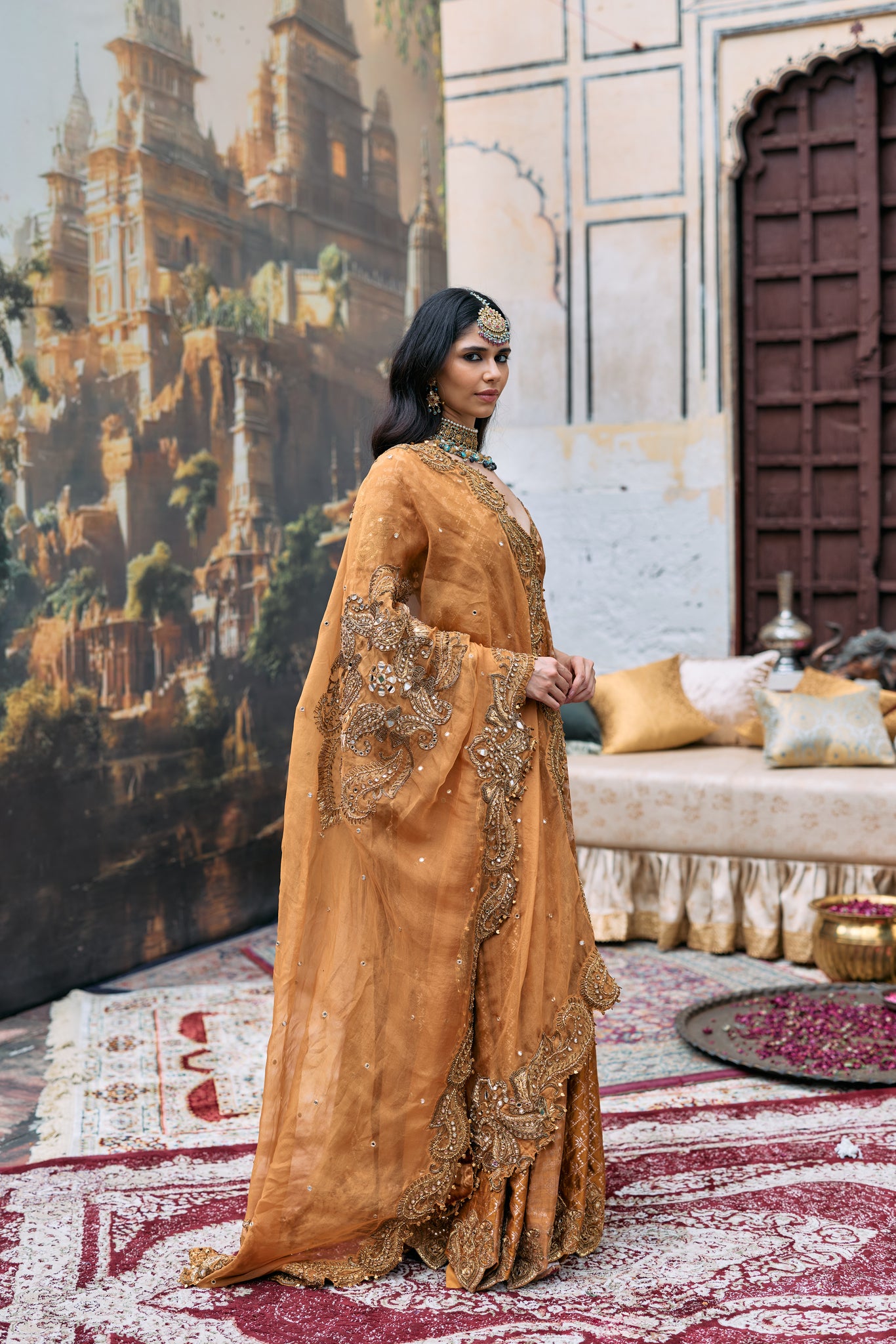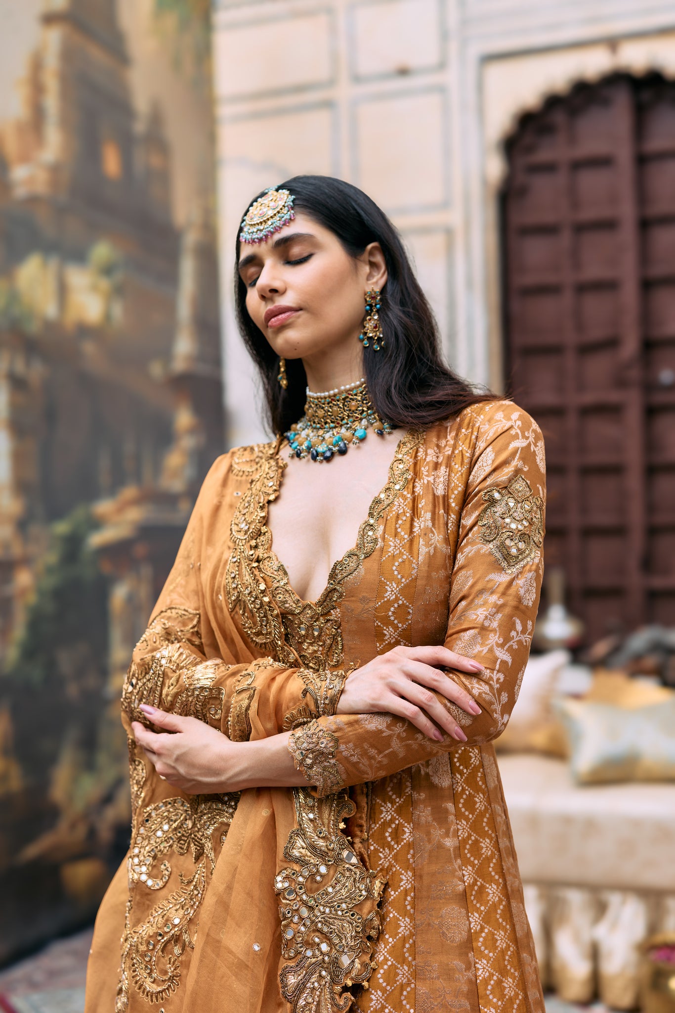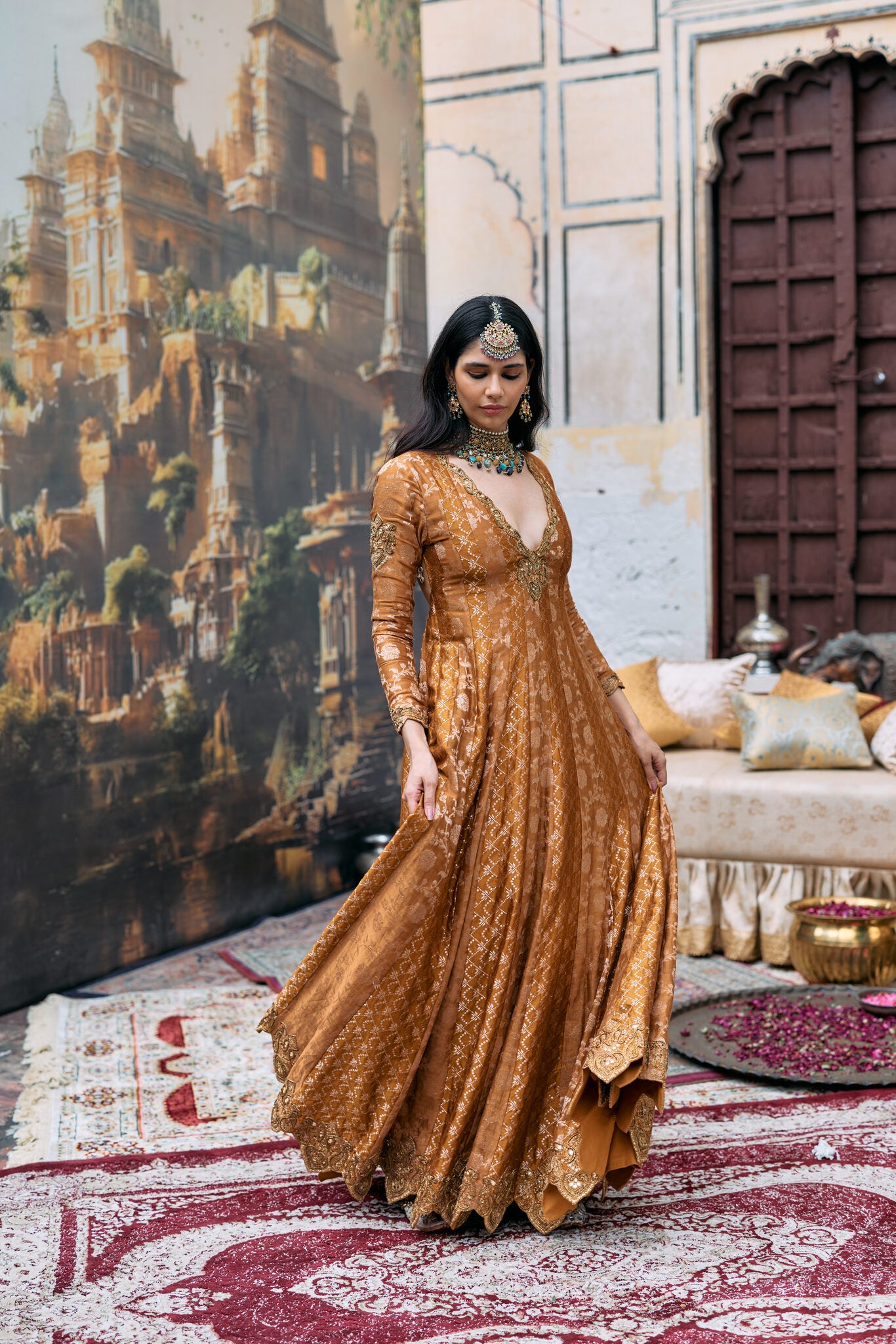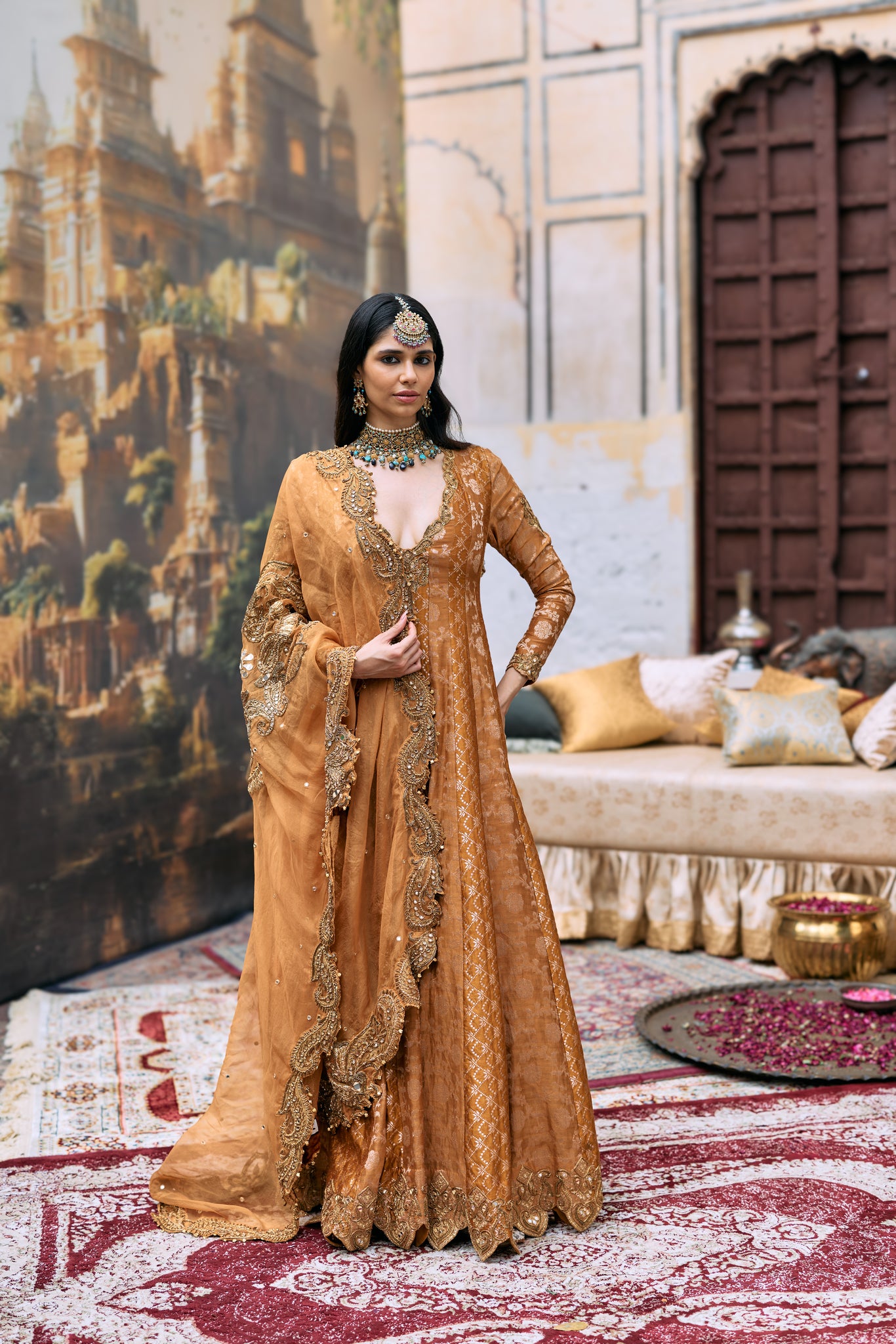 A floor-length scallop anarkali embellished with Mughal-inspired motifs, exuding an old-world charm and richness, paired with a churidar and a heavy embroidered scallop dupatta.