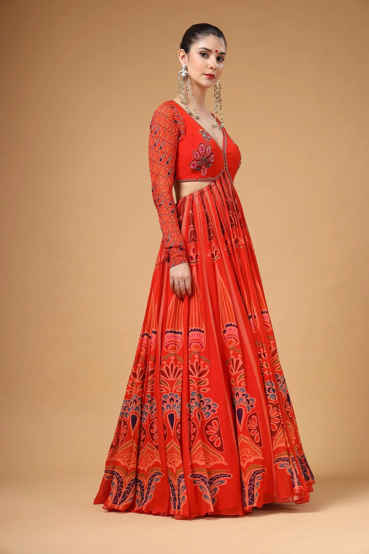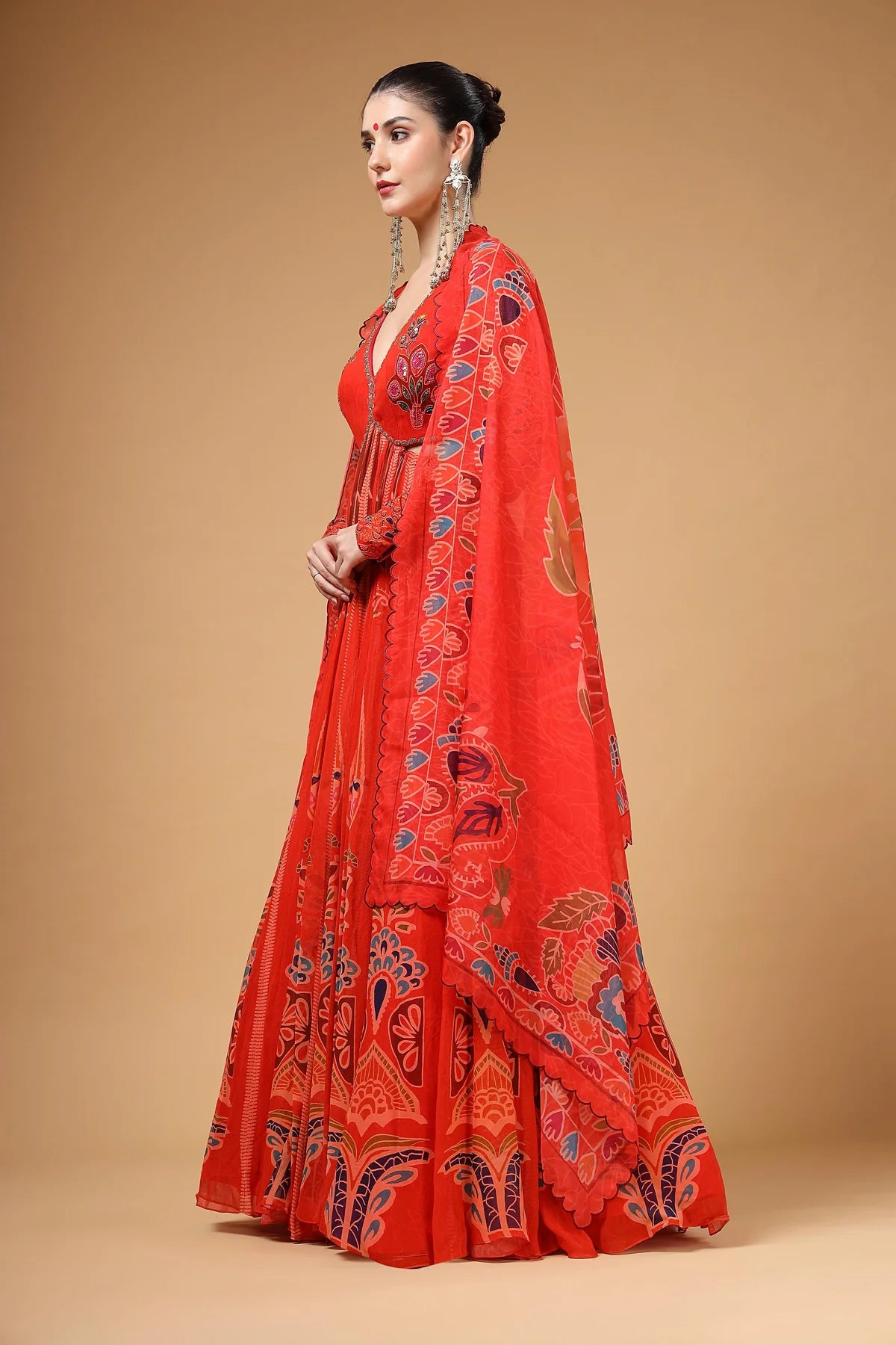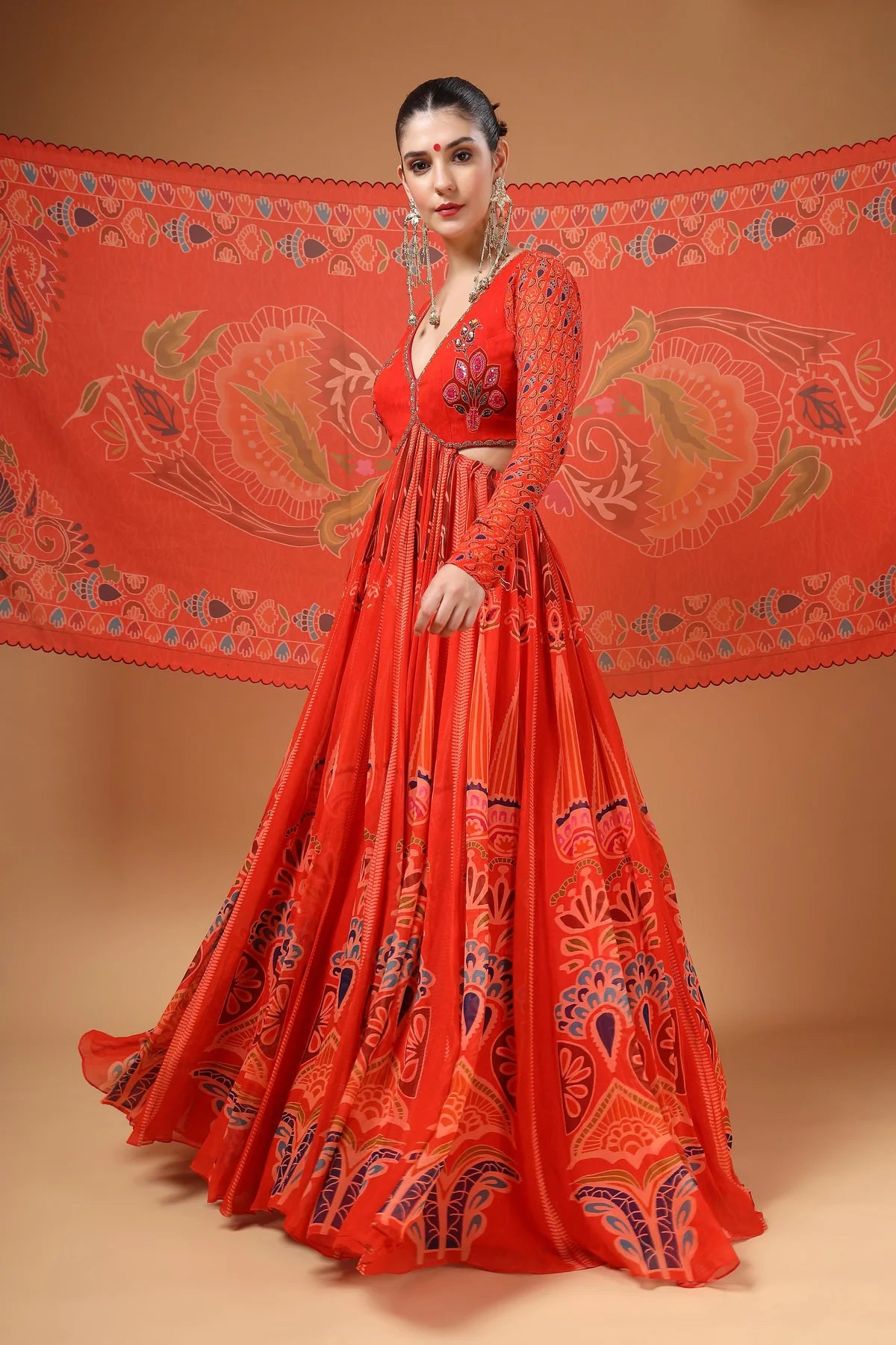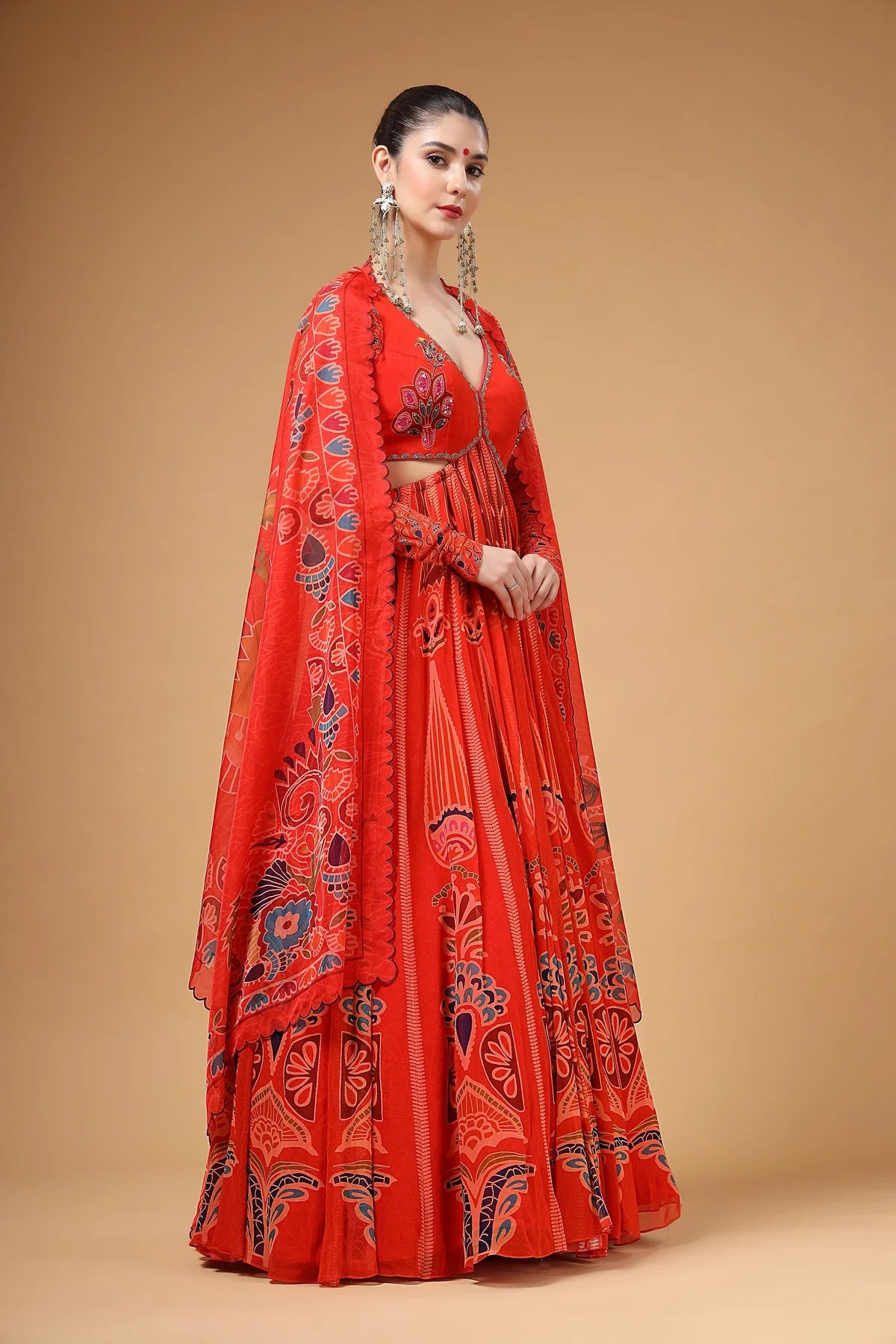 A stunning red printed backless Anarkali paired with a delicate organza dupatta. The yoke features intricate hand-embroidered buttas, complemented by elegant churidar sleeves for a refined look. The back is designed with adjustable tie-up strings, allowing for a perfect fit while adding a stylish touch.