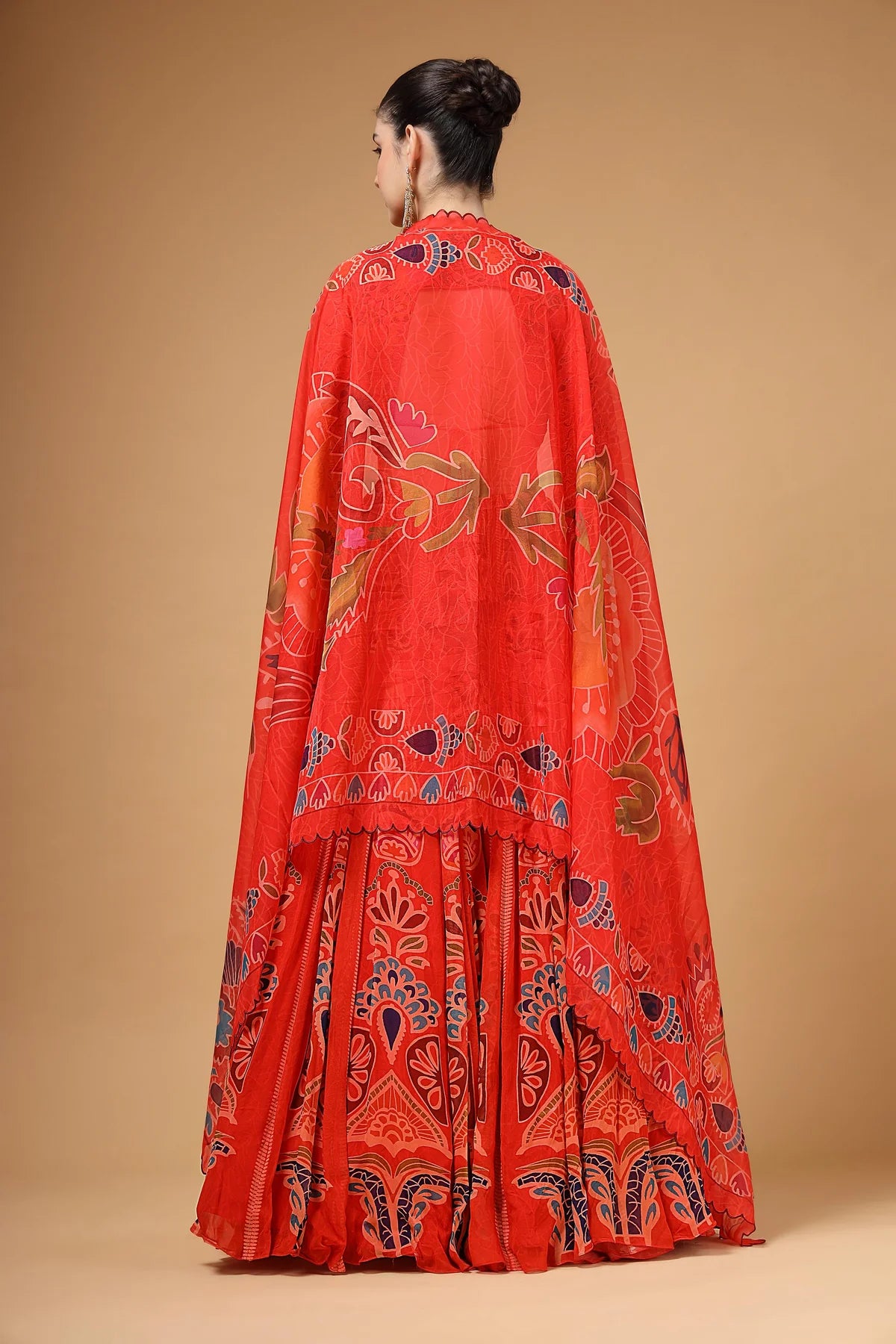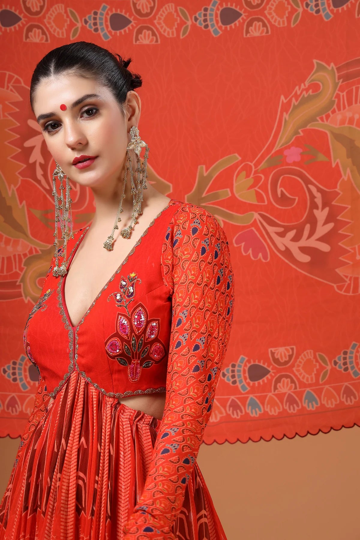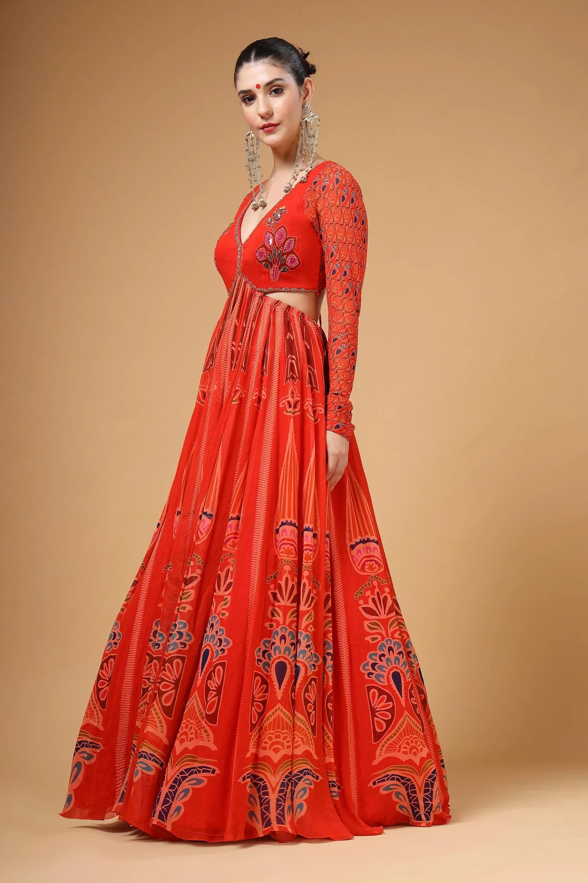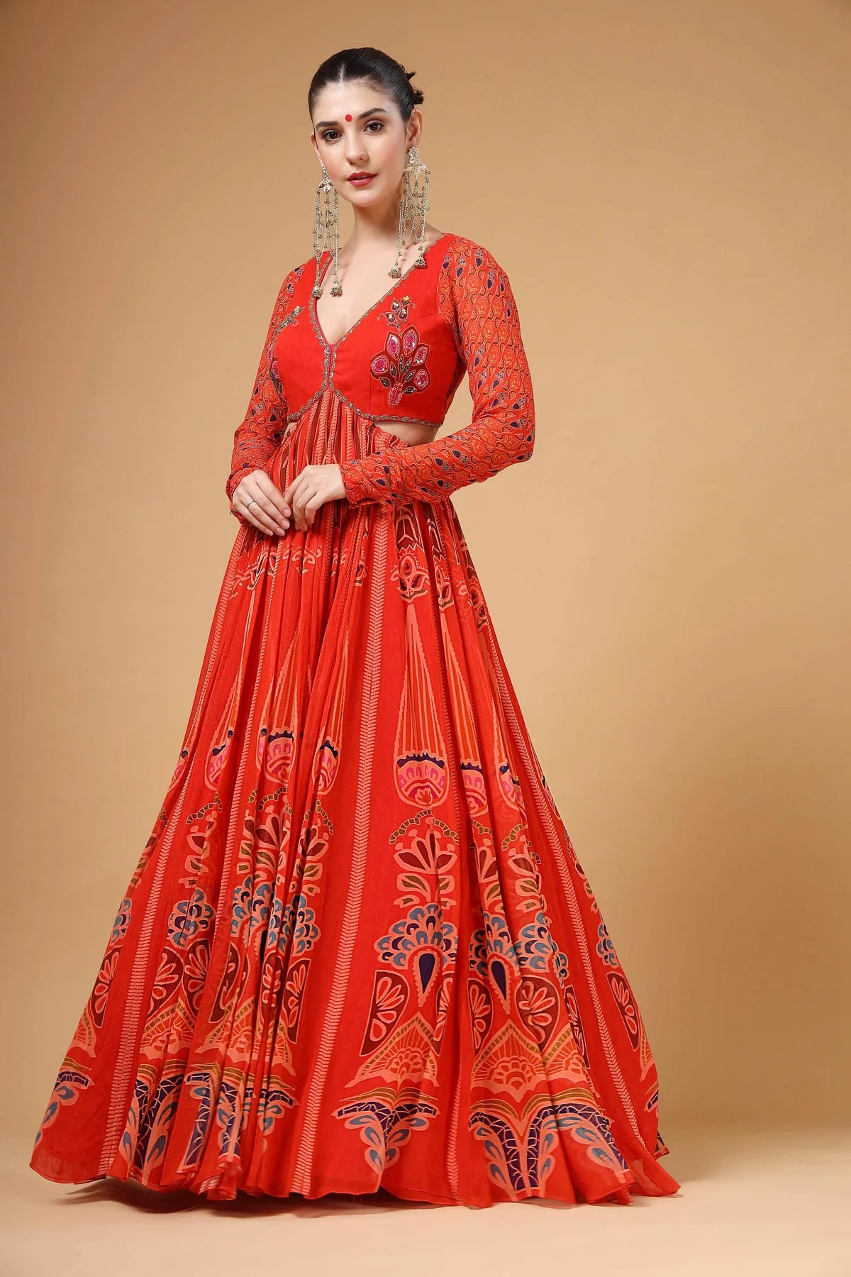 A stunning red printed backless Anarkali paired with a delicate organza dupatta. The yoke features intricate hand-embroidered buttas, complemented by elegant churidar sleeves for a refined look. The back is designed with adjustable tie-up strings, allowing for a perfect fit while adding a stylish touch.