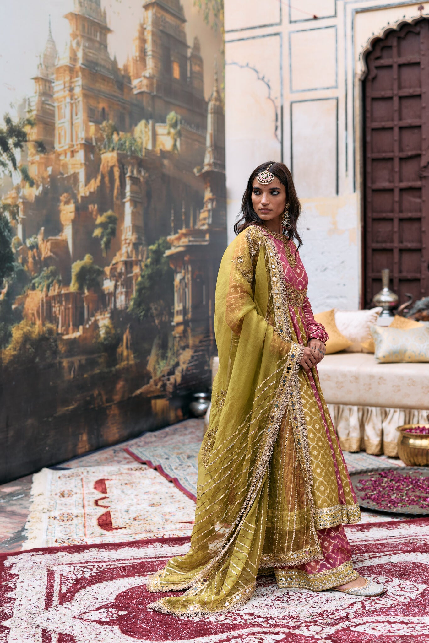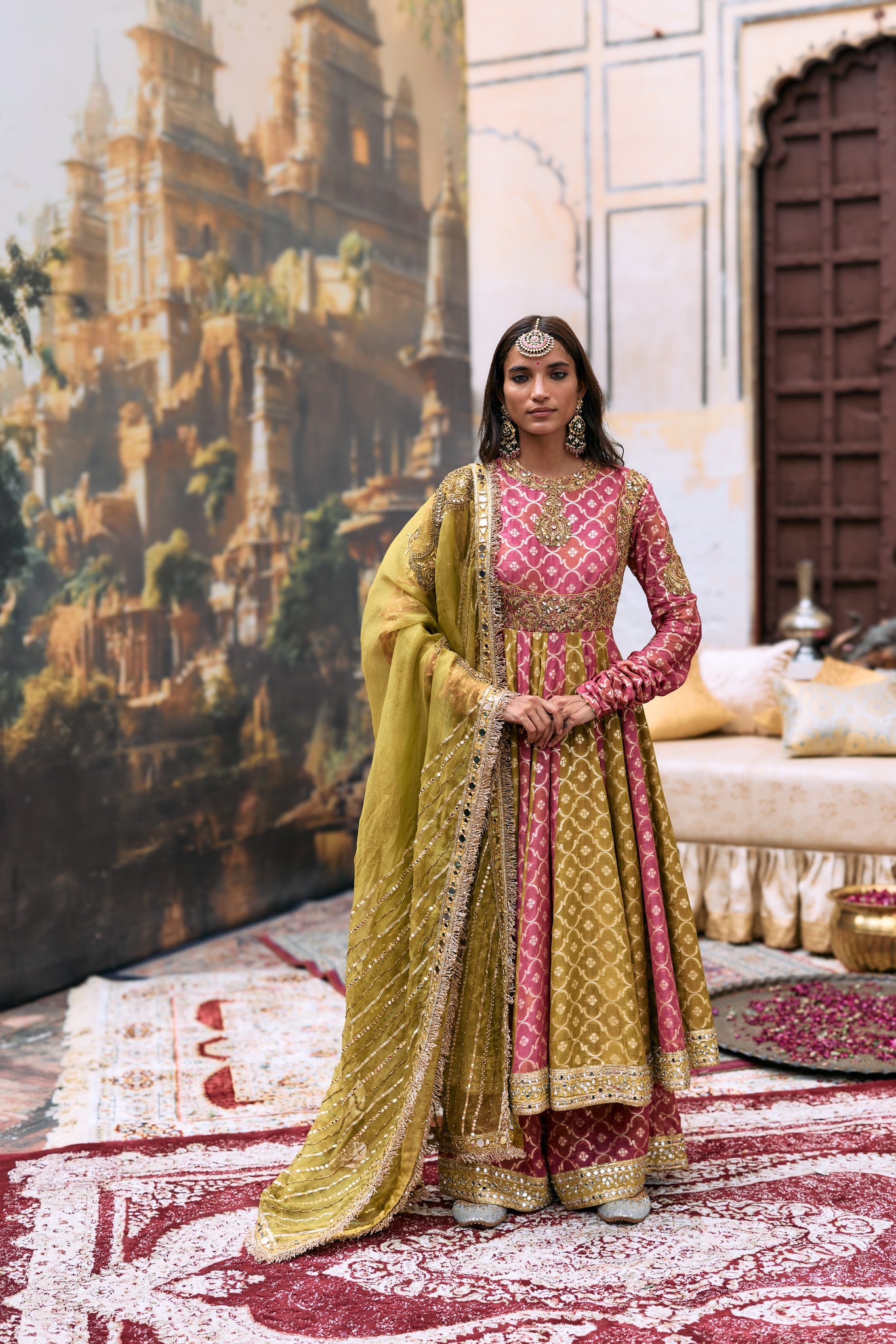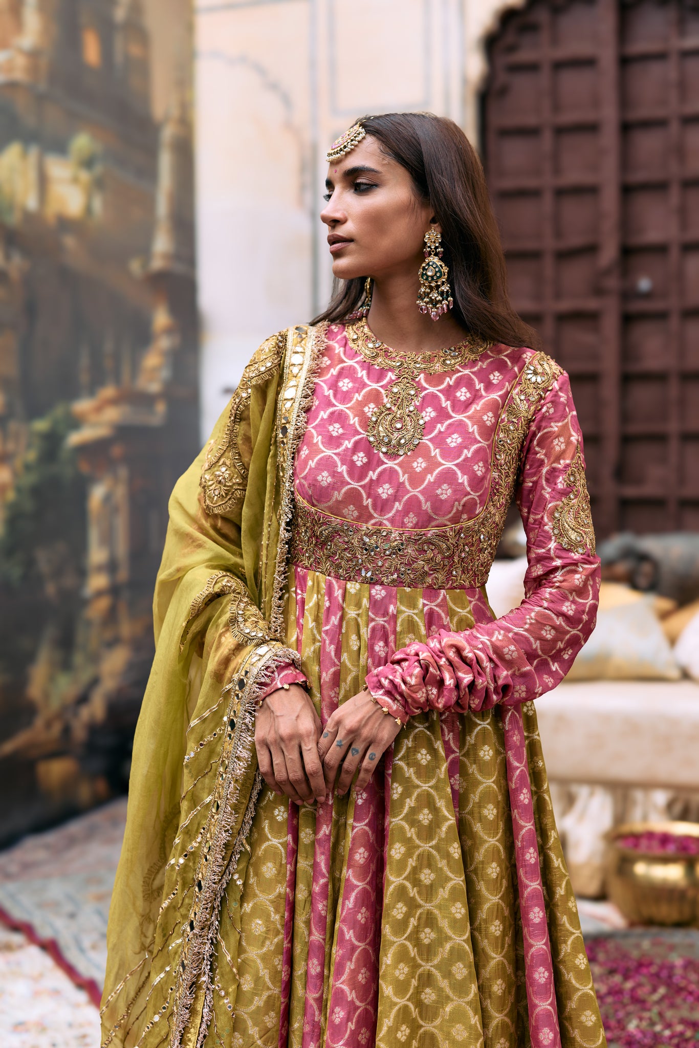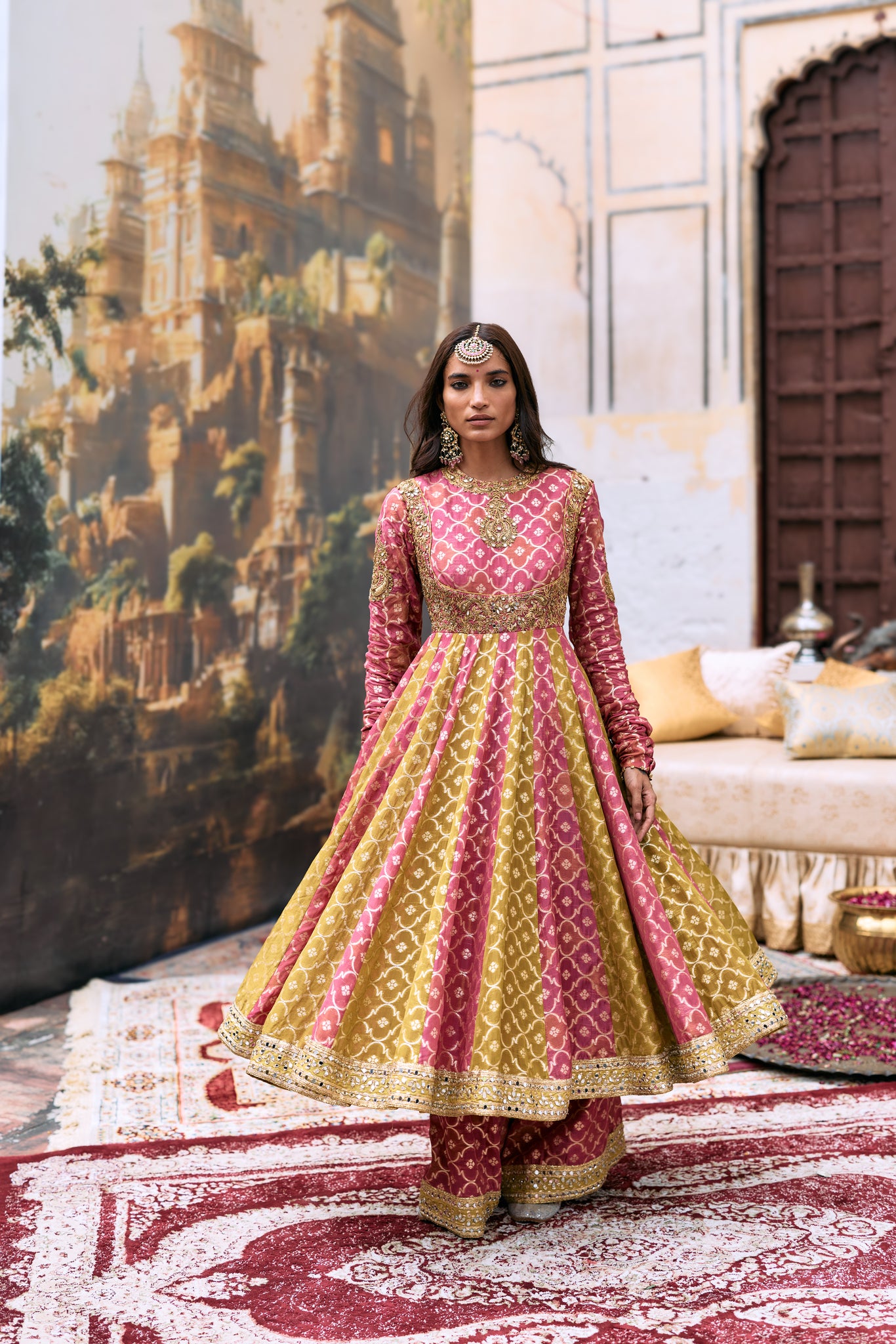 A kothi-blouse style anarkali adorned with antique embroidery, paired with wide leg pants and a heavy embroidered dupatta.