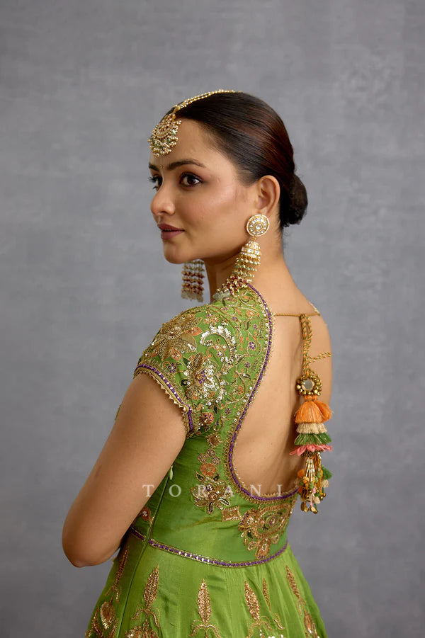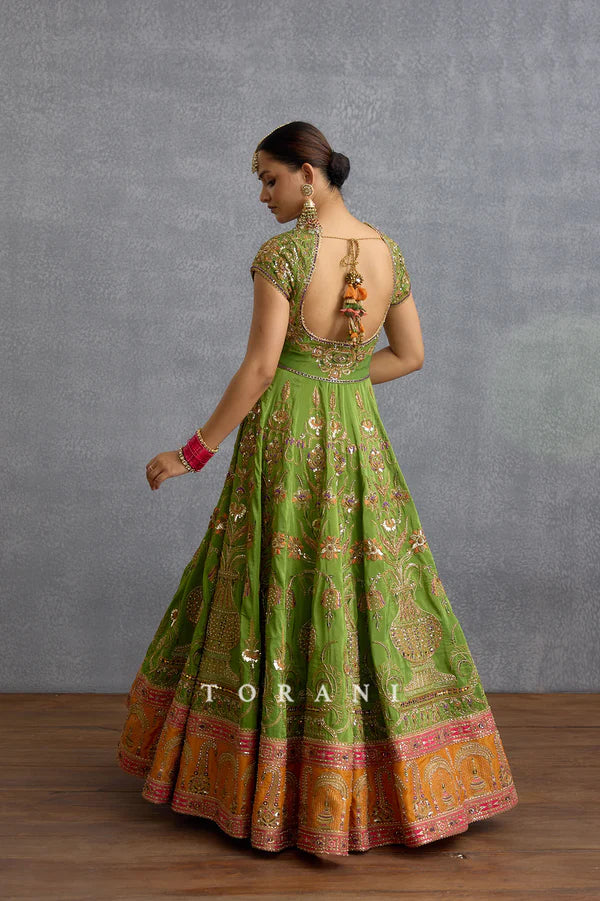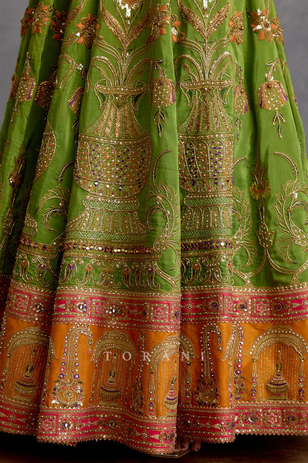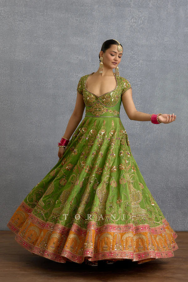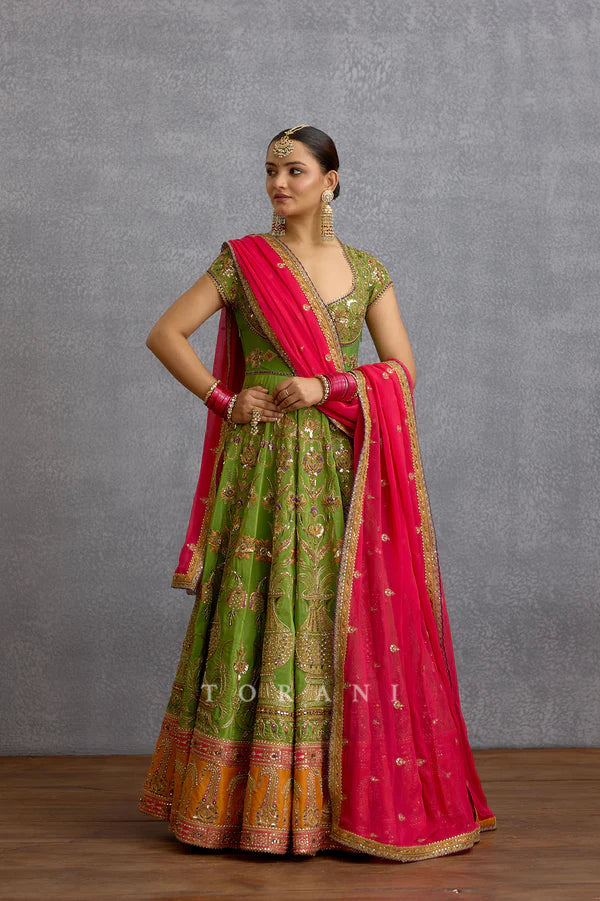 The Zunairah Naureen Anarkali Set is crafted with luxurious shimmer organza and cotton silk fabric in a gorgeous lime green shade, with intricately embroidered classic Indian motifs. The grace of this set originates from the Mughal art-inspired motifs, the orange and pink-toned broad border, and the graceful green and coral pink shade of the anarkali and odhni- making this a truly one-of-a-kind find for your festive moments.