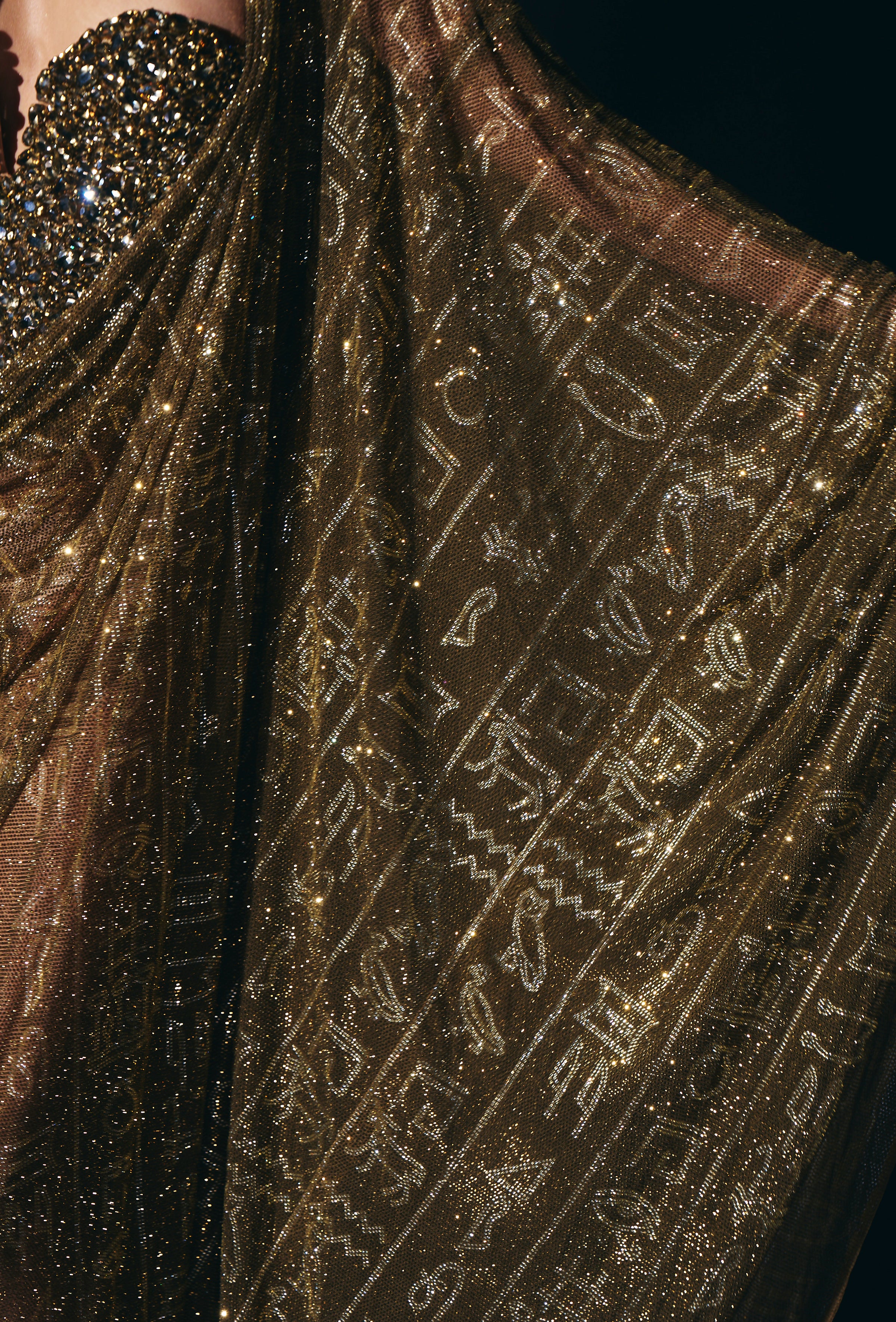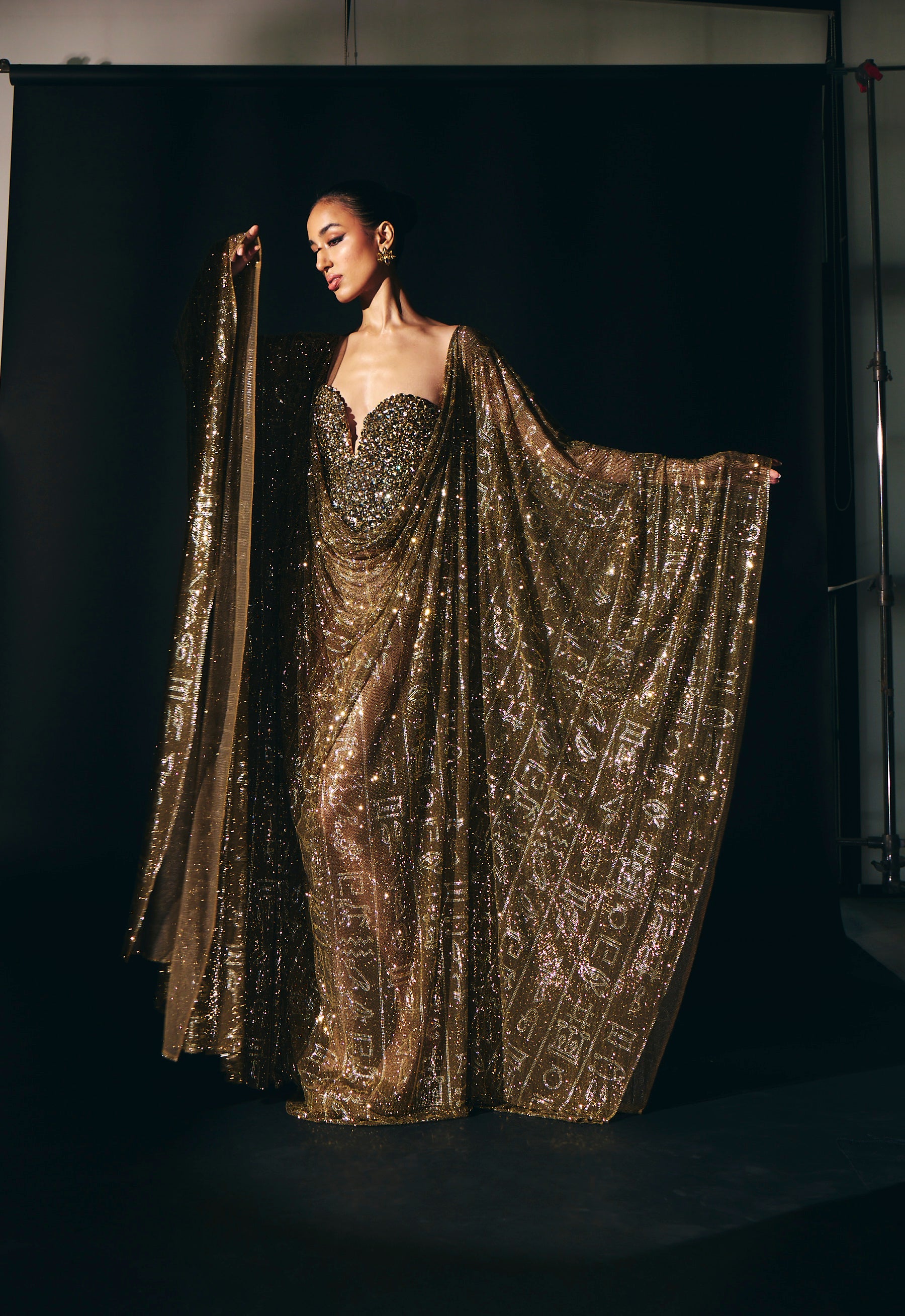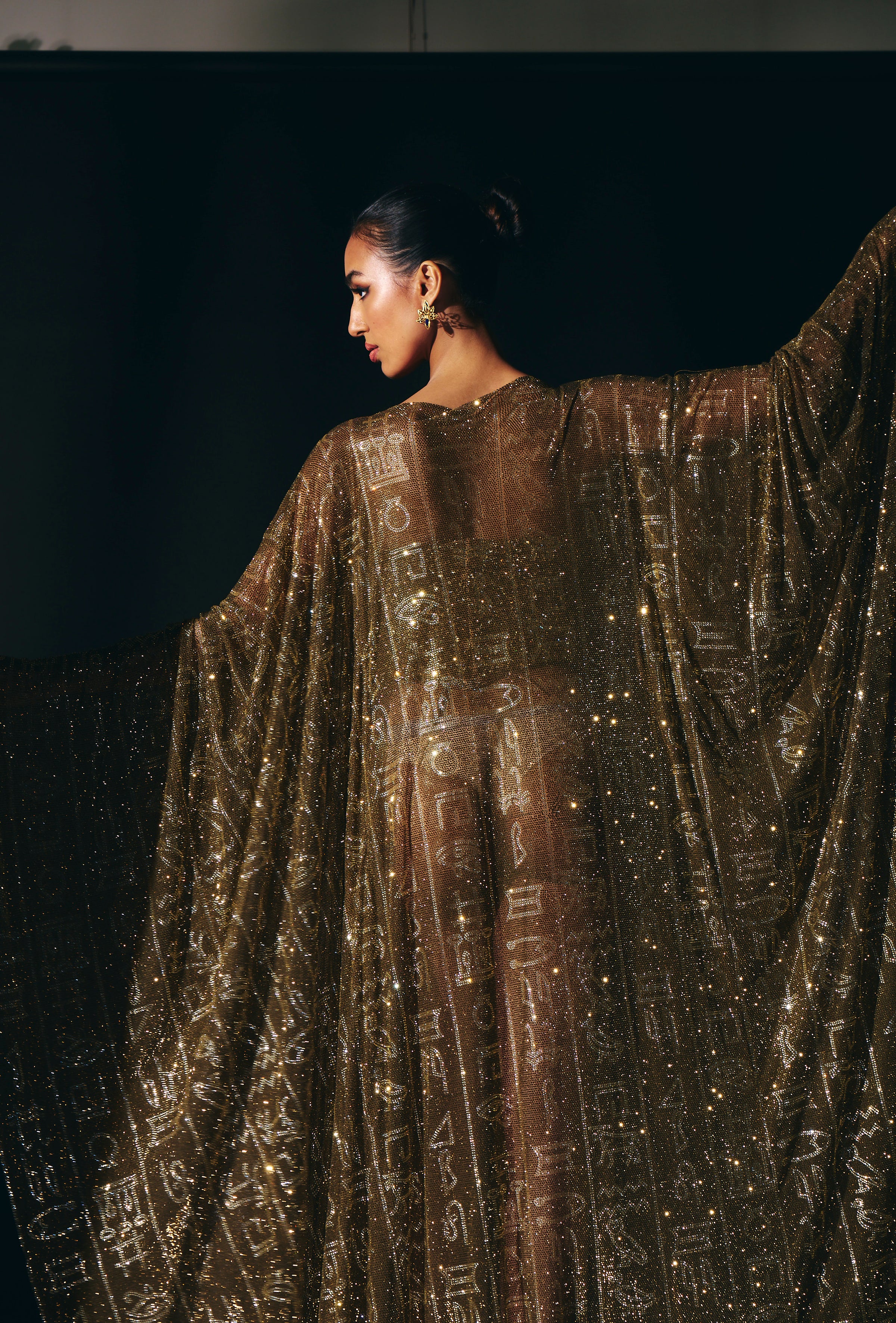This stunning kaftan features intricate hieroglyphic crystal embellishments. paired with a gold jewel corset , adorned with dazzling big crystals, radiates glamour and allure, drawing eyes with its captivating sparkle